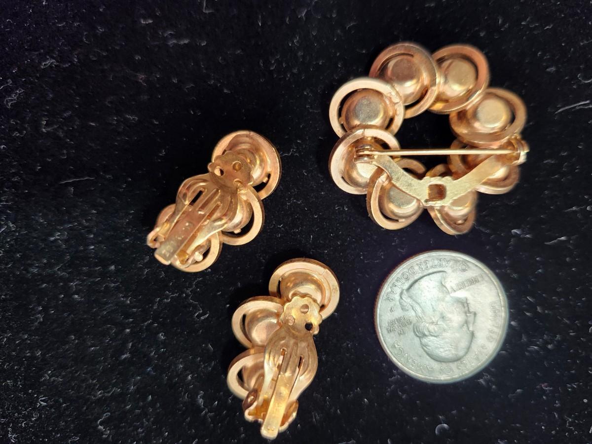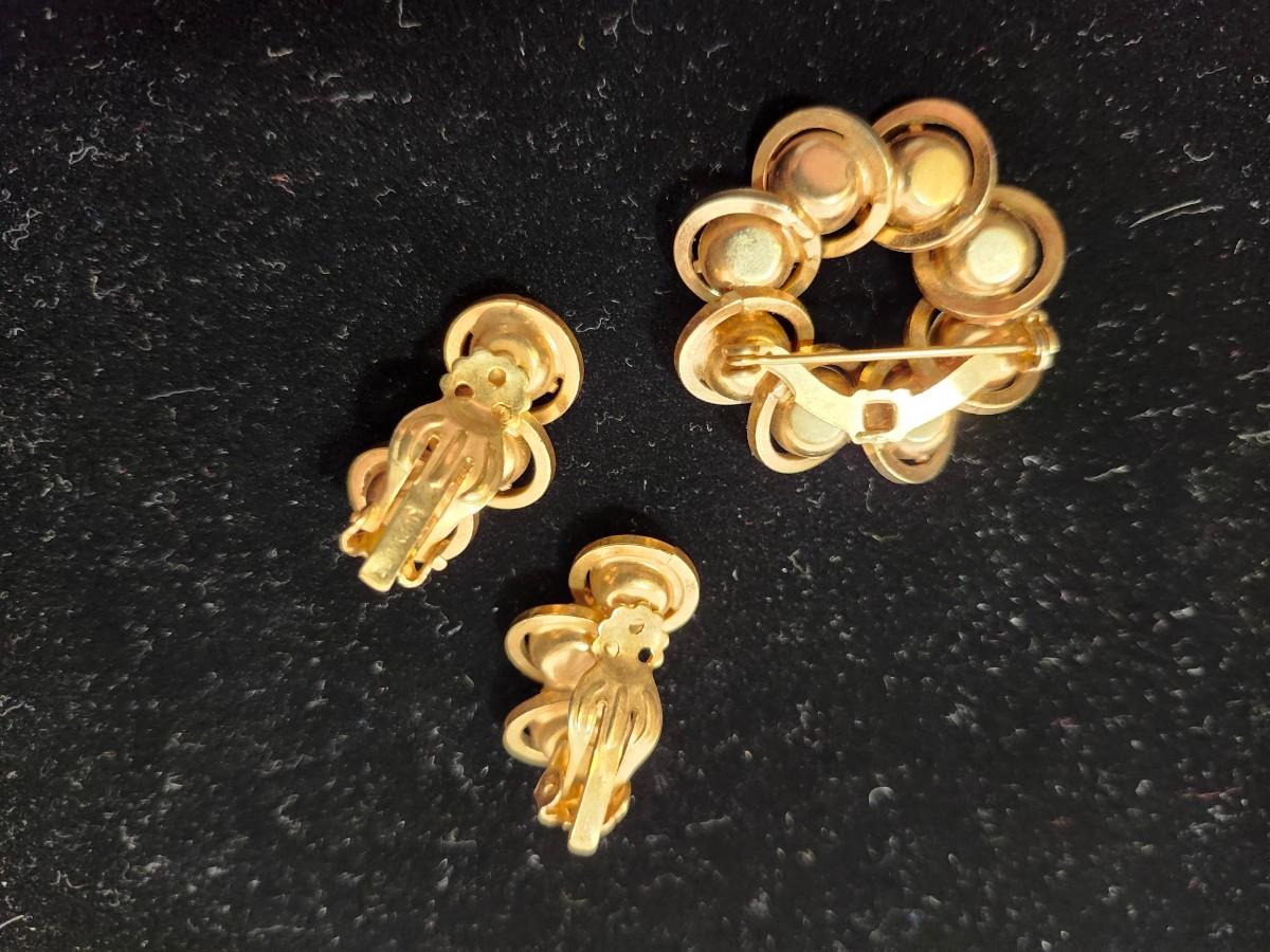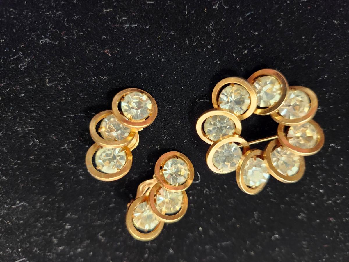 Circle Brooch and matched earrings, mid-century, crystal wreath design.