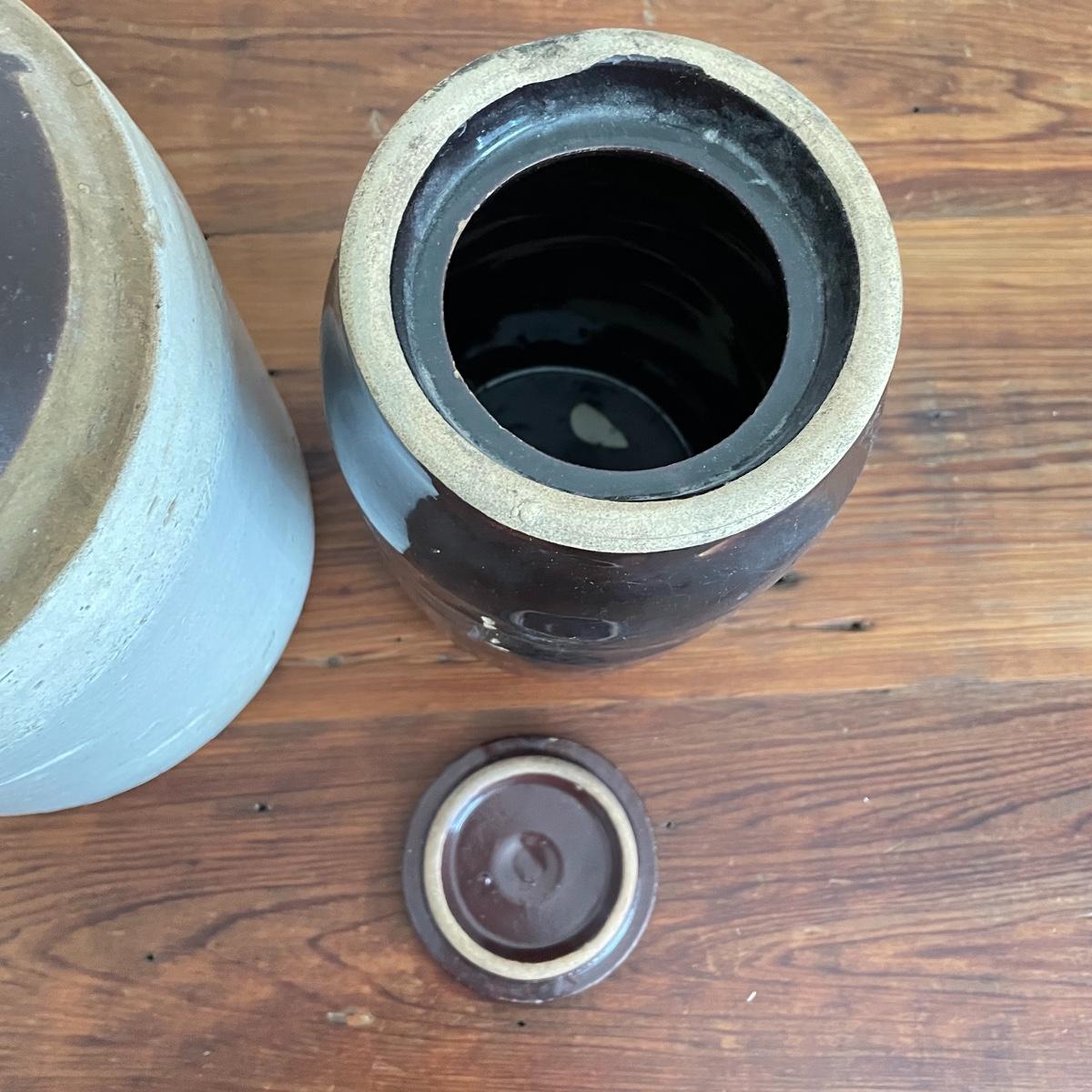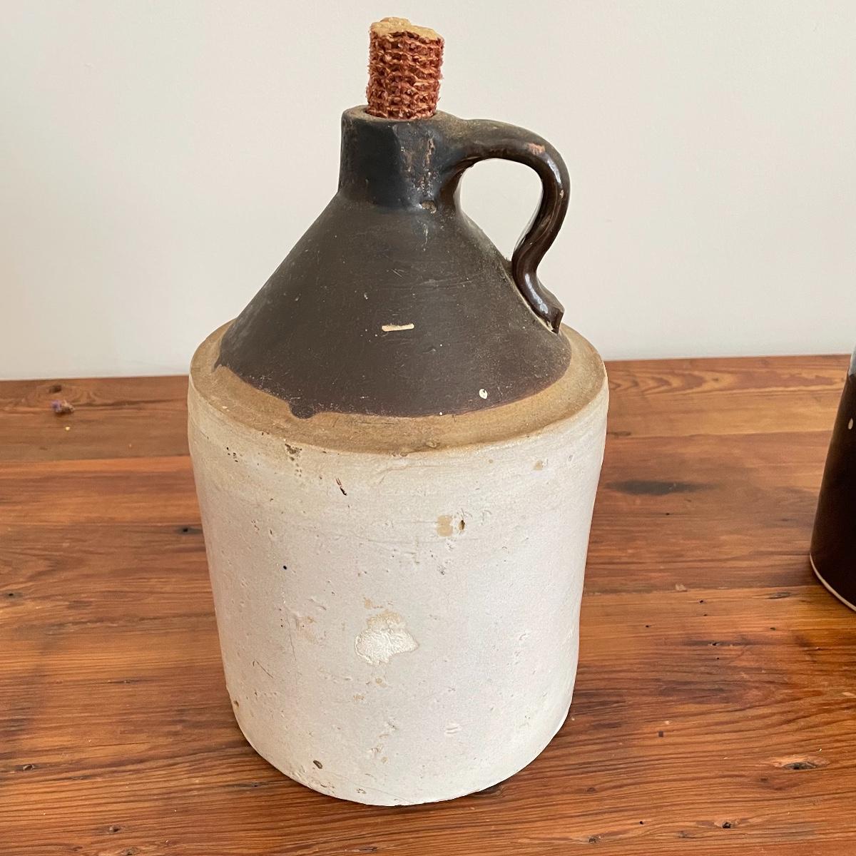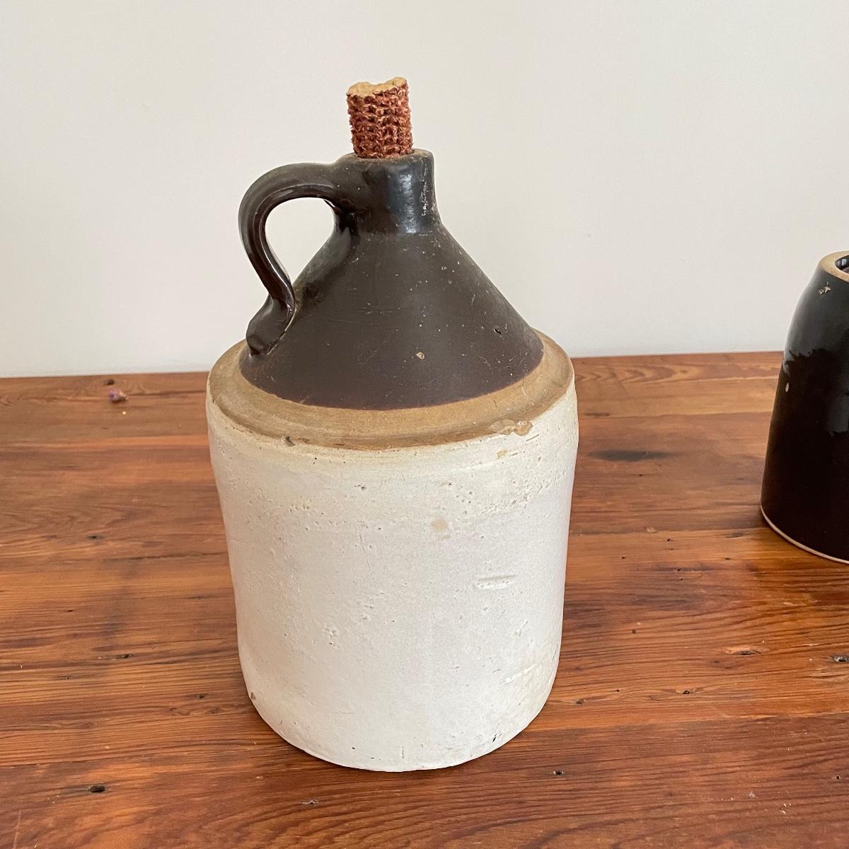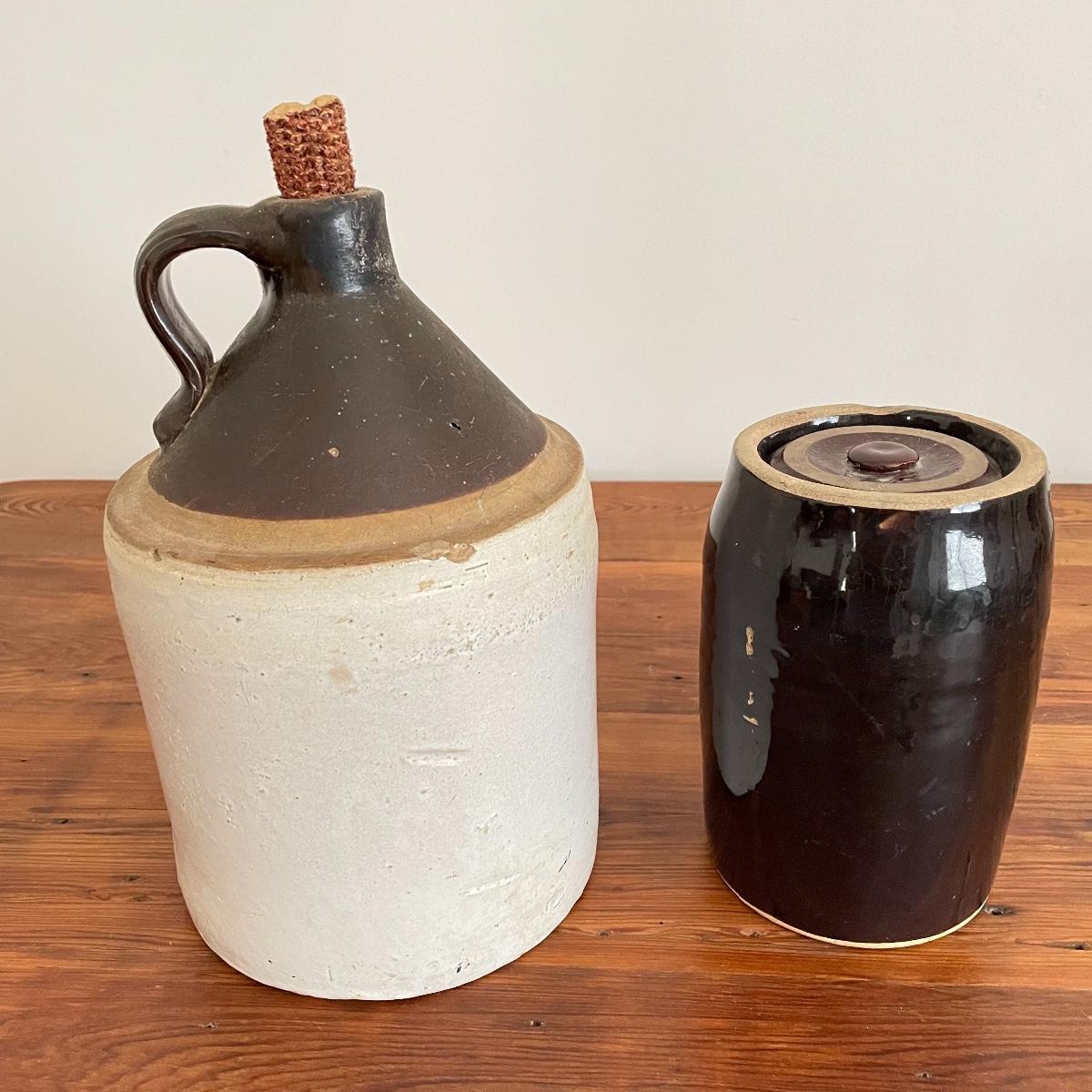 Vintage pottery of jug and crock. Lid to crock fits, but it may not be an original match. The tri-colored jug appears to have a corncob like cork, it’s roughly 7.25” x 11”. See images. Shipping available.