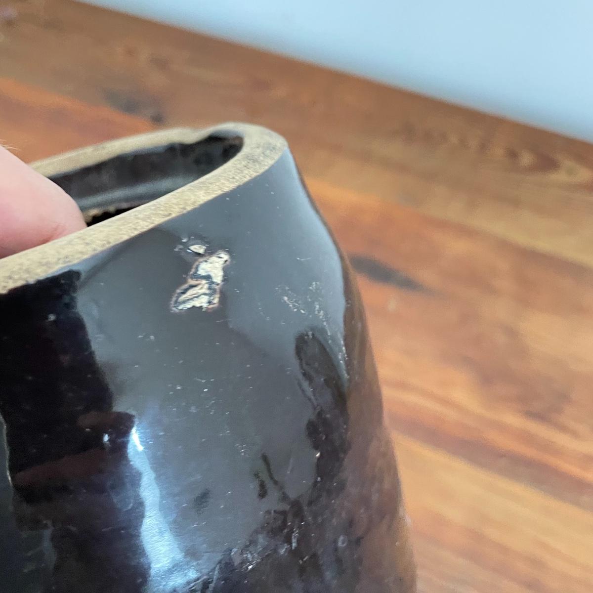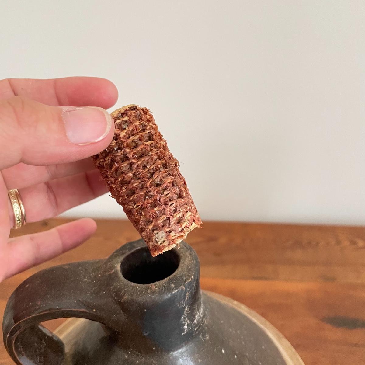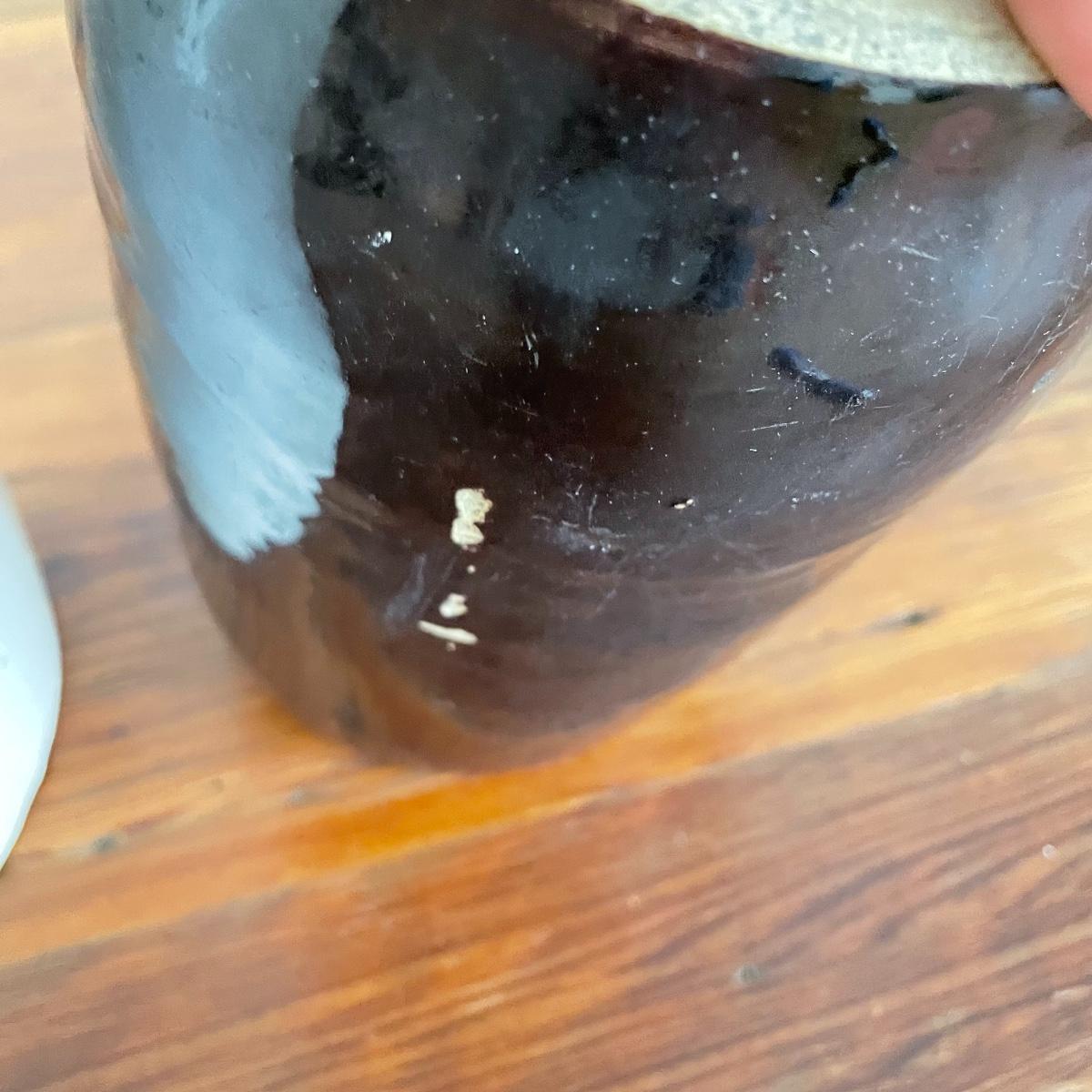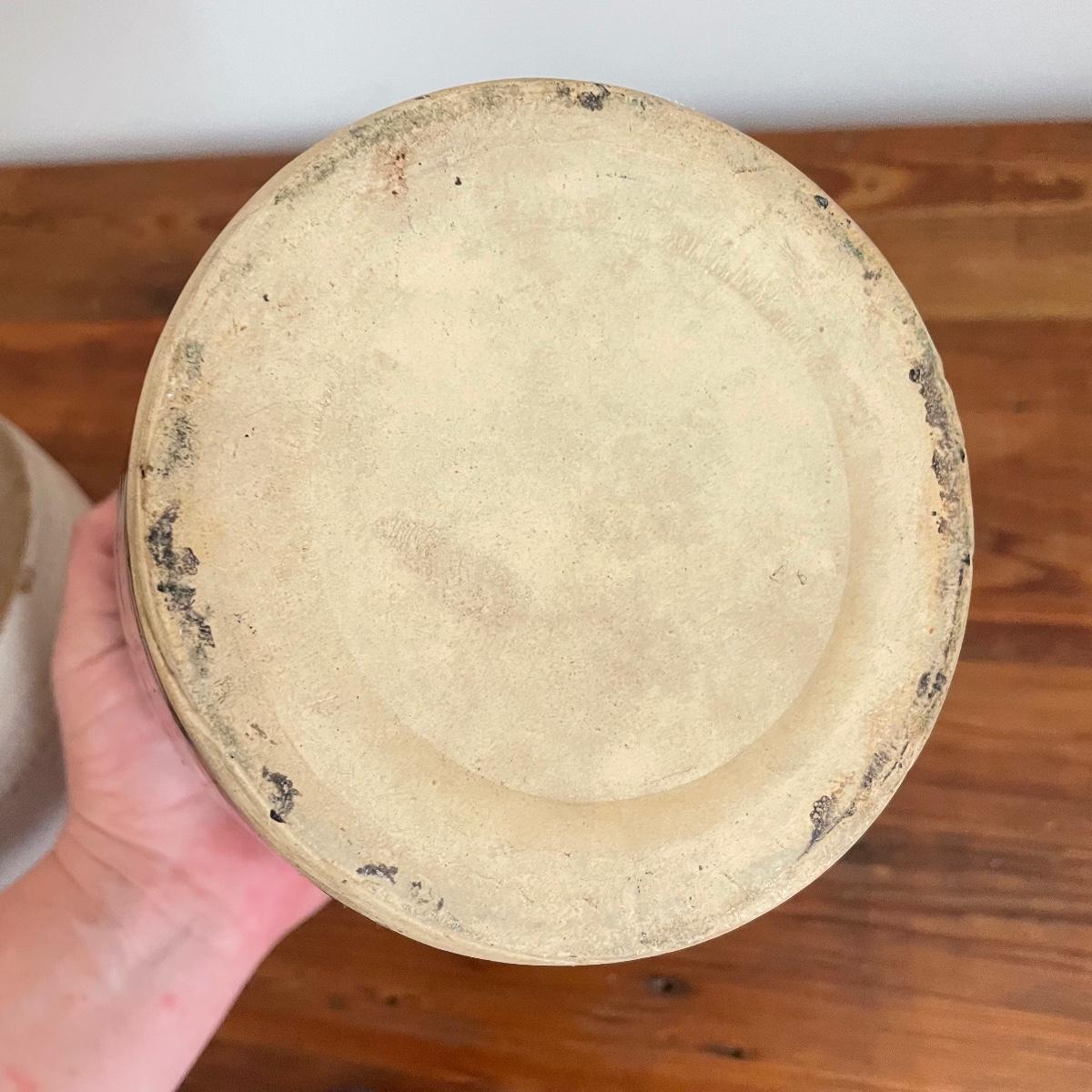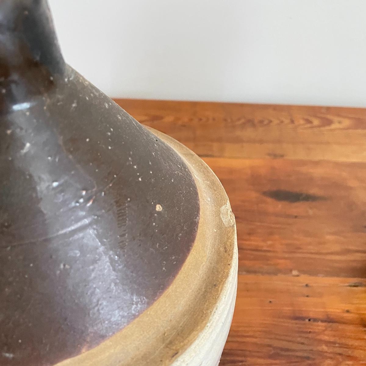 Vintage pottery of jug and crock. Lid to crock fits, but it may not be an original match. The tri-colored jug appears to have a corncob like cork, it’s roughly 7.25” x 11”. See images. Shipping available.