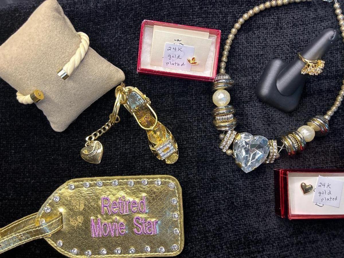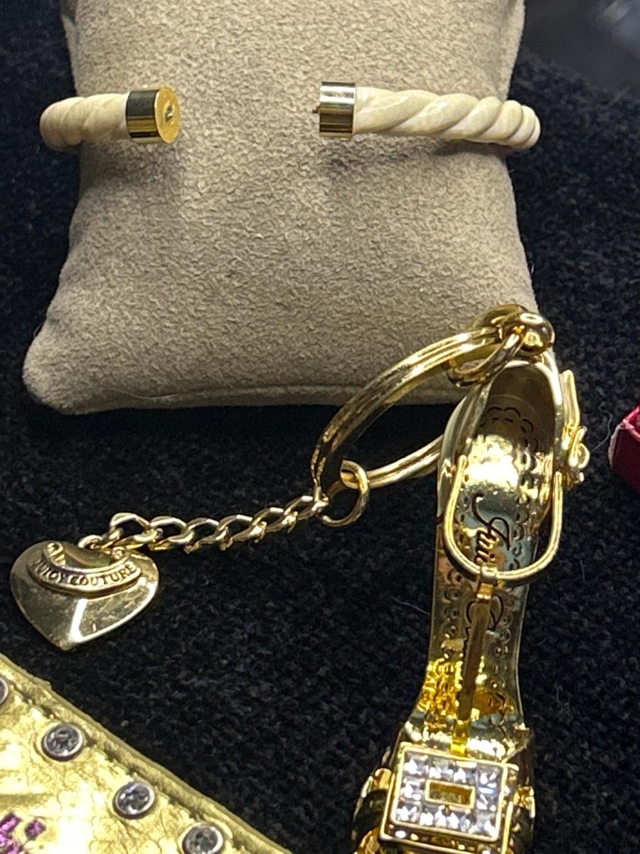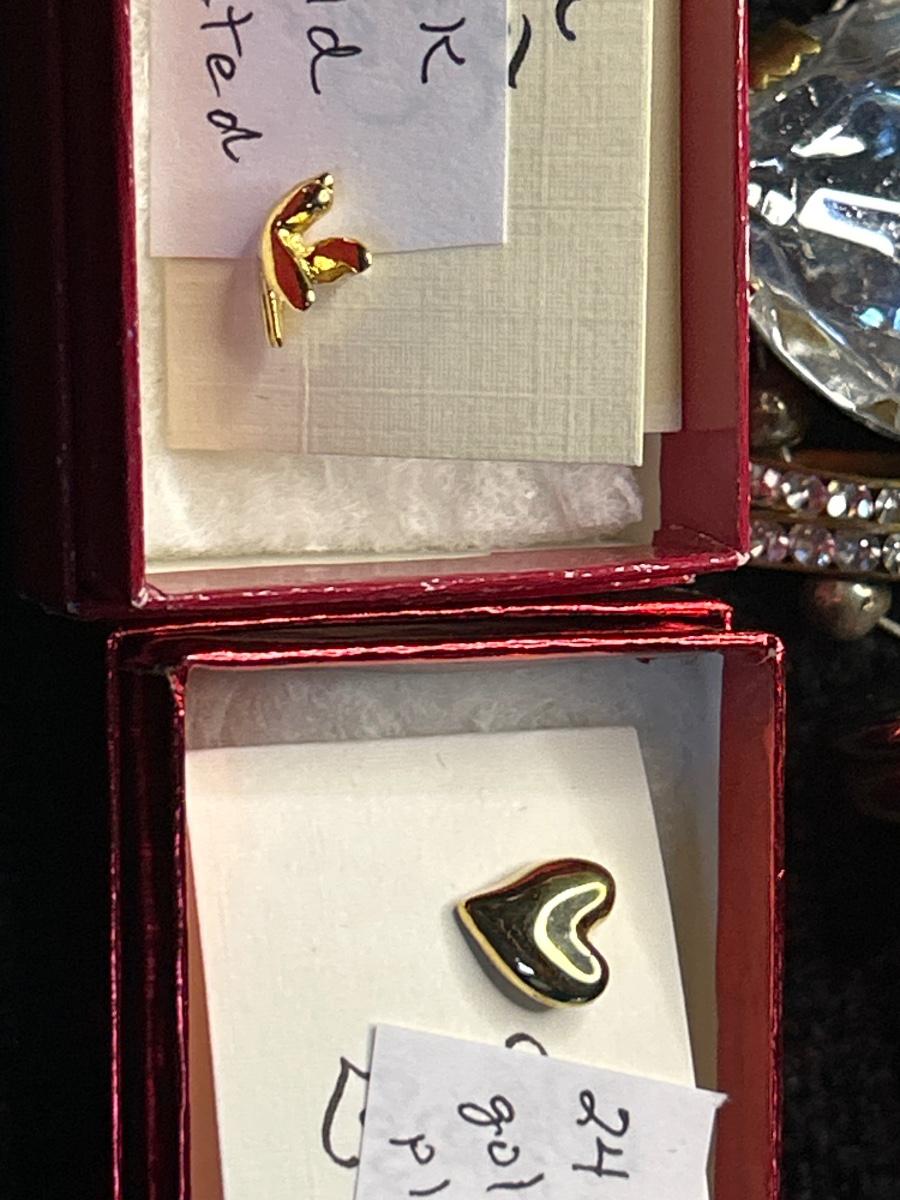 The items in the red boxes are pins and both 24 karat gold plated. The bracelet is lucite and the ring is stamped 925.