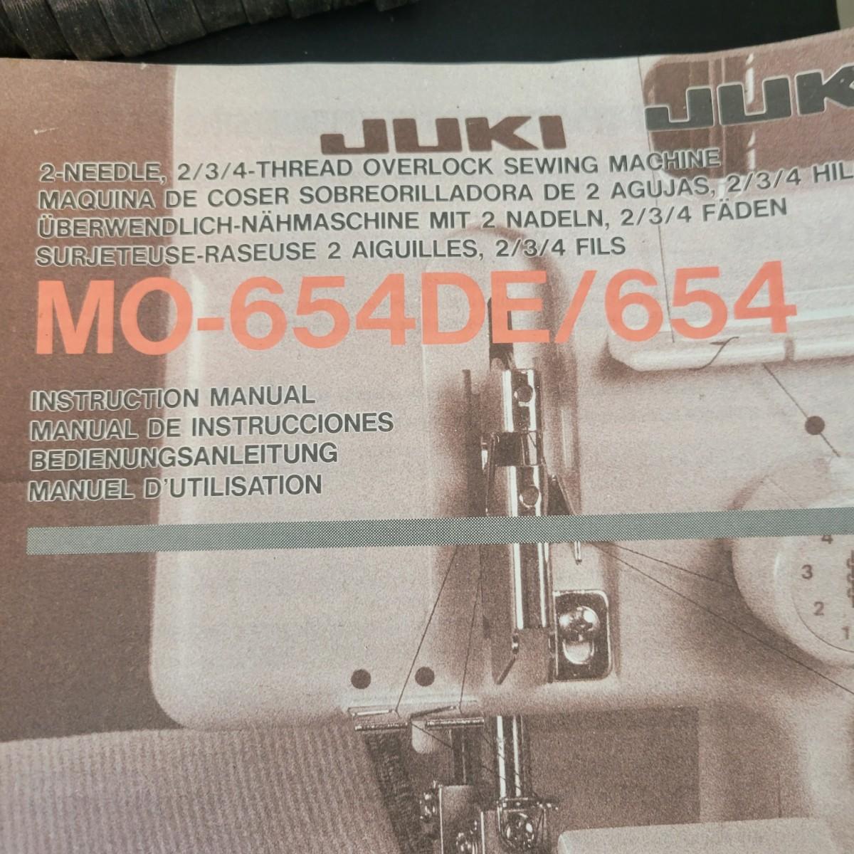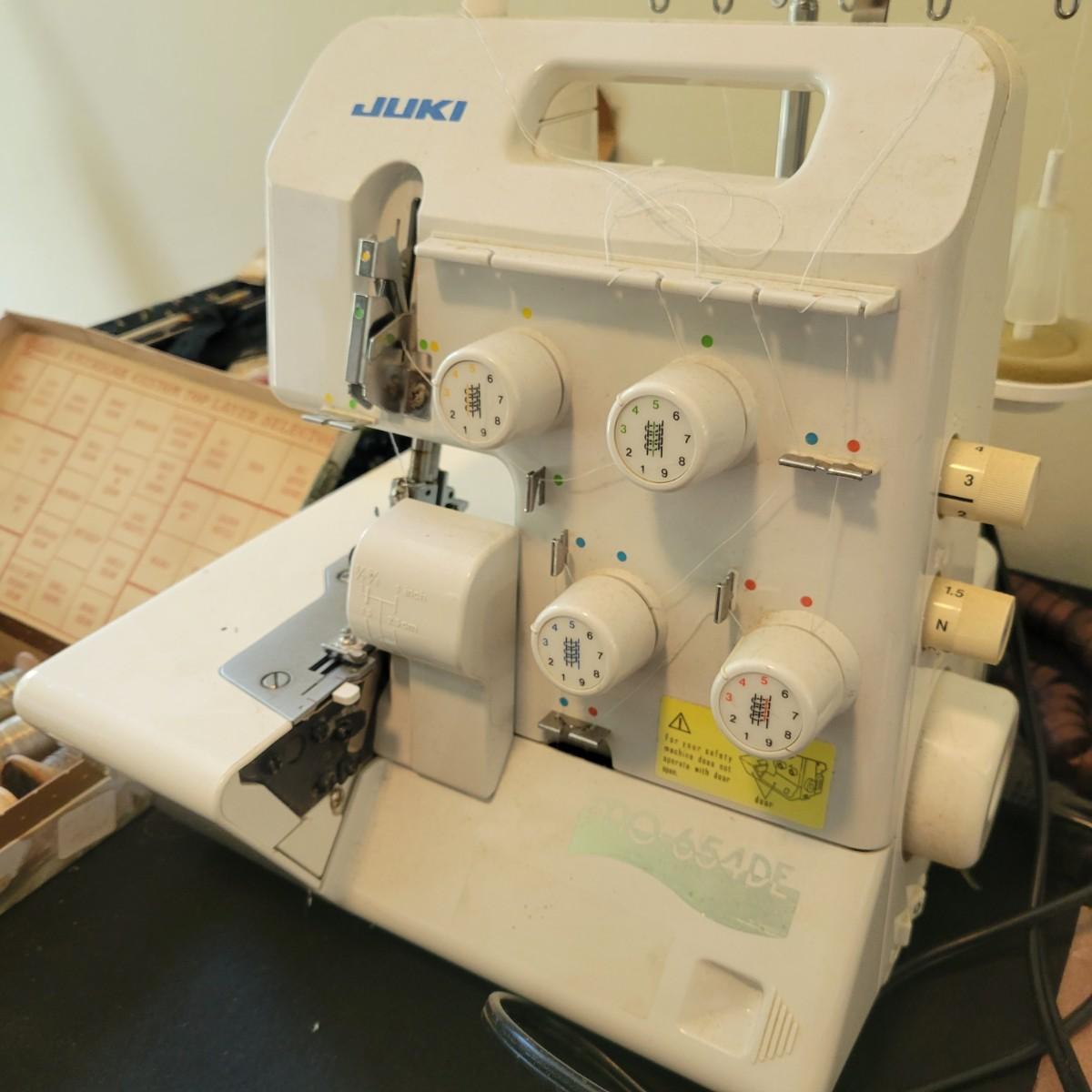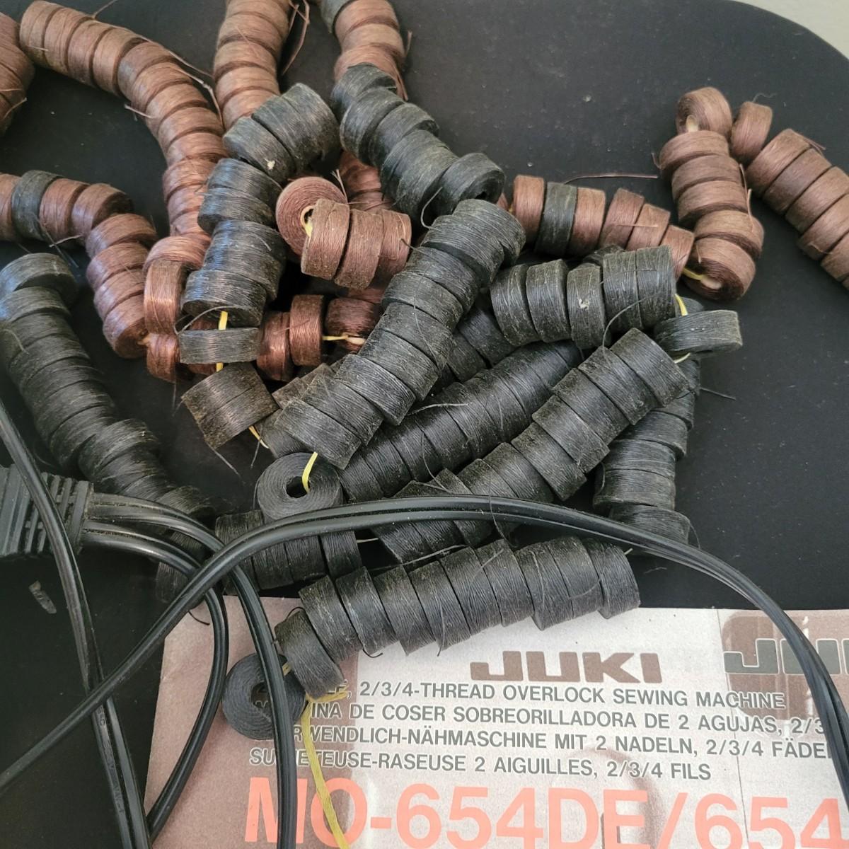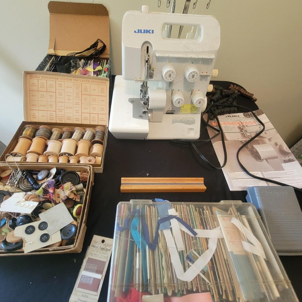 Juki model MO-654DE/654 2 needle, multi thread sewing machine. Machine was tested and works. Also included is multiple boxes of tapes and trims, buttons and bobbins in black and brown. Original manual is included with the lot. Shipping Available.