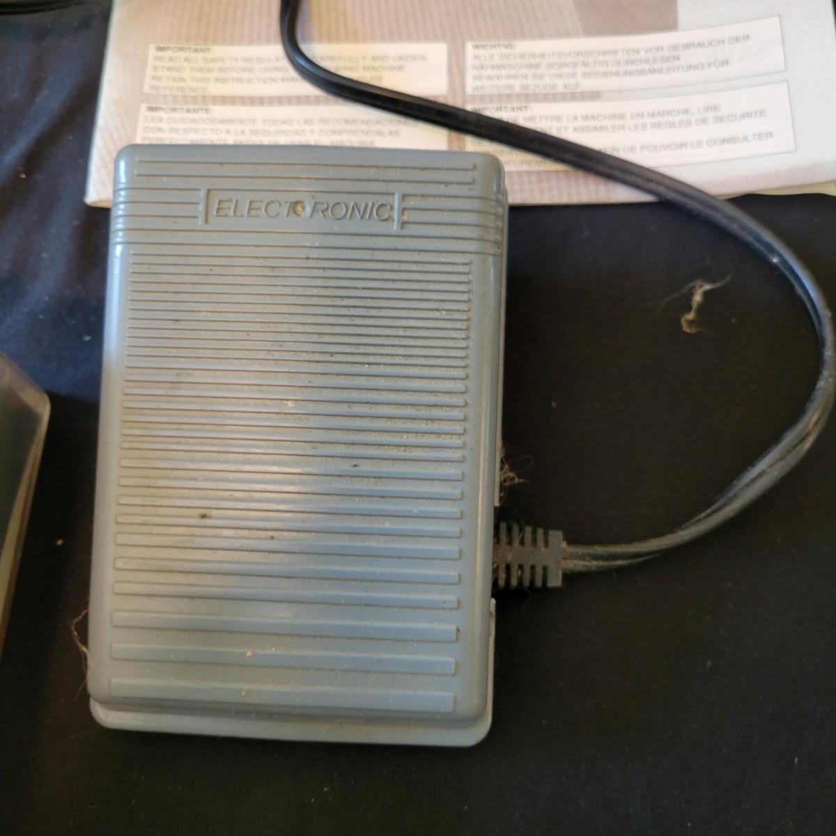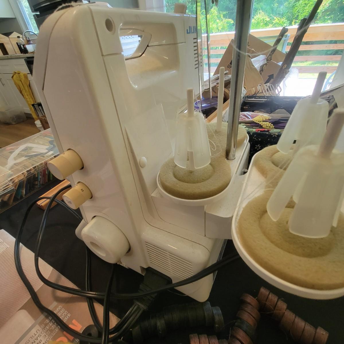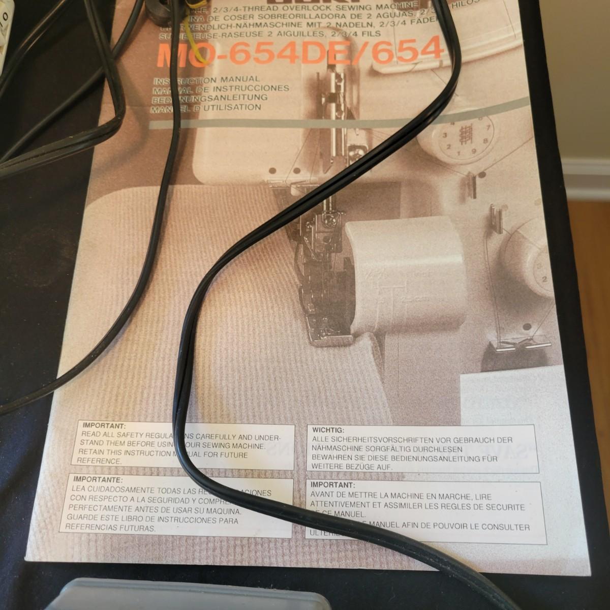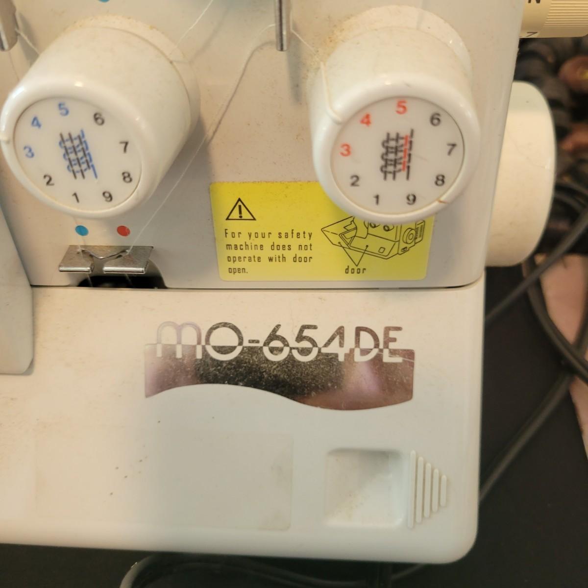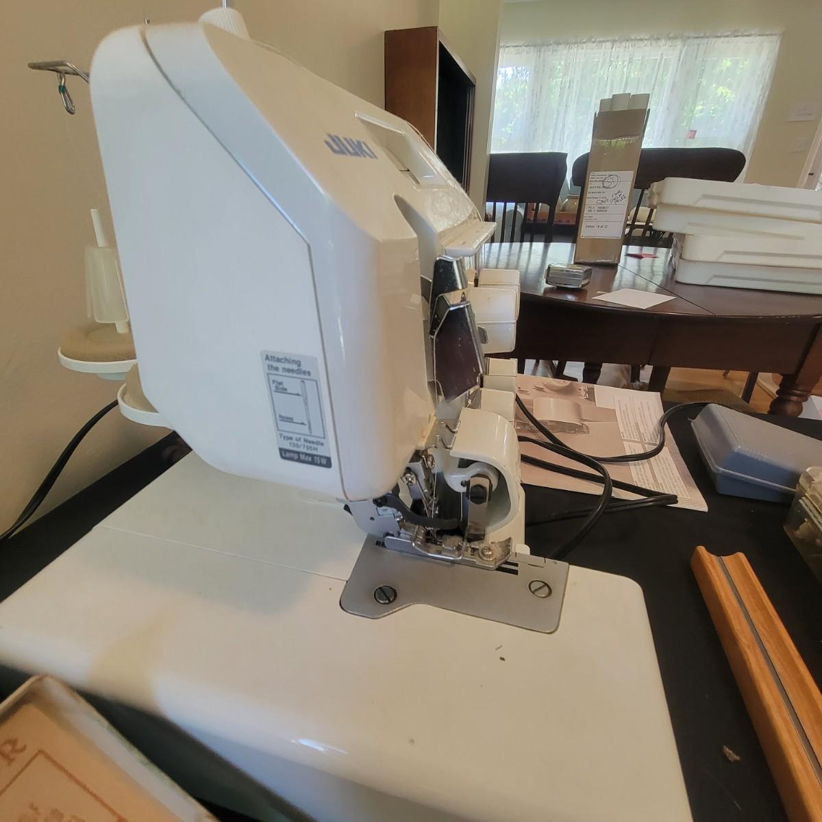 Juki model MO-654DE/654 2 needle, multi thread sewing machine. Machine was tested and works. Also included is multiple boxes of tapes and trims, buttons and bobbins in black and brown. Original manual is included with the lot. Shipping Available.