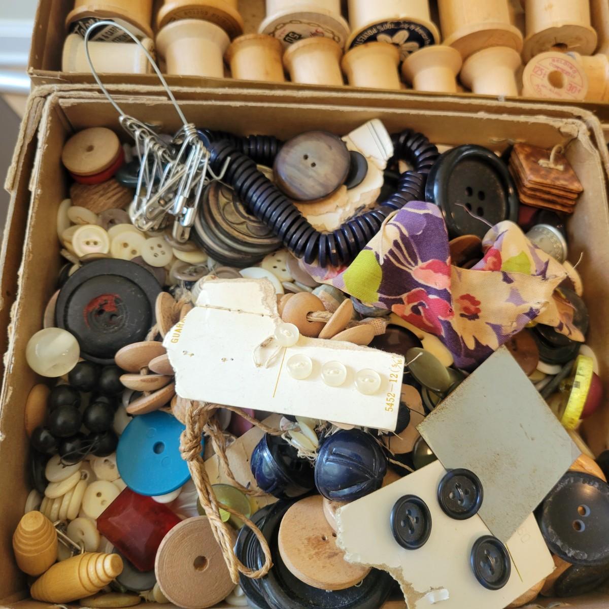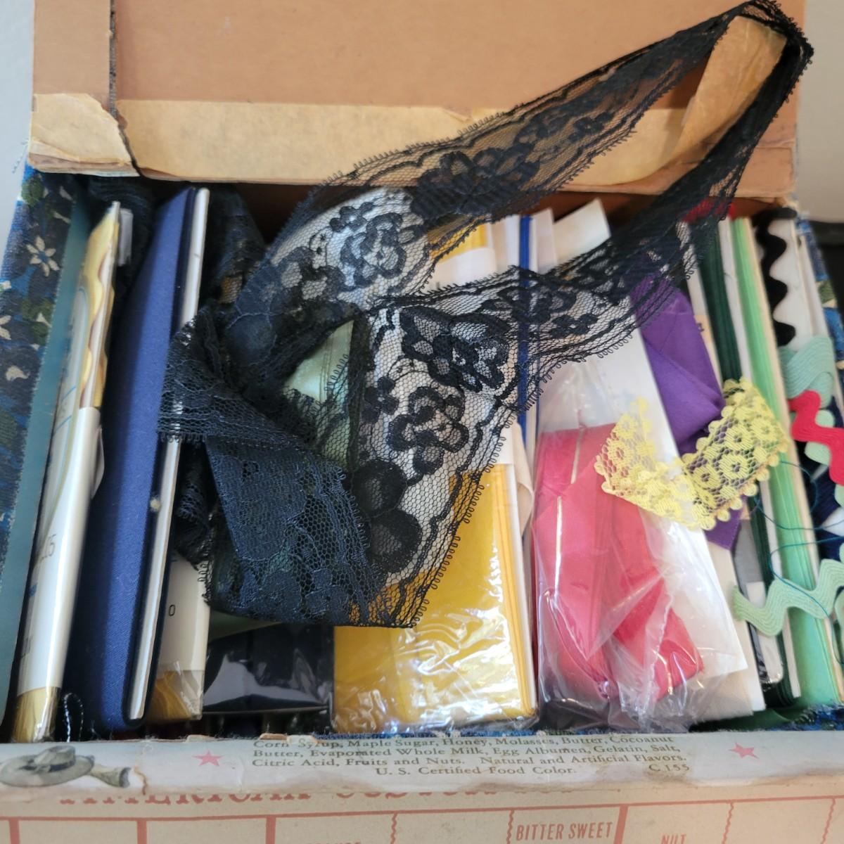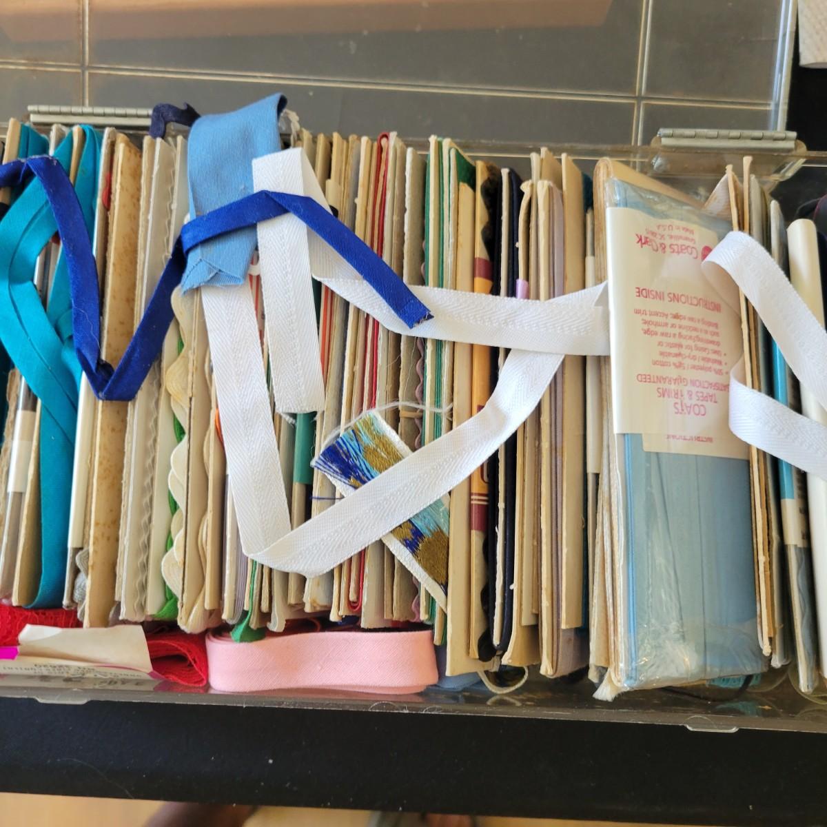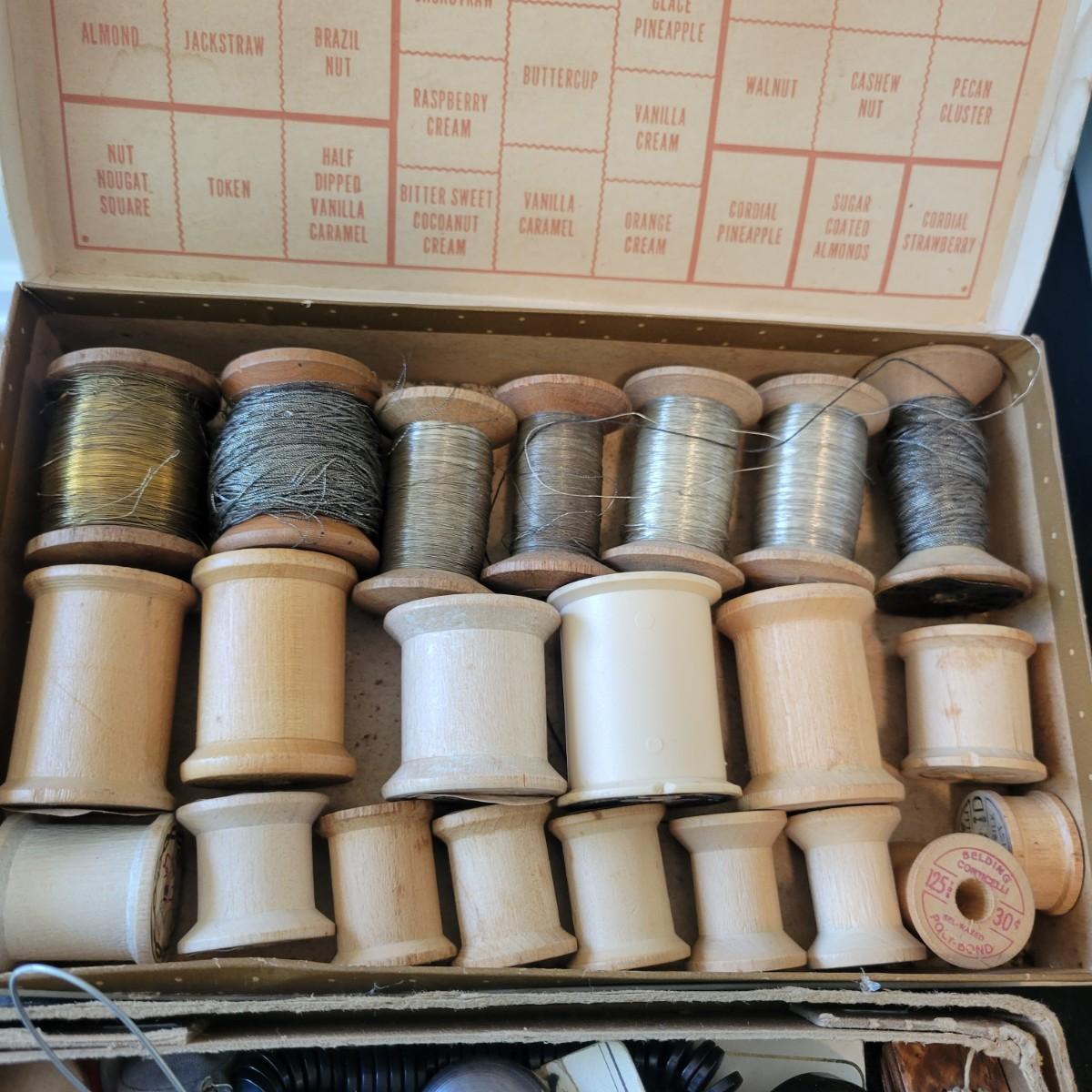 Juki model MO-654DE/654 2 needle, multi thread sewing machine. Machine was tested and works. Also included is multiple boxes of tapes and trims, buttons and bobbins in black and brown. Original manual is included with the lot. Shipping Available.