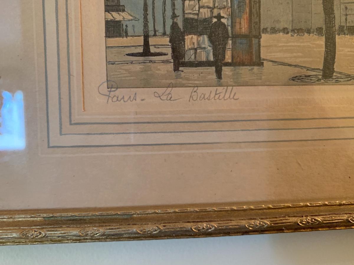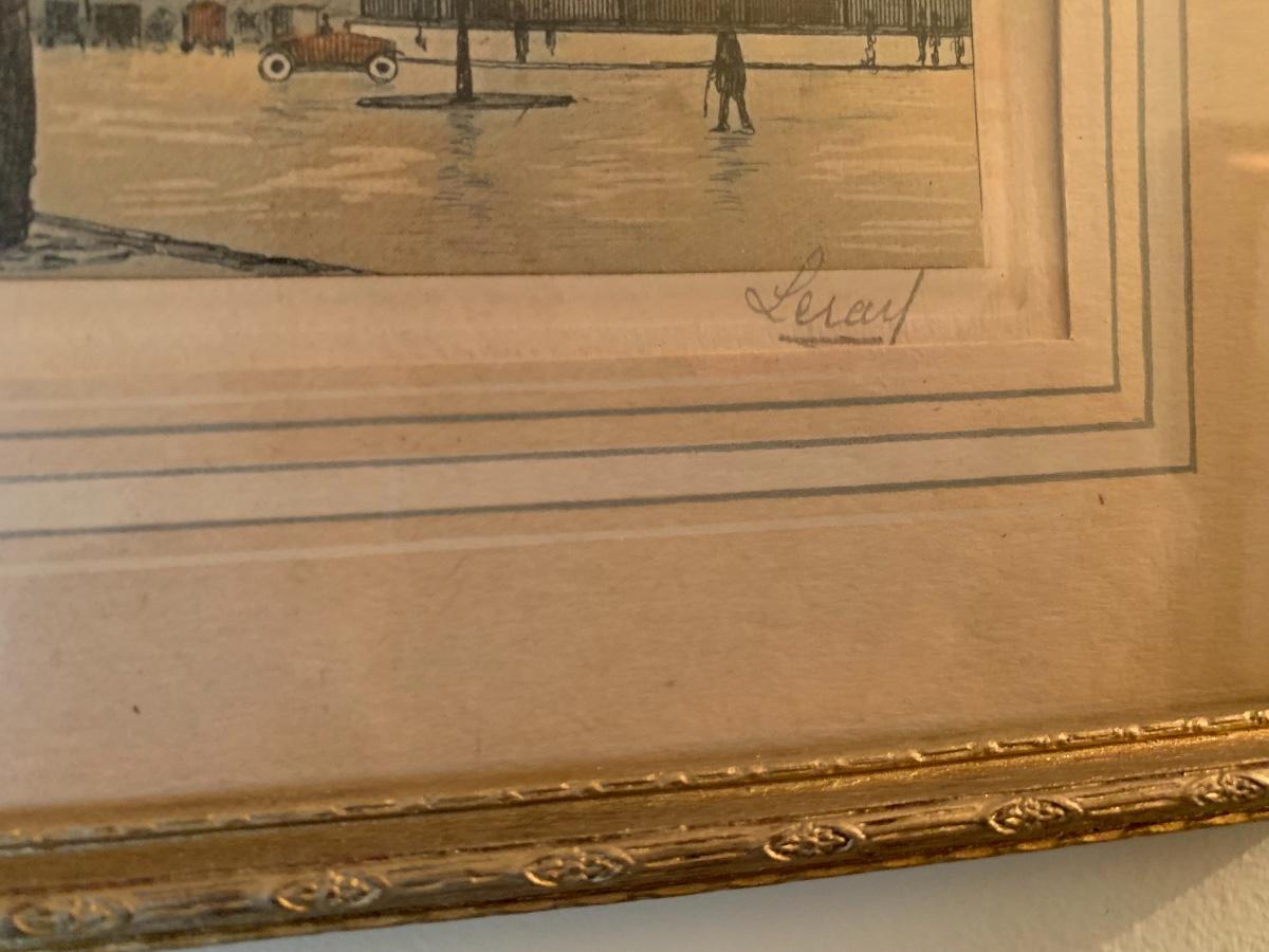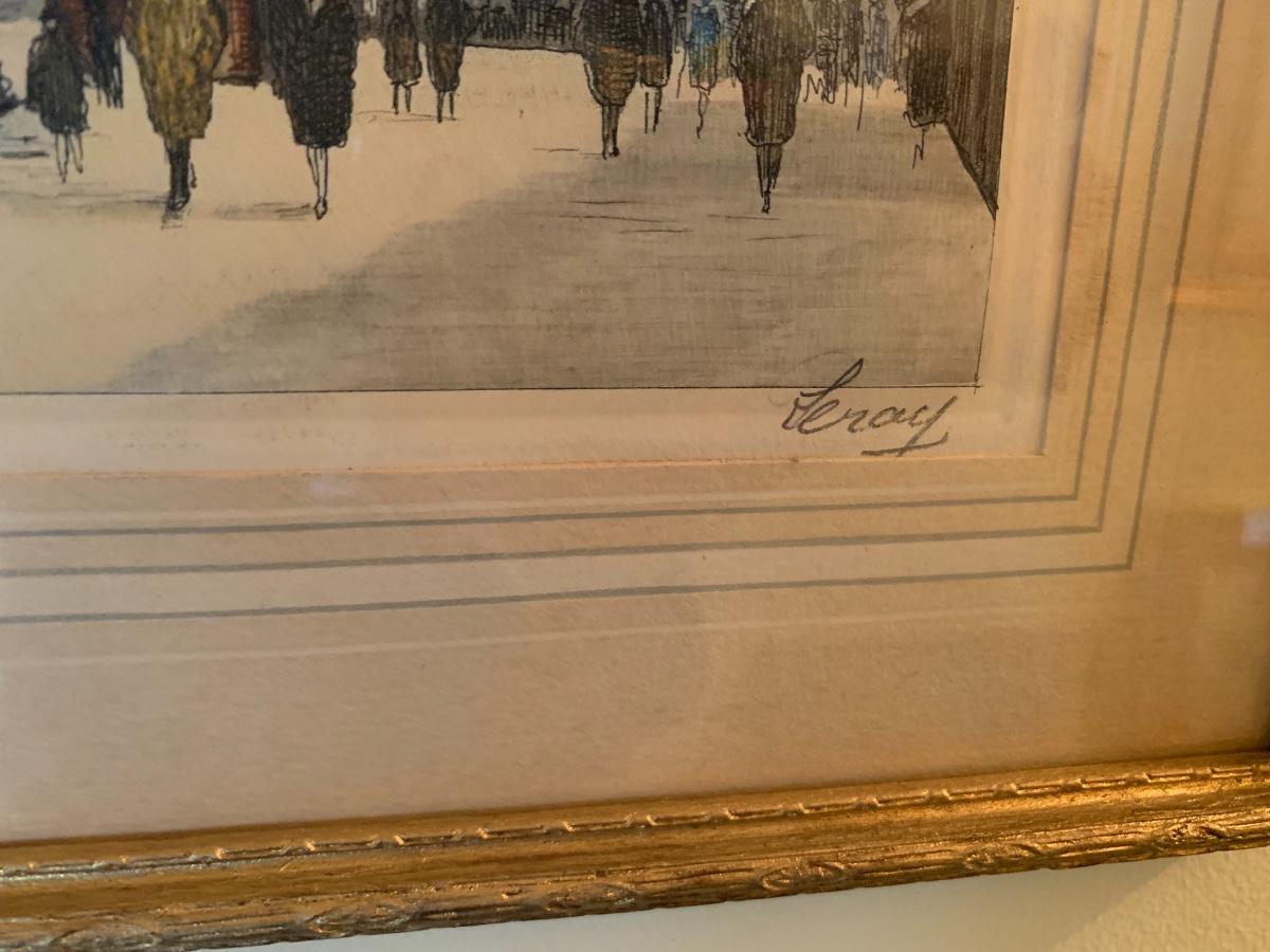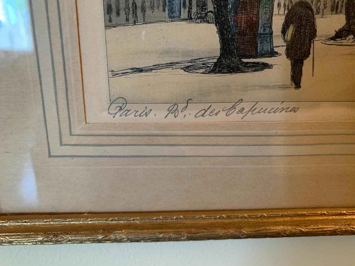 2 framed signed etchings by Jules Leray. Rues des Capucines and La Baastille. Signed and labeled.
