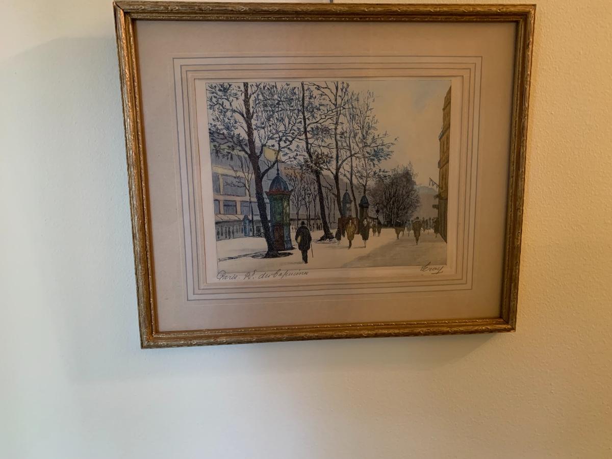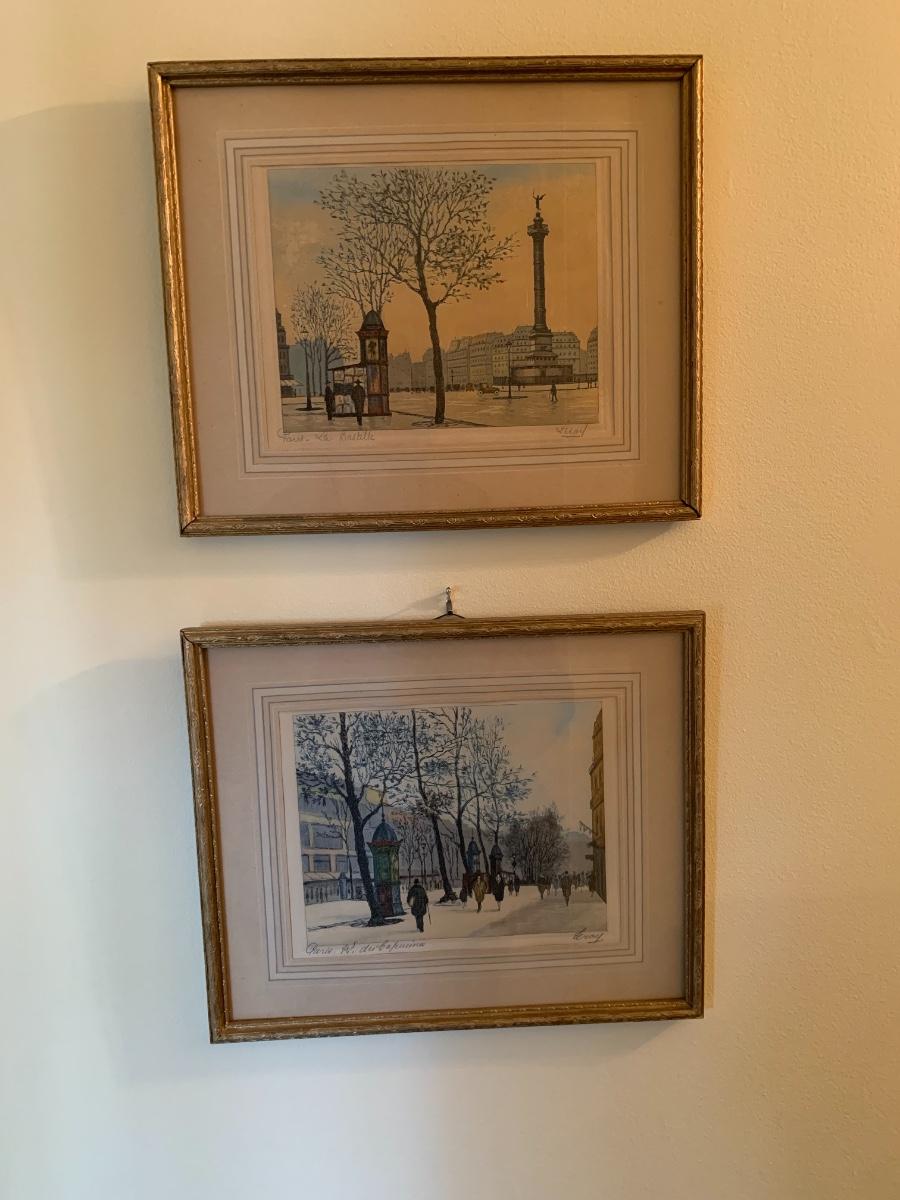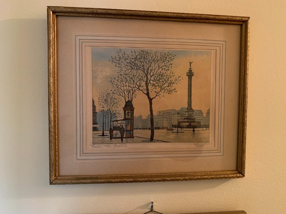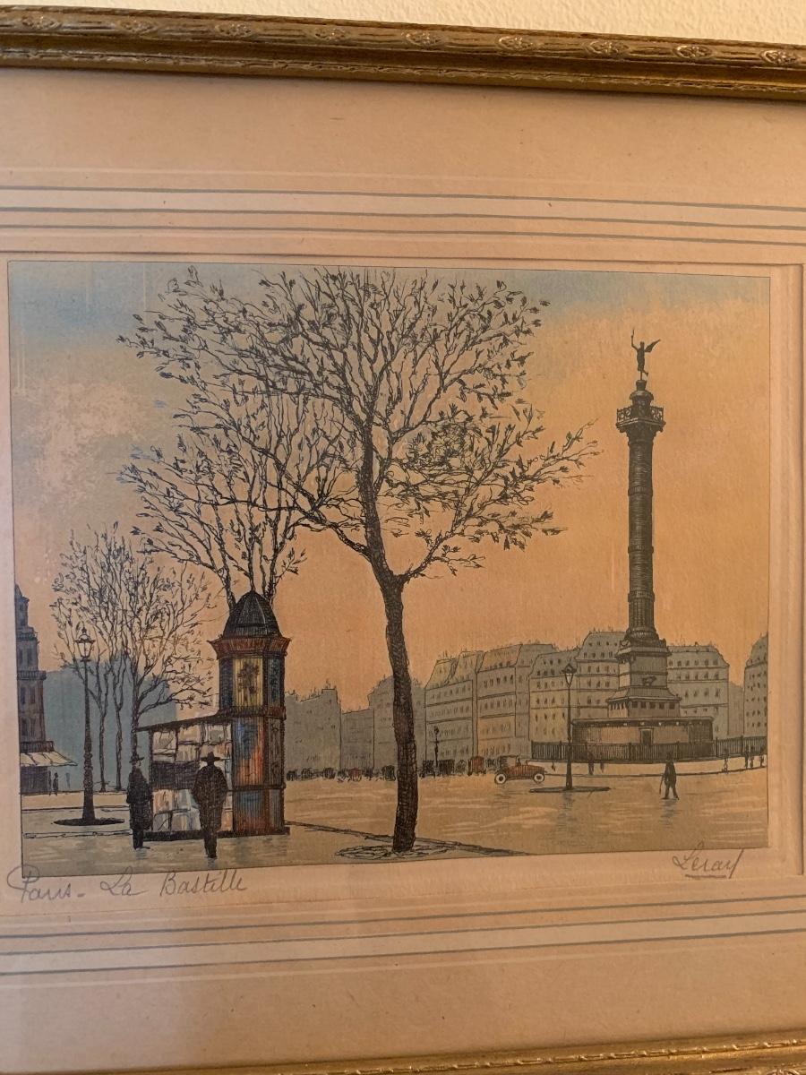 2 framed signed etchings by Jules Leray. Rues des Capucines and La Baastille. Signed and labeled.
