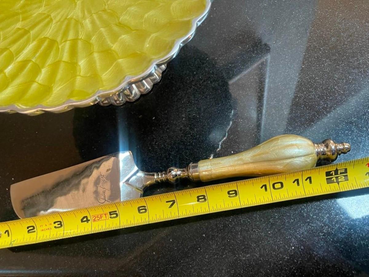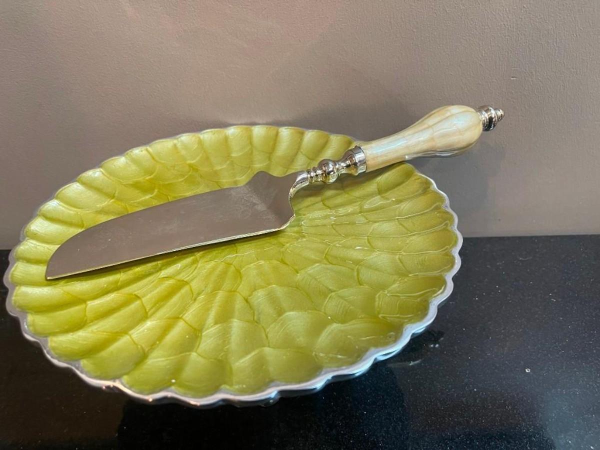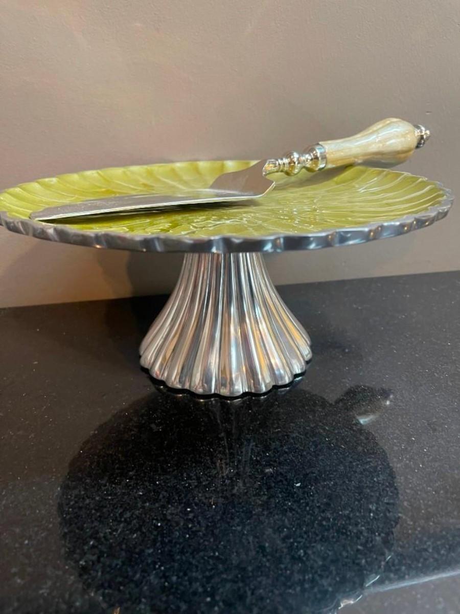 Julia Knight 10" Peony enameled metal, footed cake plate in like new condition with coordinating enameled handle cake server.