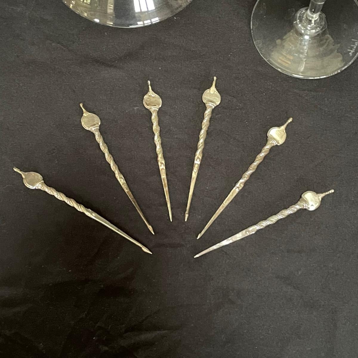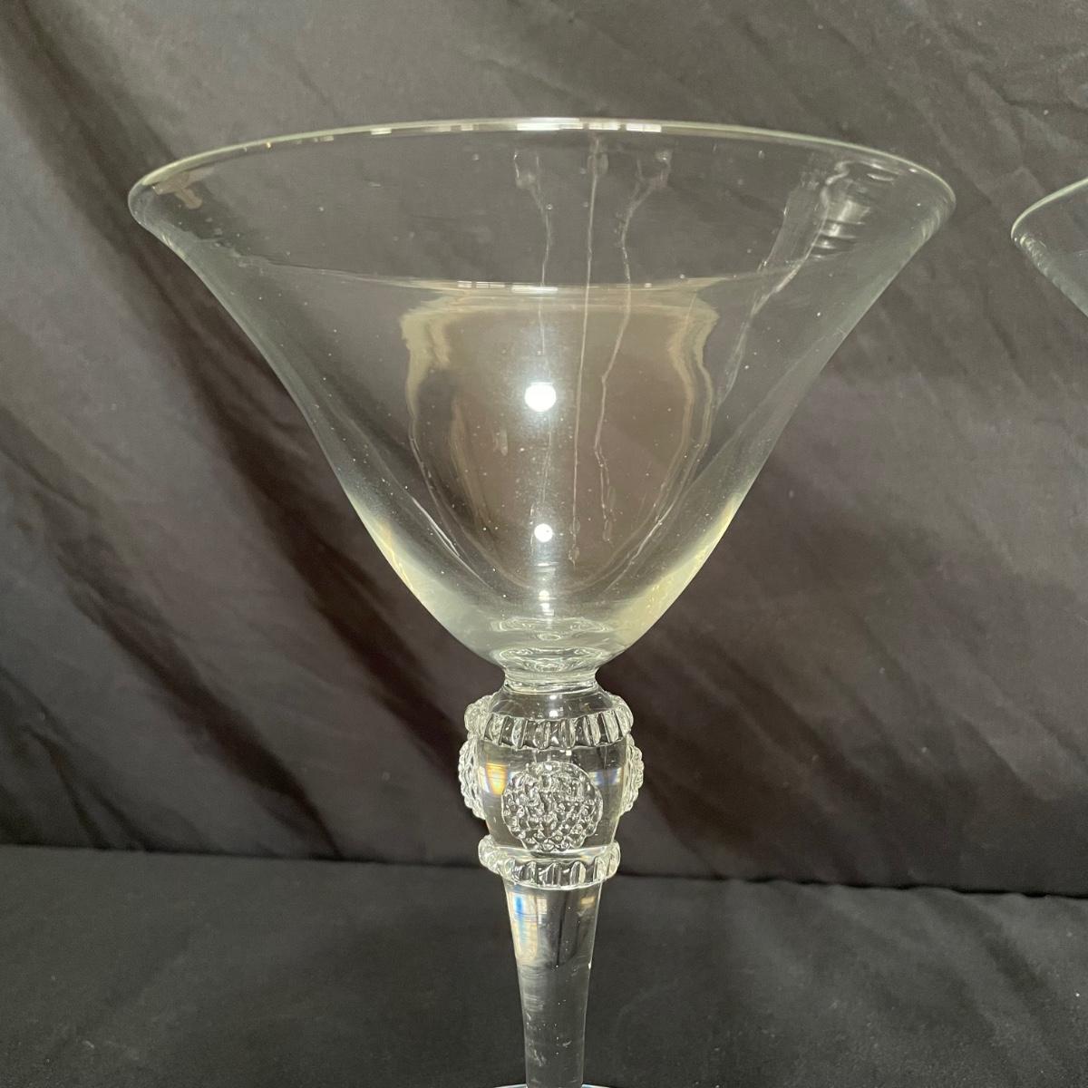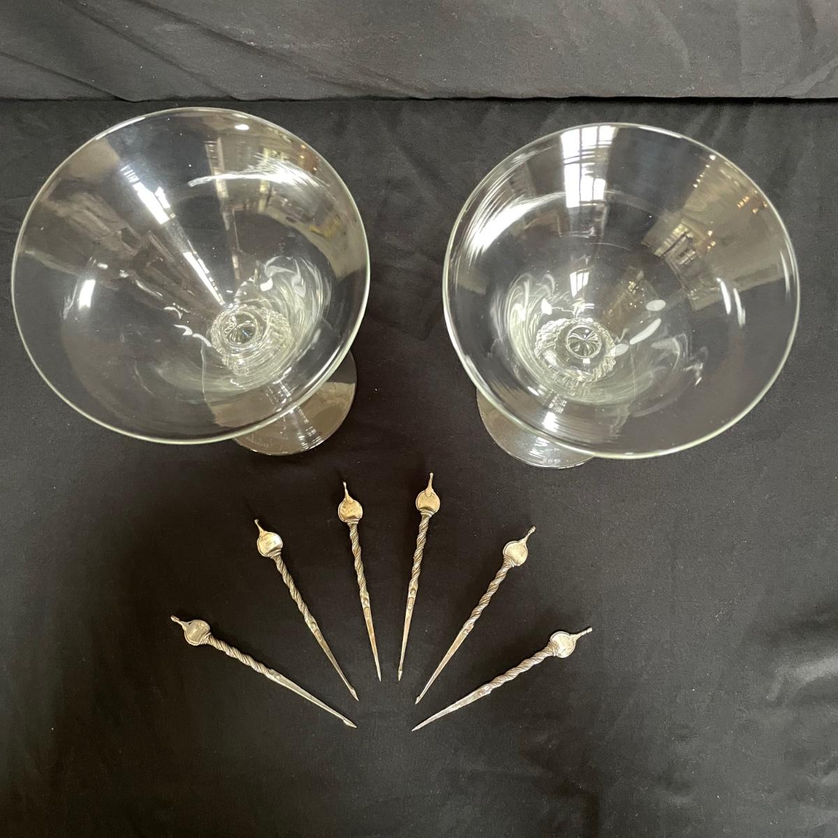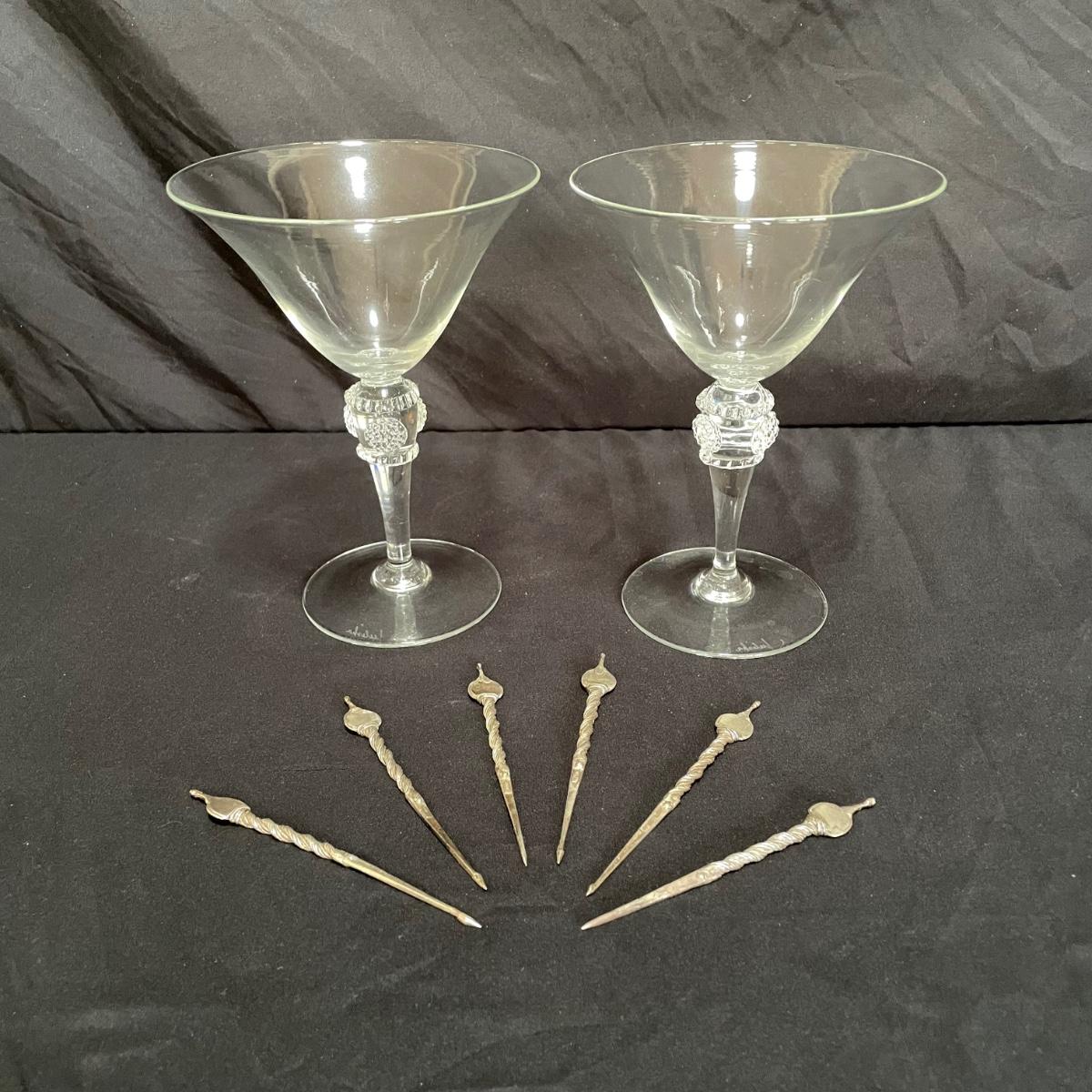 Two martini glasses with Juliska hallmarks and that classic crystal ping sound plus six cocktail picks stamped Sterling. Each pick has a handle that could be monogrammed or etched. All items show evidence of being handmade. Glasses are 5” x 7”H. See images. Shipping available.