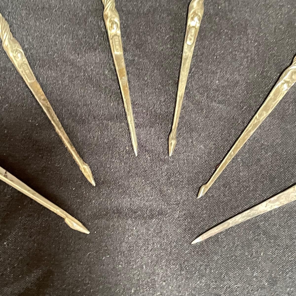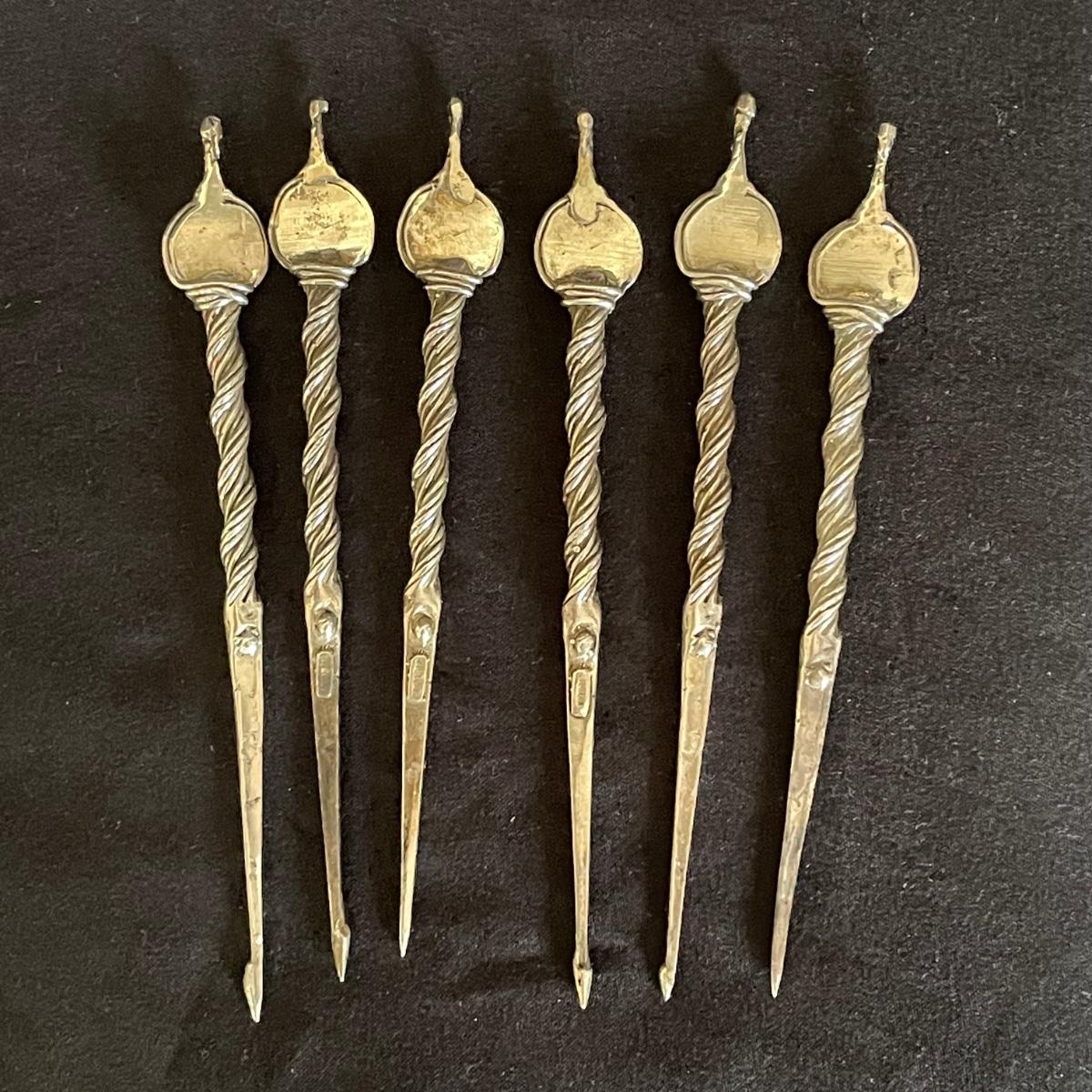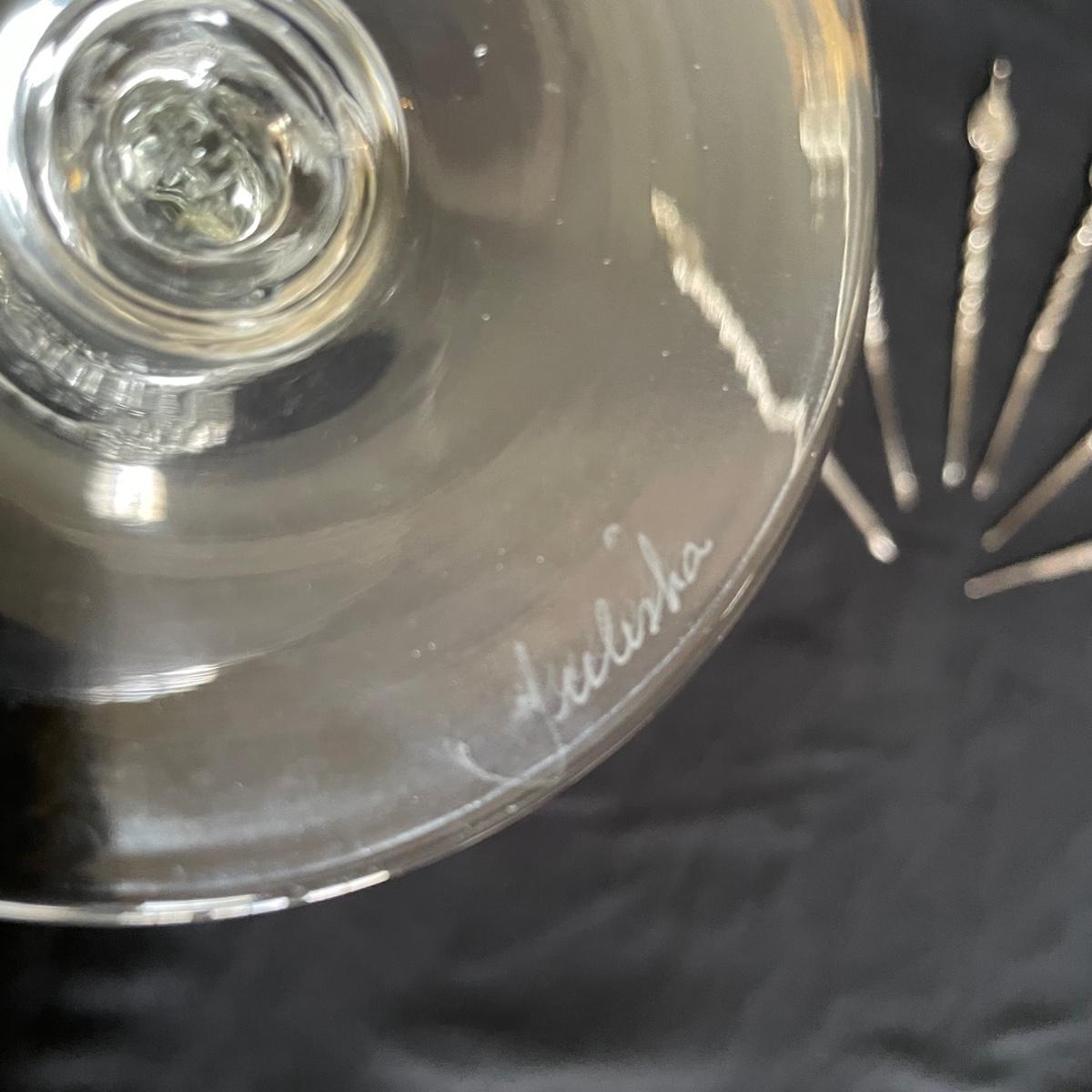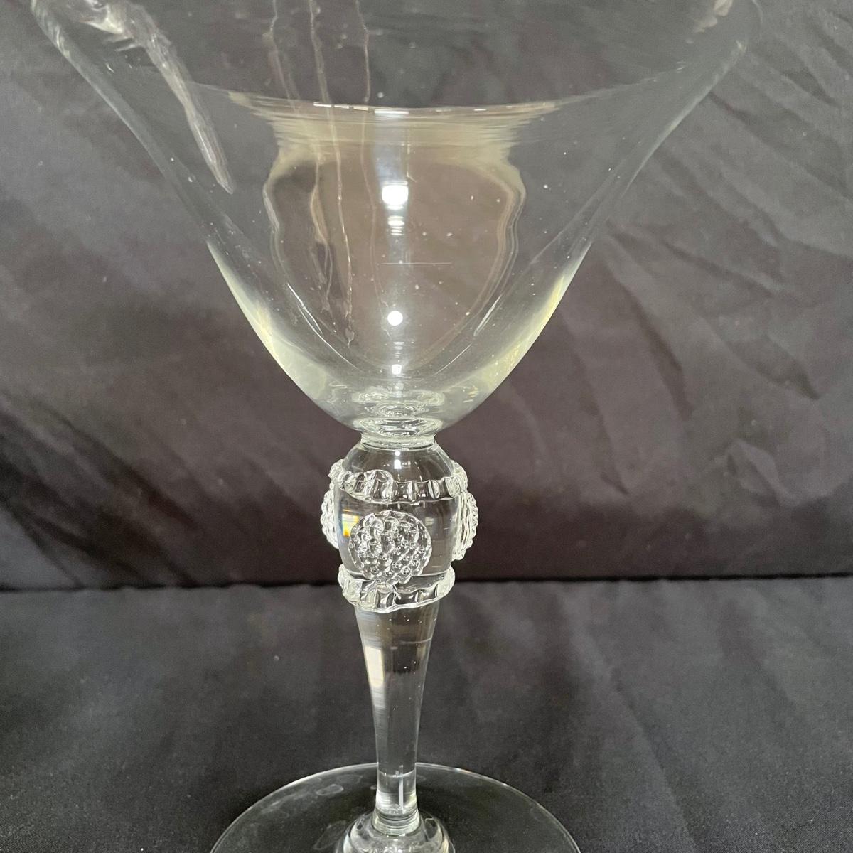 Two martini glasses with Juliska hallmarks and that classic crystal ping sound plus six cocktail picks stamped Sterling. Each pick has a handle that could be monogrammed or etched. All items show evidence of being handmade. Glasses are 5” x 7”H. See images. Shipping available.