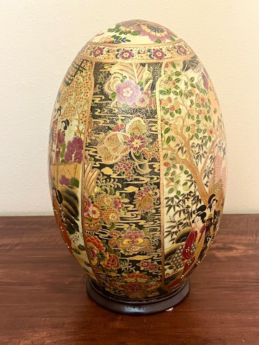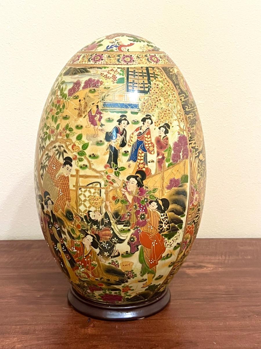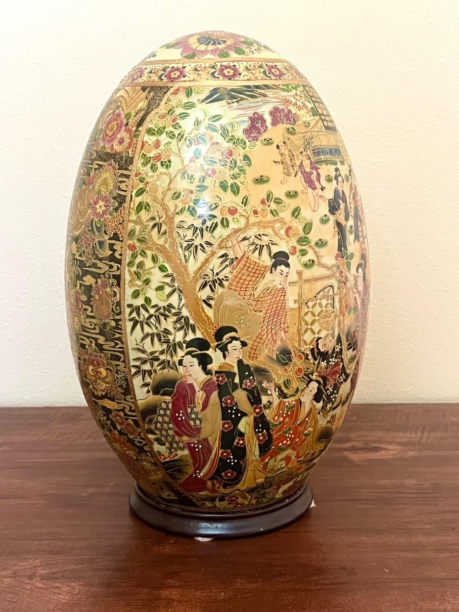 VINTAGE Collectible Porcelain, JUMBO Satsuma Egg Japanese With Wooden Base. Measures 18 inches tall.