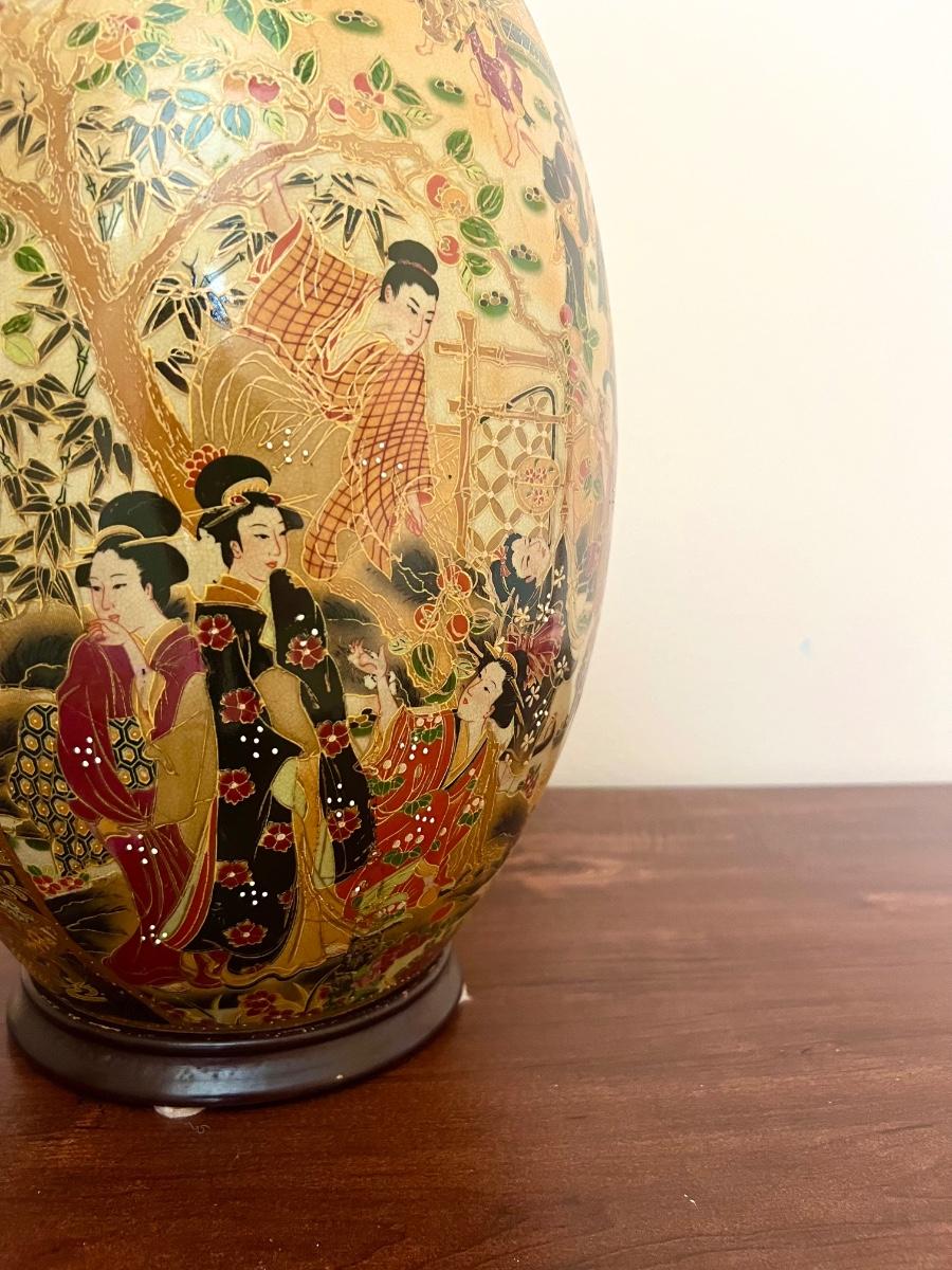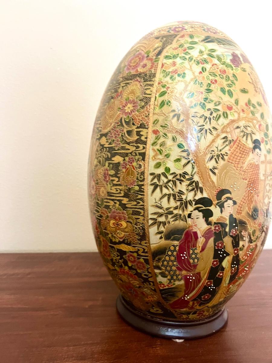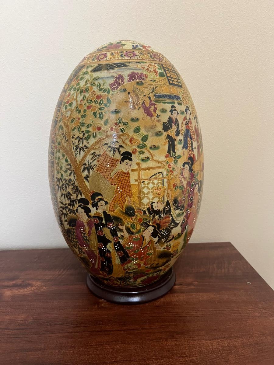 VINTAGE Collectible Porcelain, JUMBO Satsuma Egg Japanese With Wooden Base. Measures 18 inches tall.