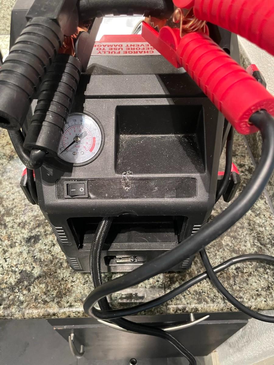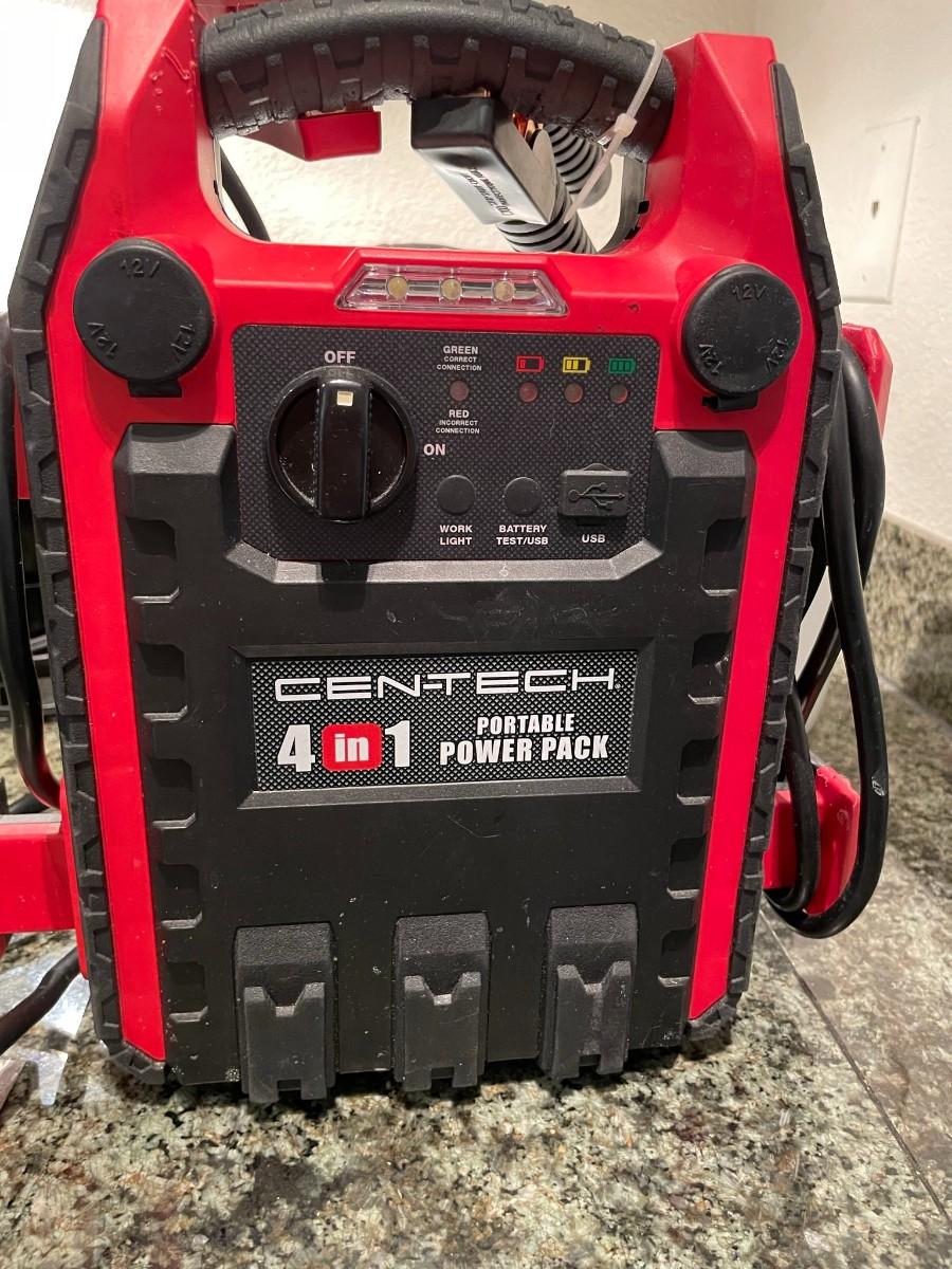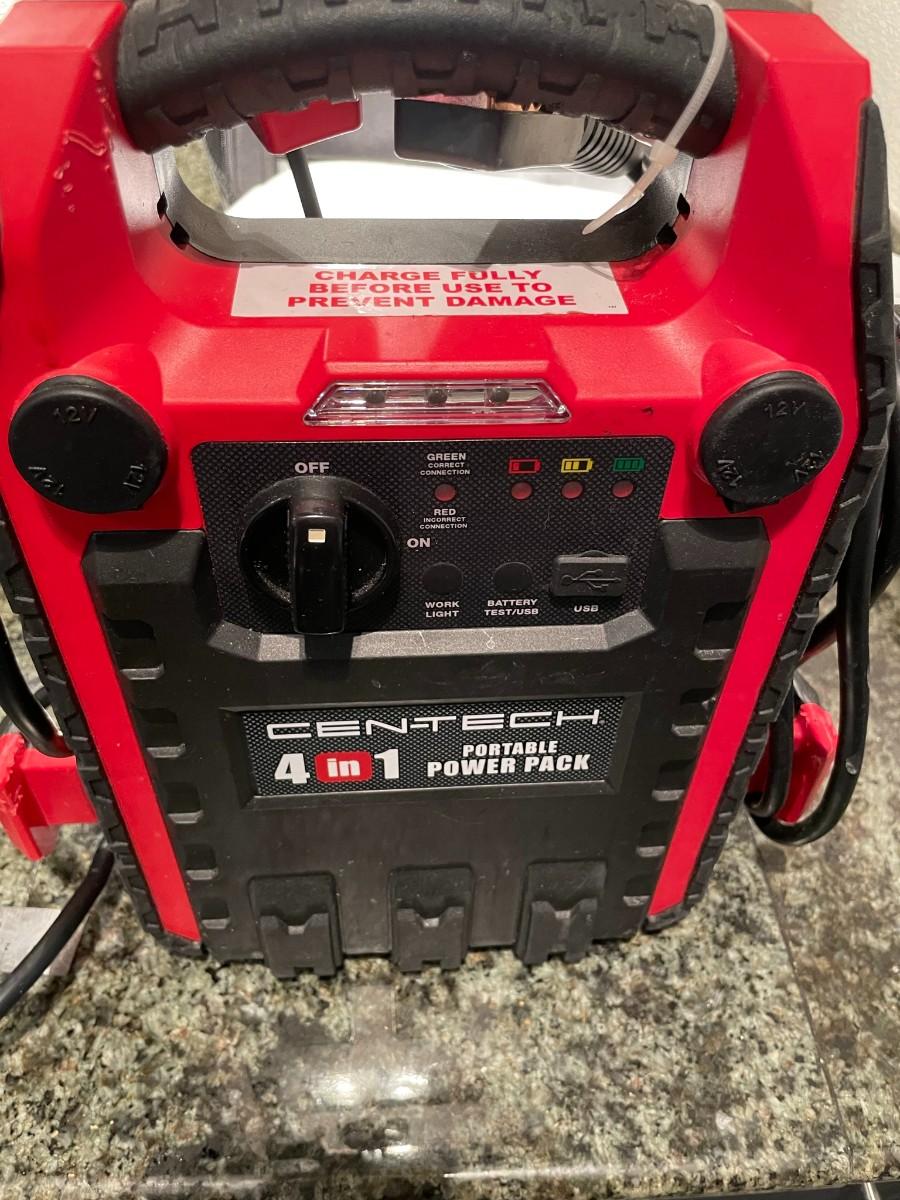 Centech 4 in 1 Portable Power Pack with light, air compresssor, batter charger and power source. Unit powers on. Like New