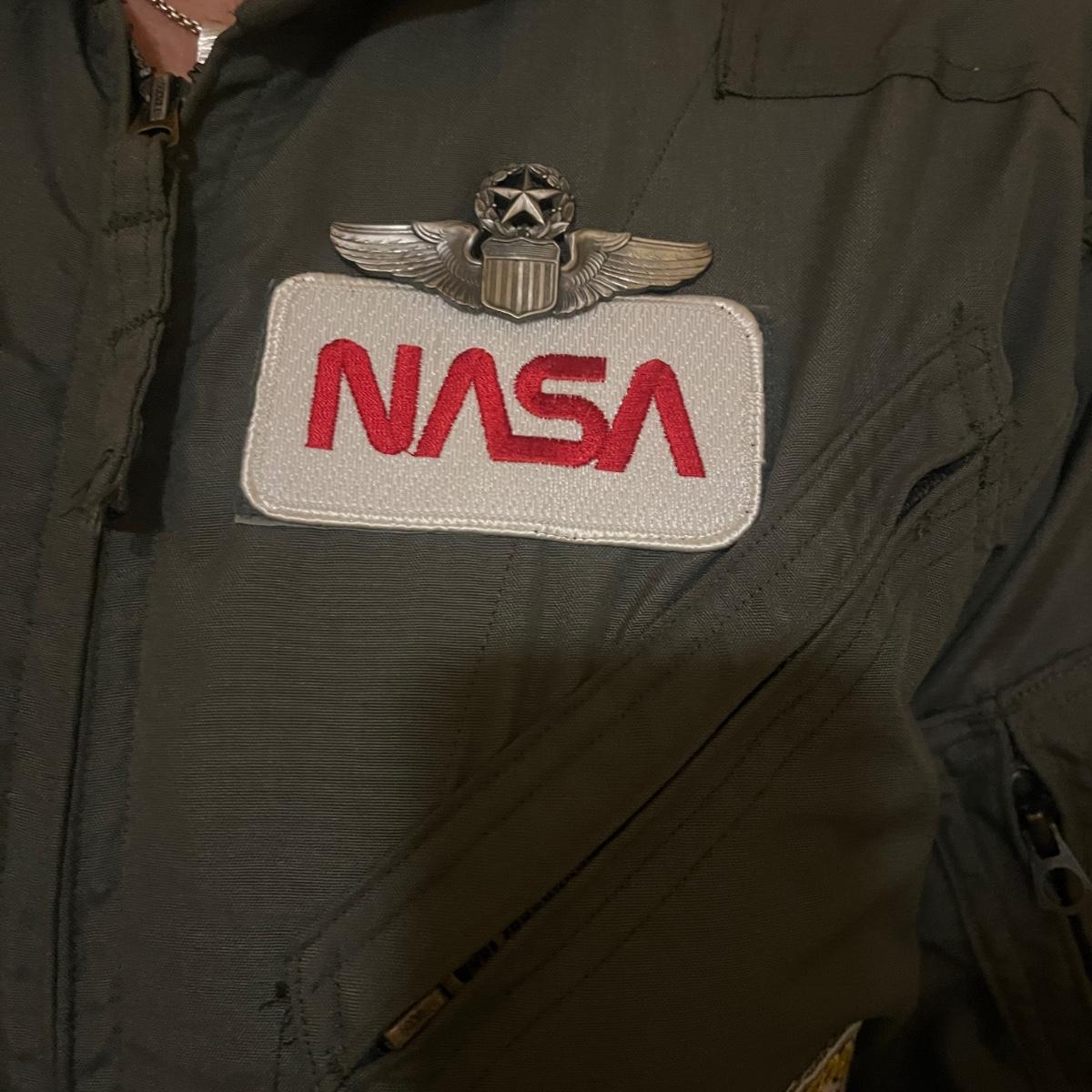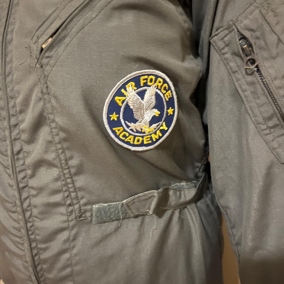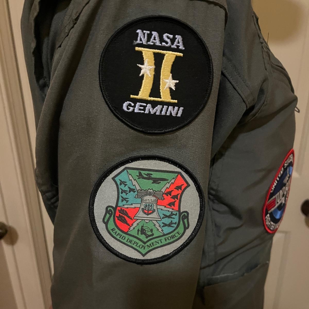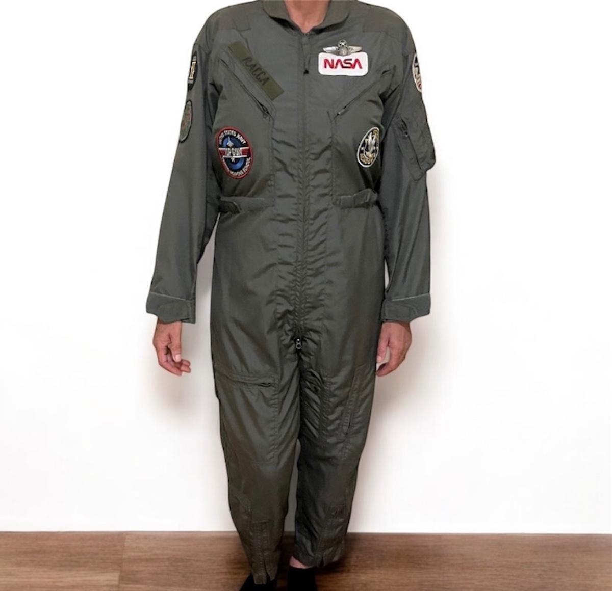This jumpsuit has patches from Top Gun, Columbia, Air Force Academy, NASA, Gemini and Rapid Deployment Force. Jumpsuit measures 22” chest, 18” hips and 29” inseam. Also has a metal pair of wings.