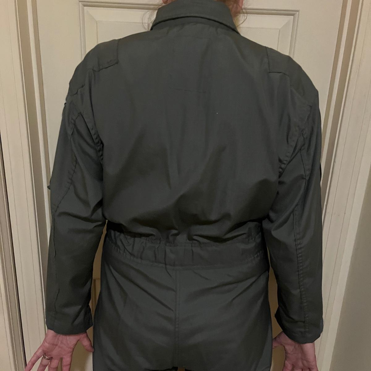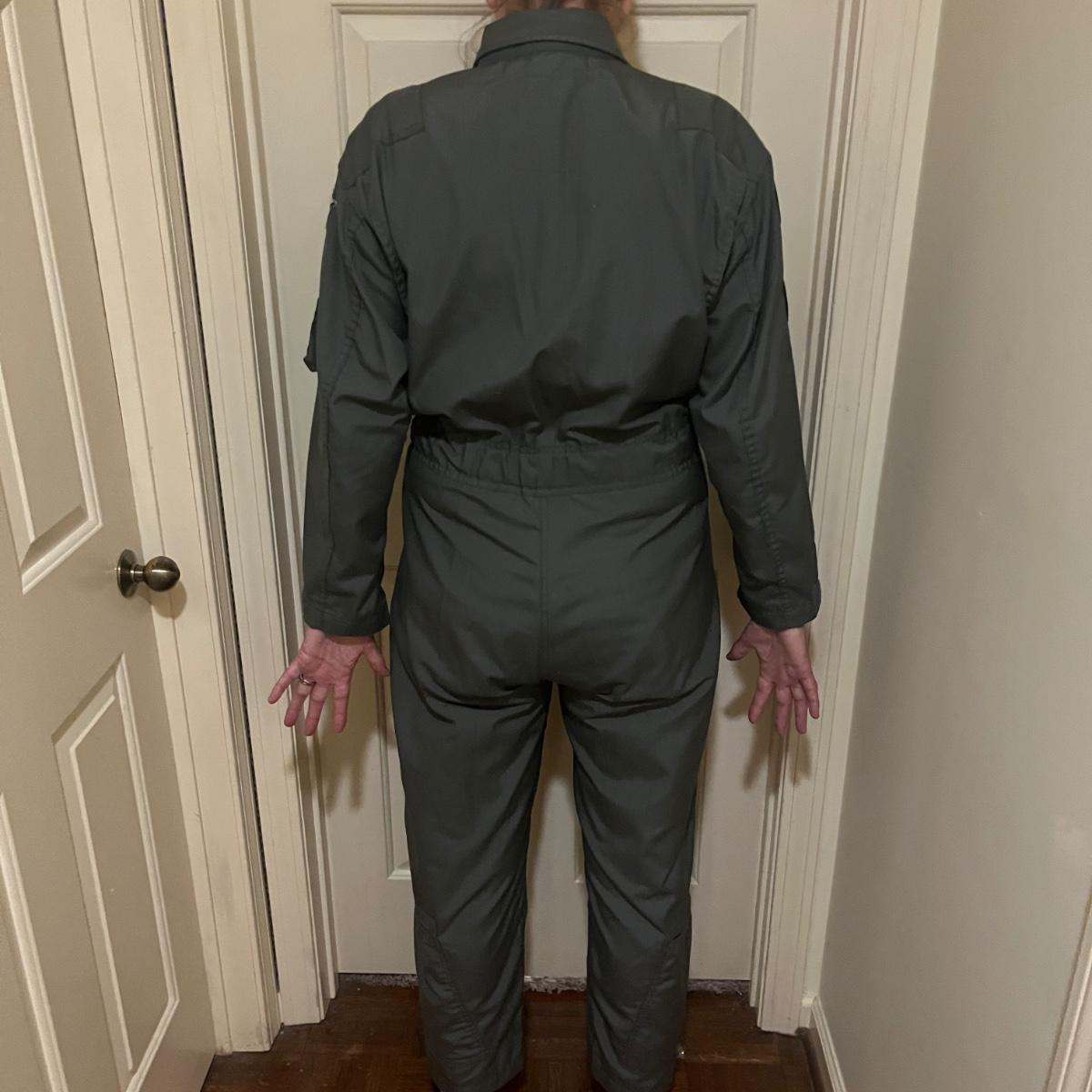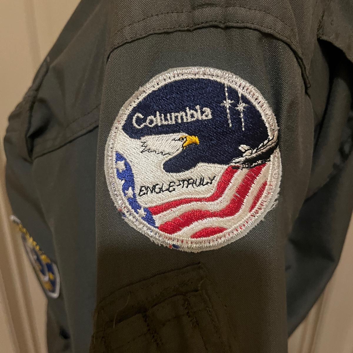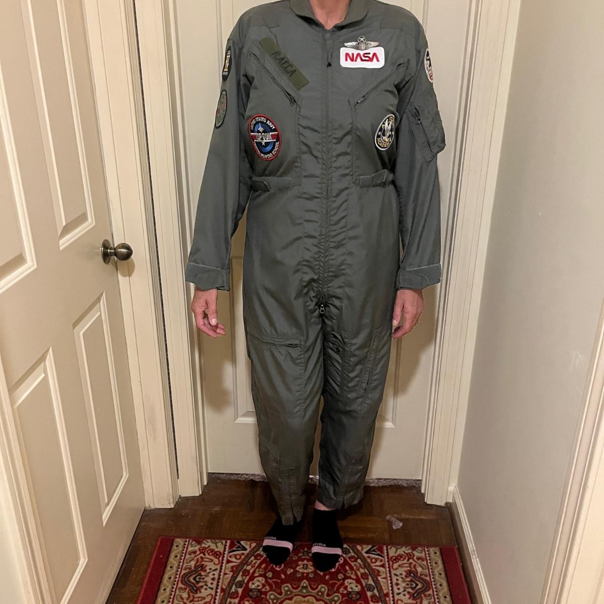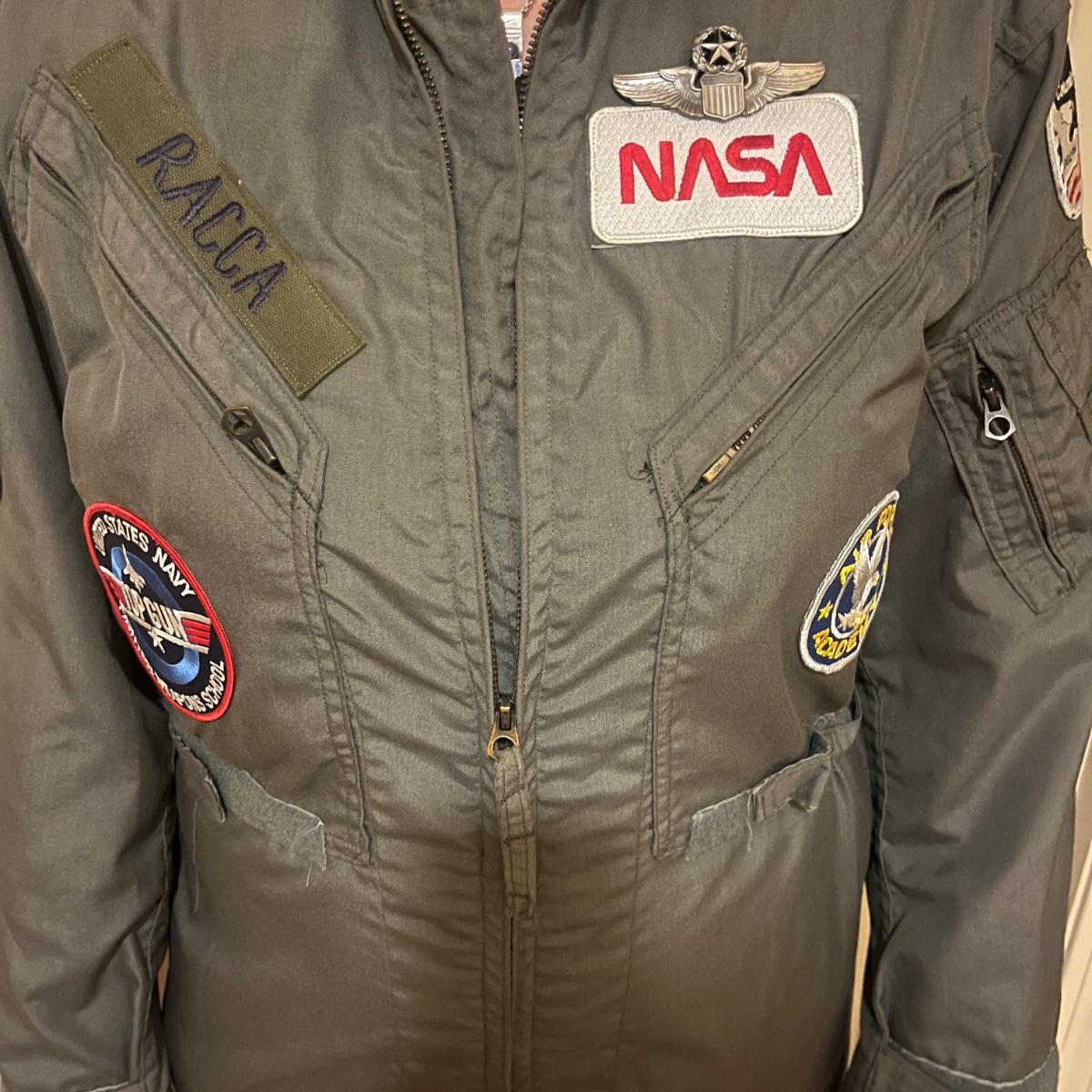 This jumpsuit has patches from Top Gun, Columbia, Air Force Academy, NASA, Gemini and Rapid Deployment Force. Jumpsuit measures 22” chest, 18” hips and 29” inseam. Also has a metal pair of wings.
