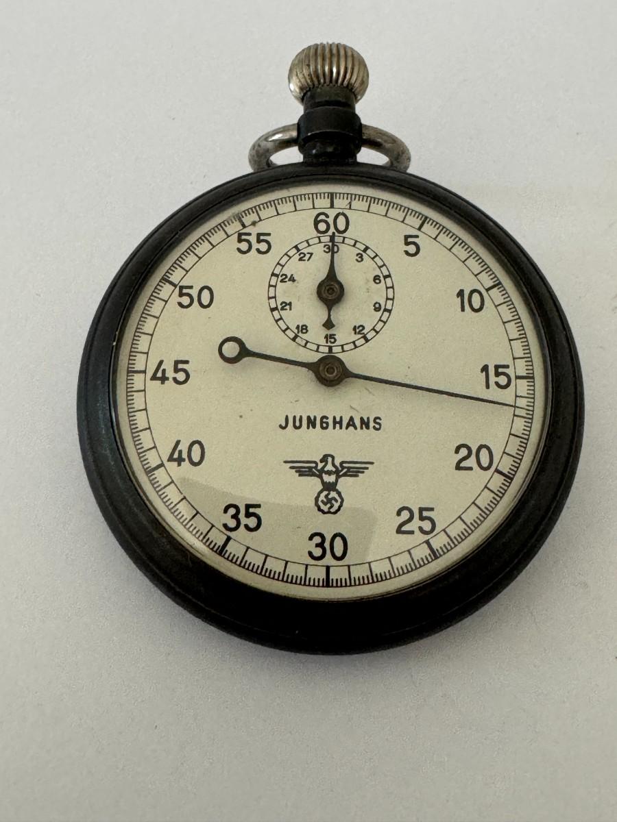 Kriegsmarine Markings: Original Kriegsmarine-issued Junghans stopwatches usually have the "KM" (Kriegsmarine) marking and a German national eagle with a swastika engraved on the case back, though some later examples might have them on the dial.