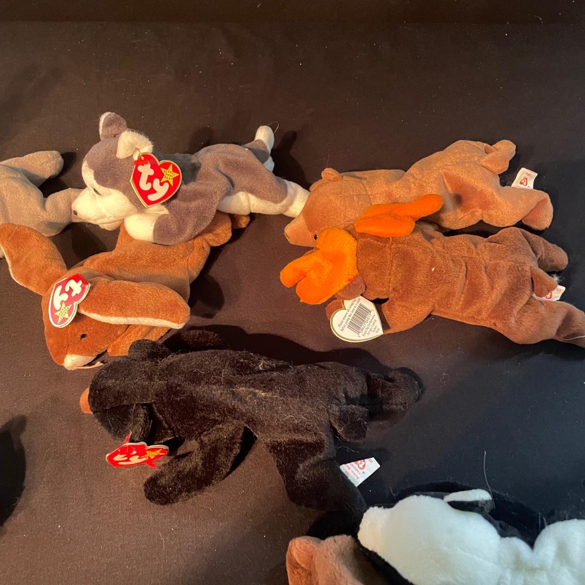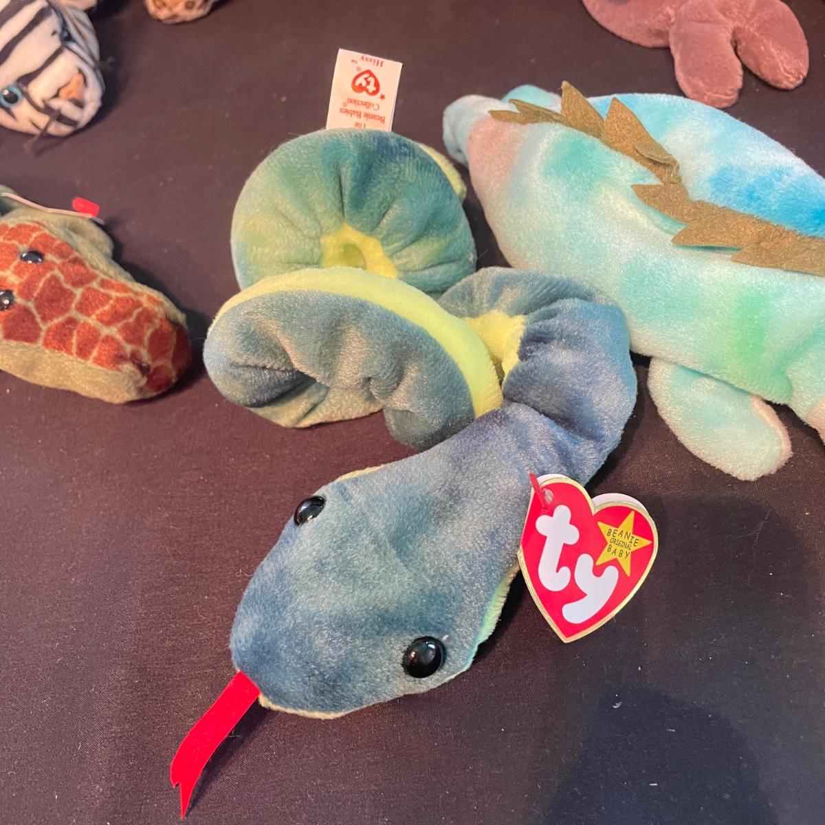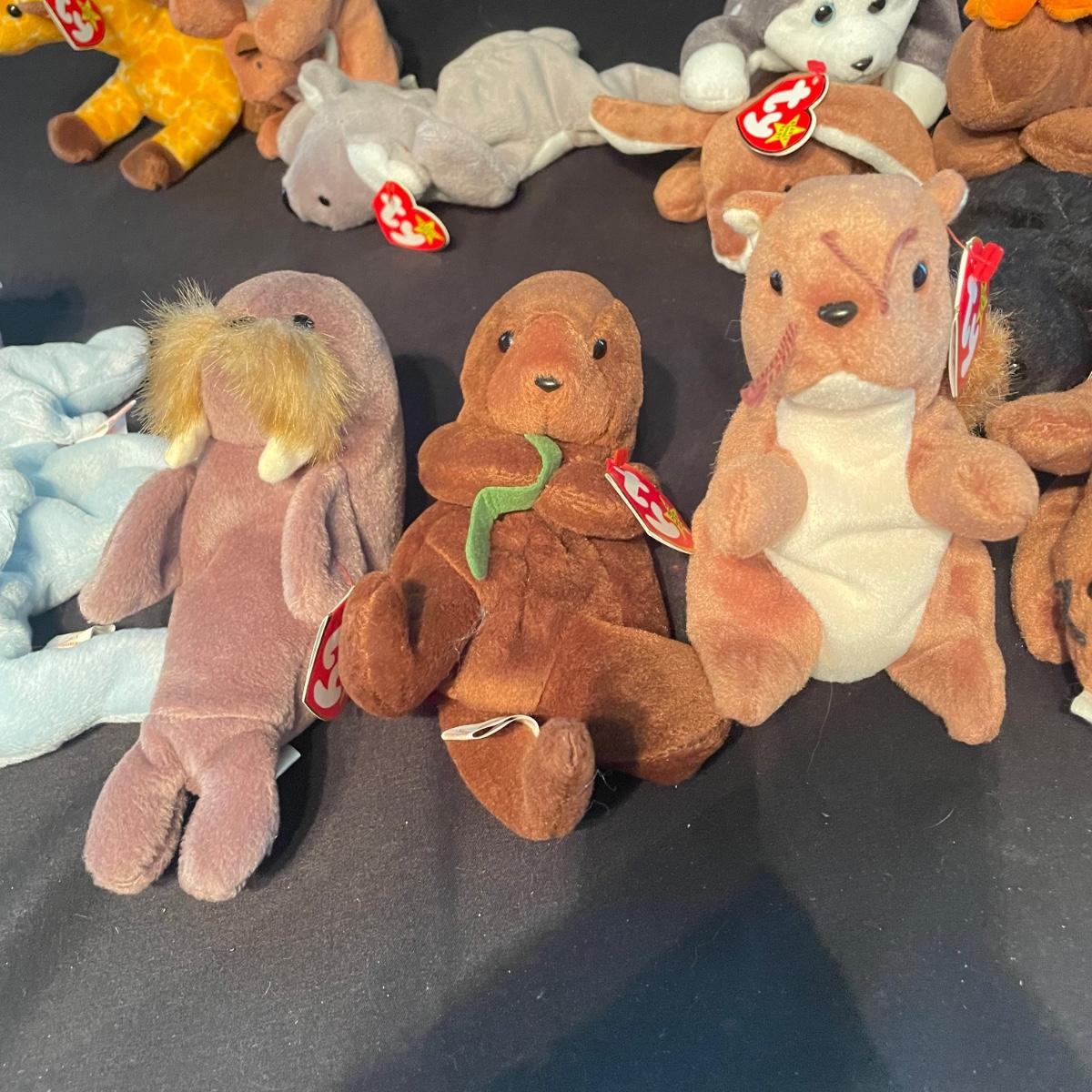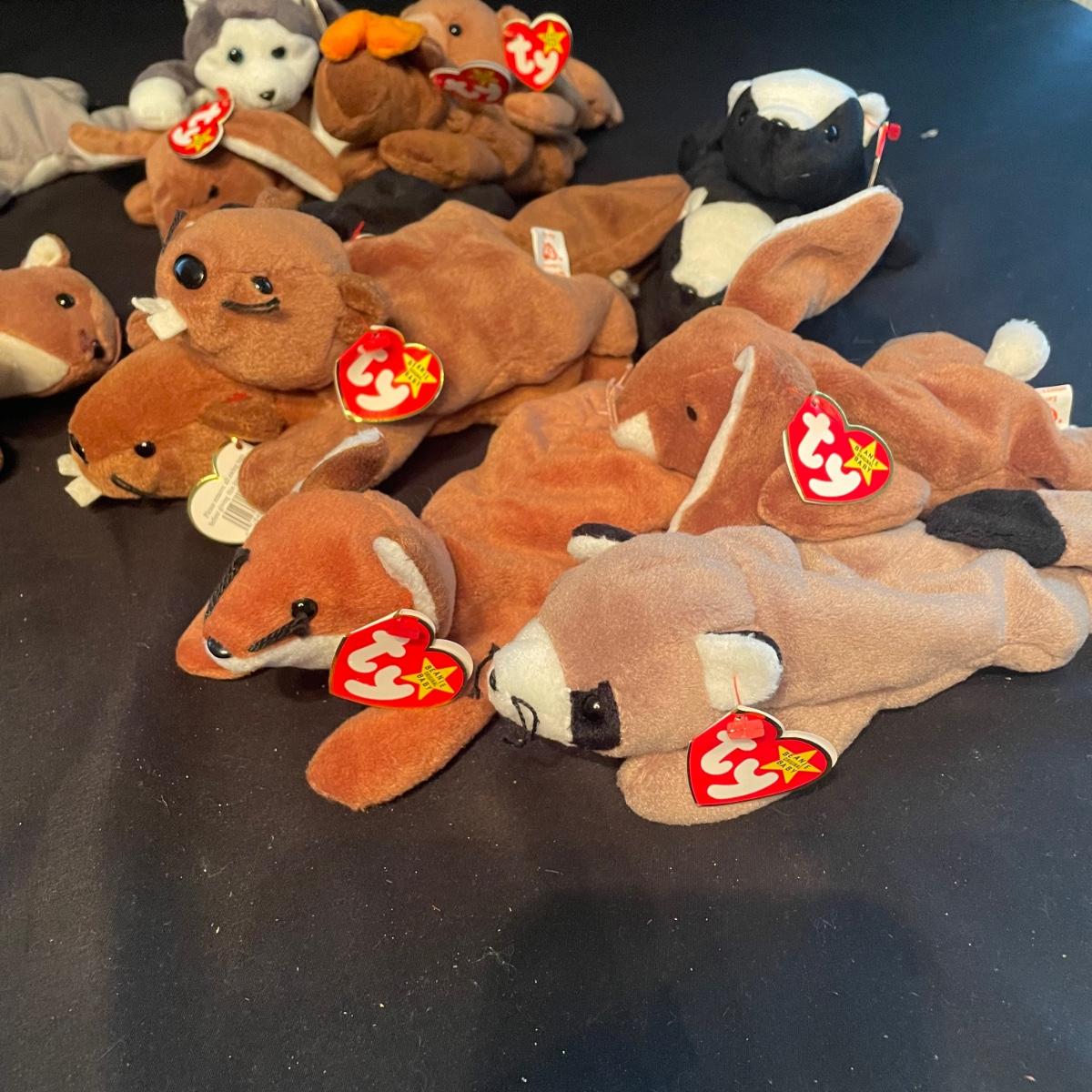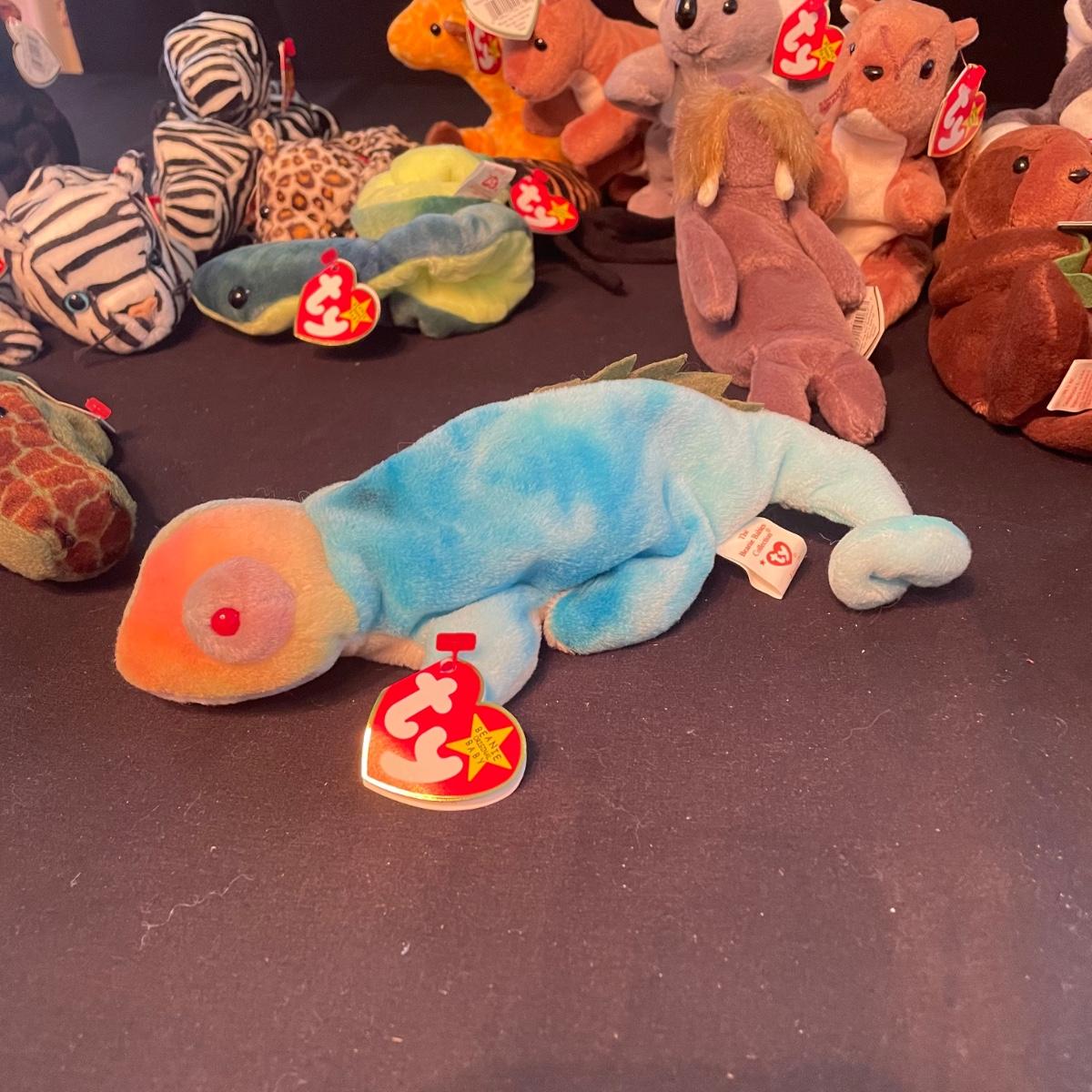 Over thirty Beanie Babies with tags including a 1997 Iggy, Hissy. Most animals are from 1995 and 1996. Cubbie and Chocolate are the oldest from 1993. There is one Stinky without tags and a spot on its back, see photos. The rest appear to be without blemishes and have the original TY tags. See images. Shipping available.