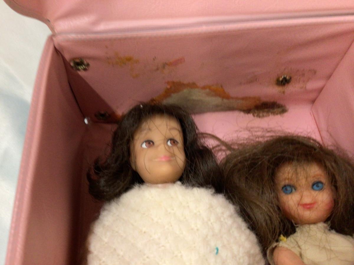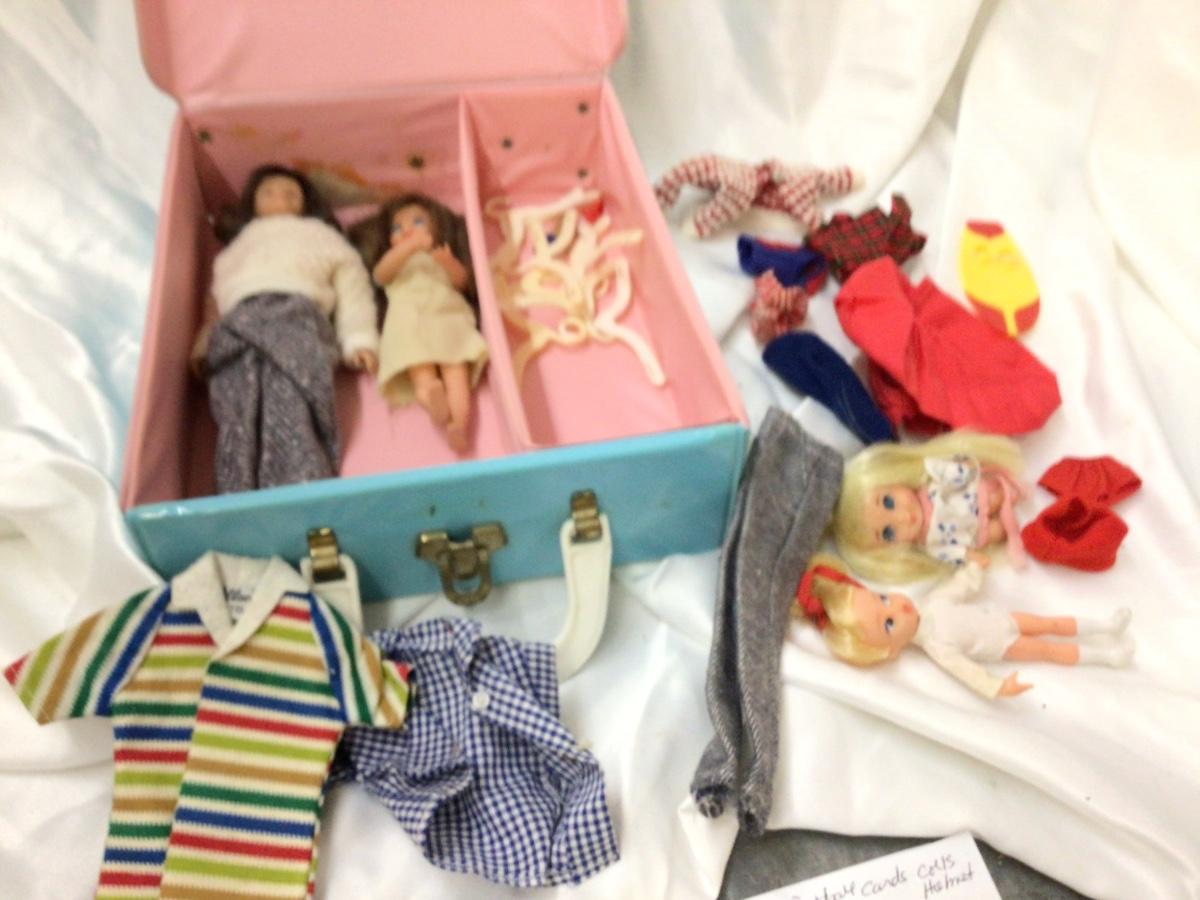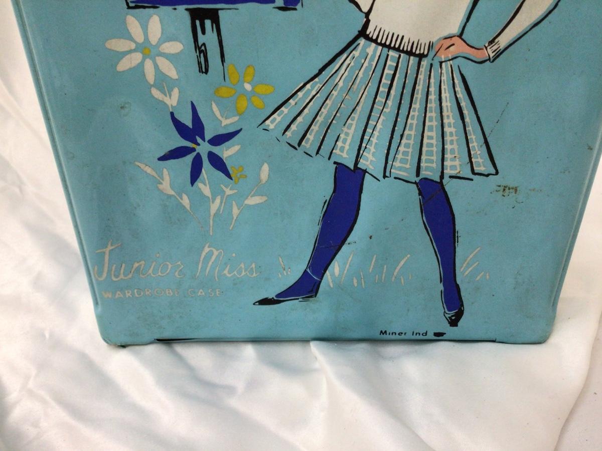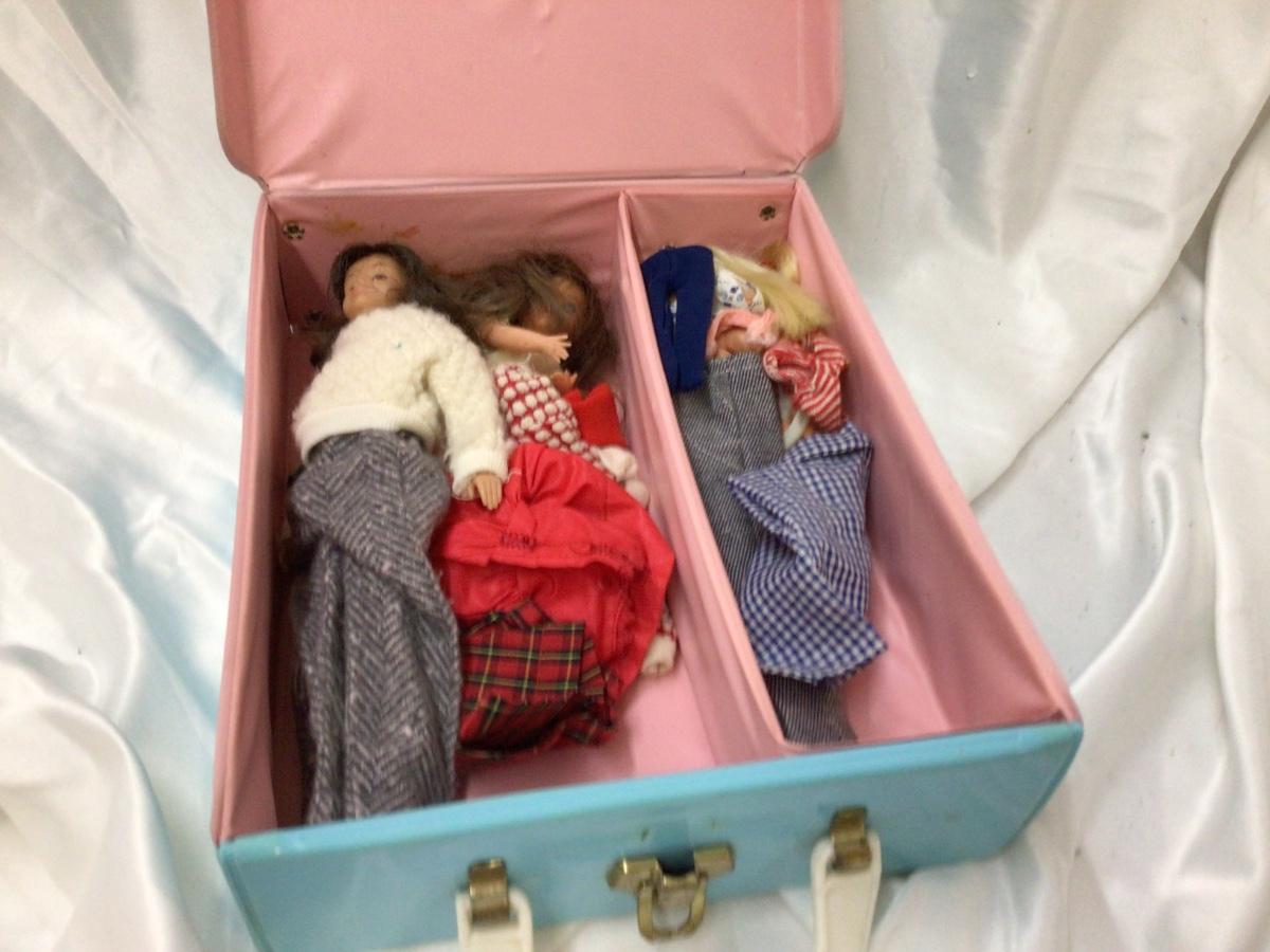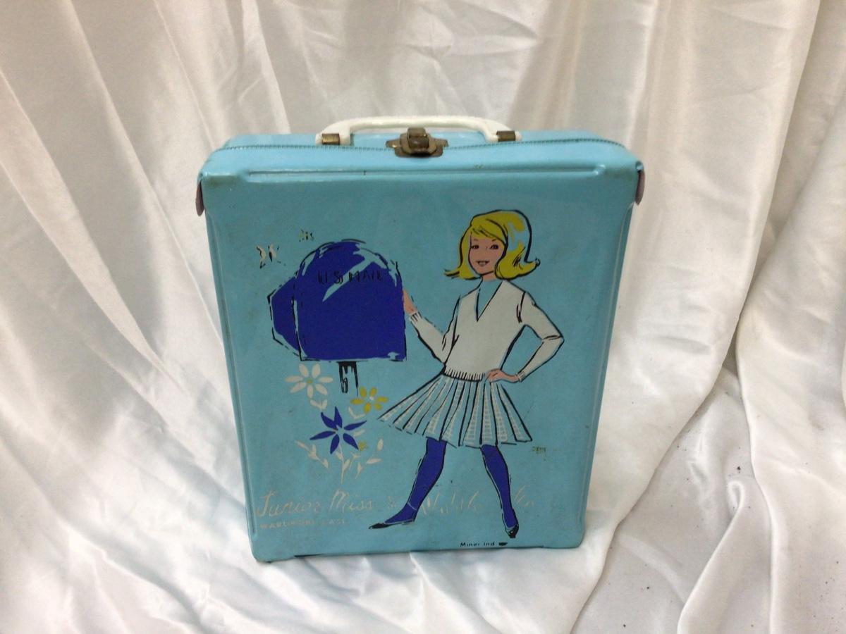 This is a great Junior Misses Wardrobe Case. You get an adult, junior, and two children dolls. Plus clothes and hangers and a surf board. Some damage to inside of case could be cleaned up some. See pics.
