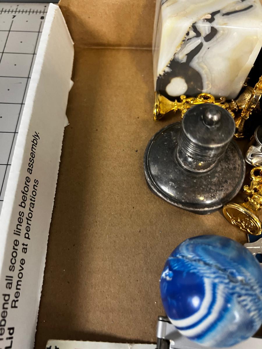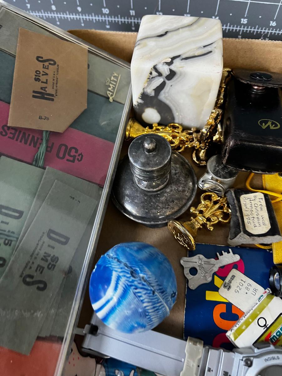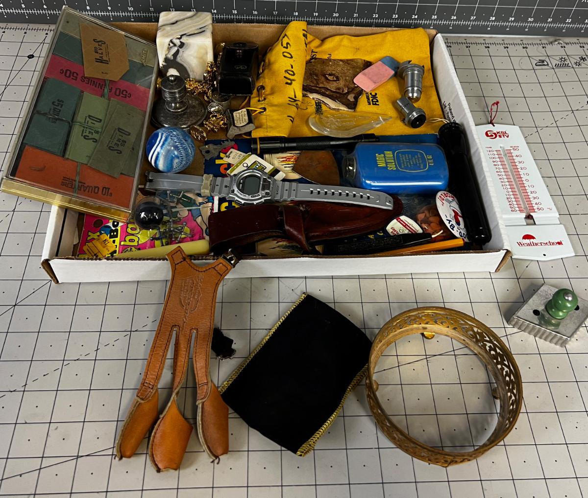 Junk Drawer Clean out: Paper Weight, Knife sheath, Bank Bag, Super Ball