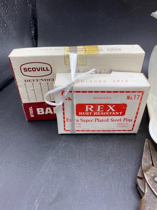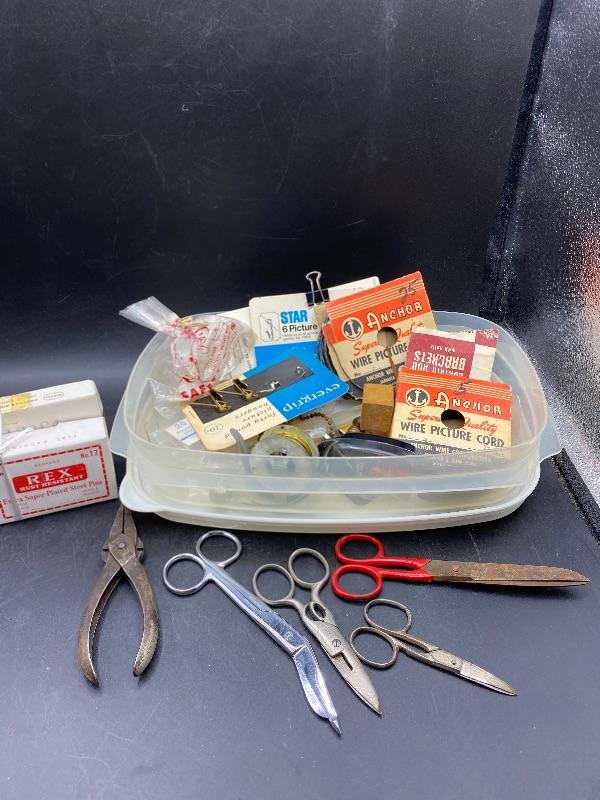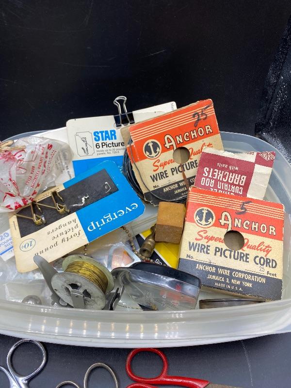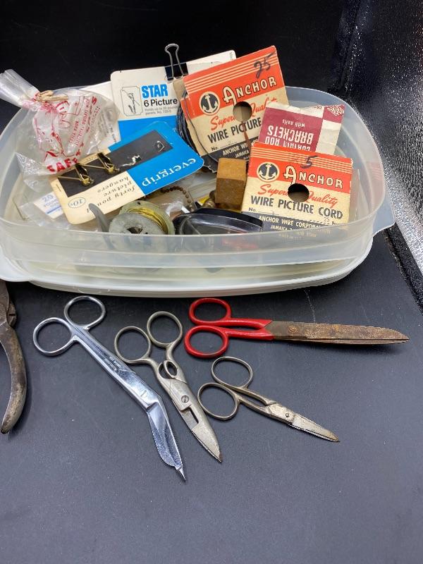 Random junk drawer item lot. Scissors, picture hanging items, upholstery pins.