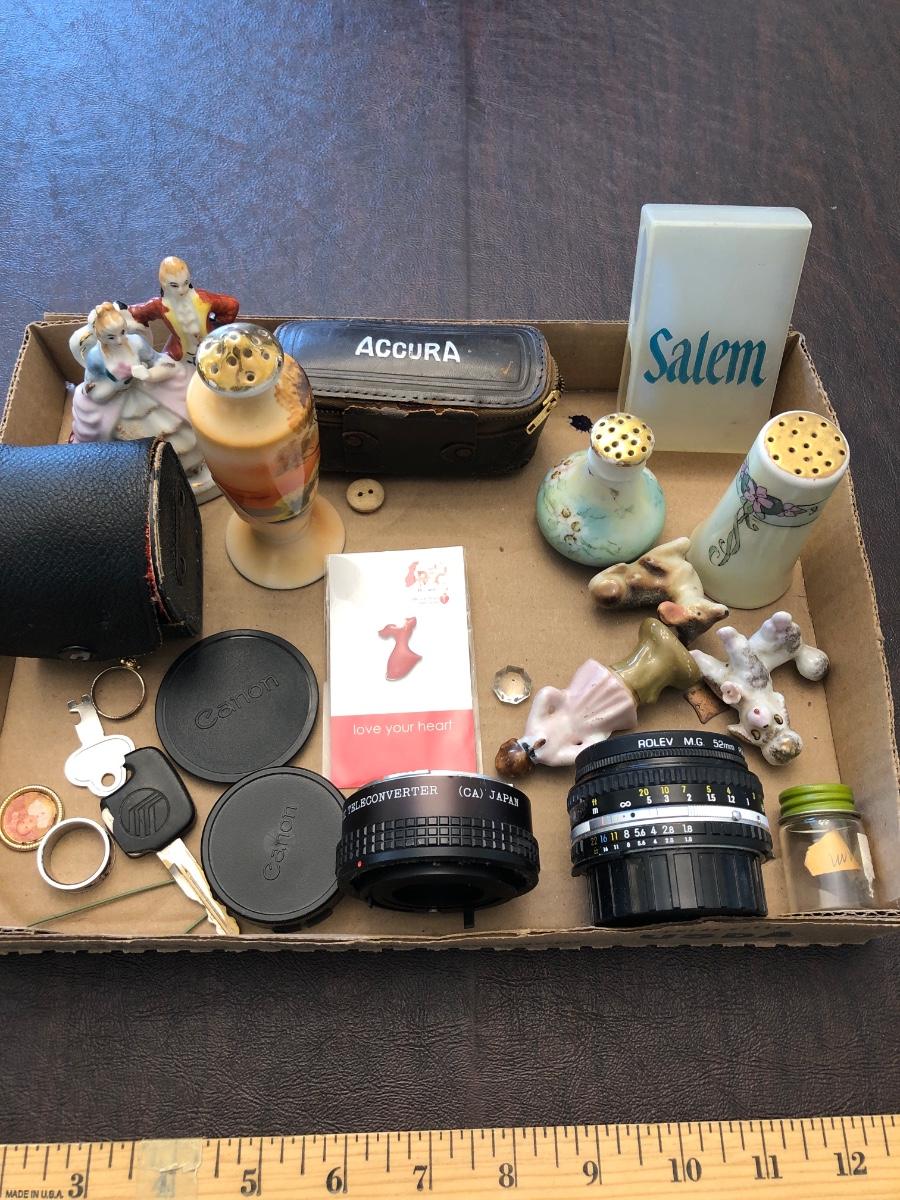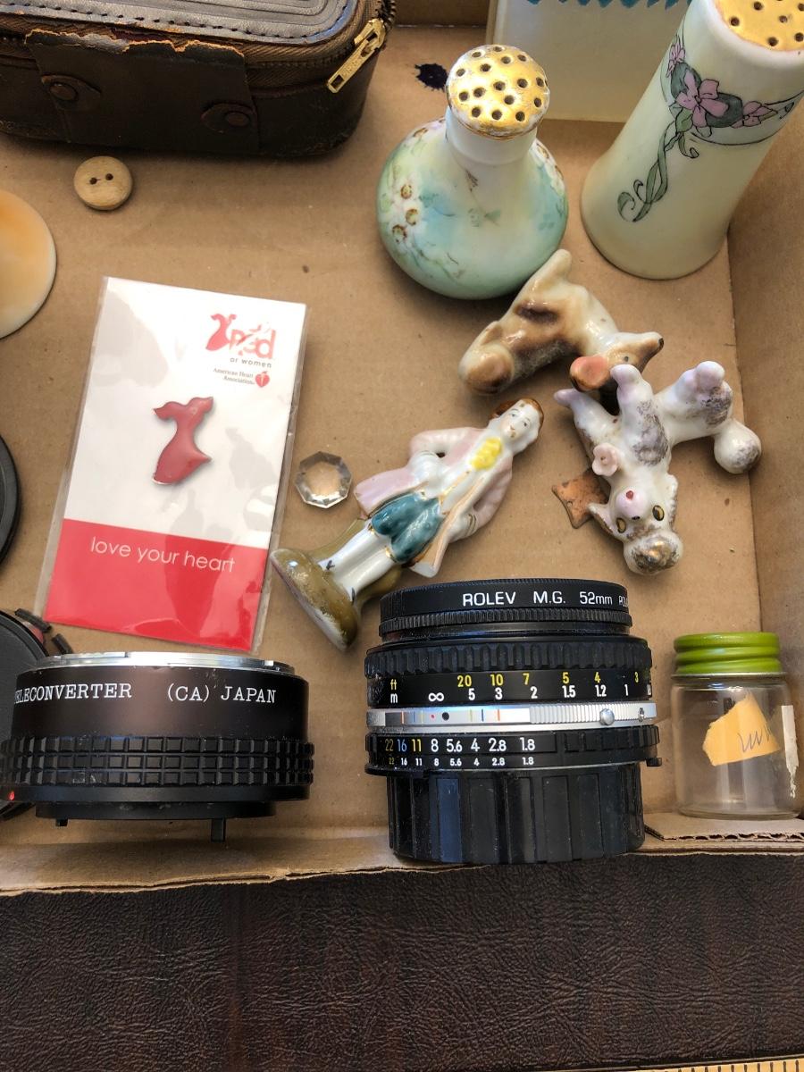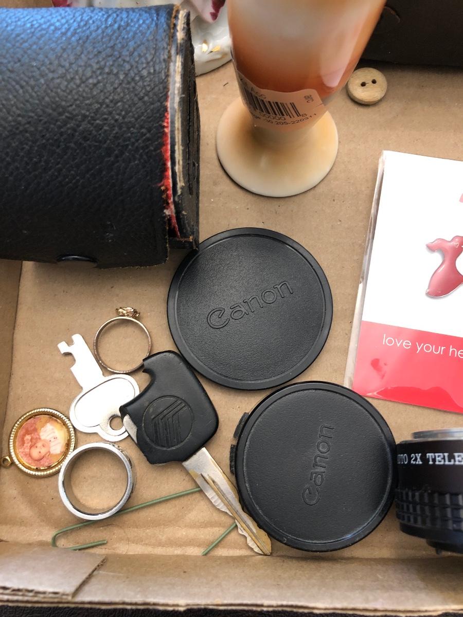 Next lot, including keys, rings, camera, lenses, hat pin holders, and more. See pictures.