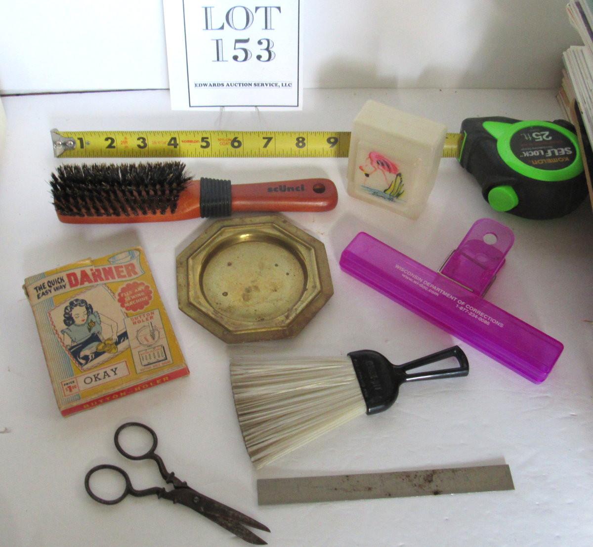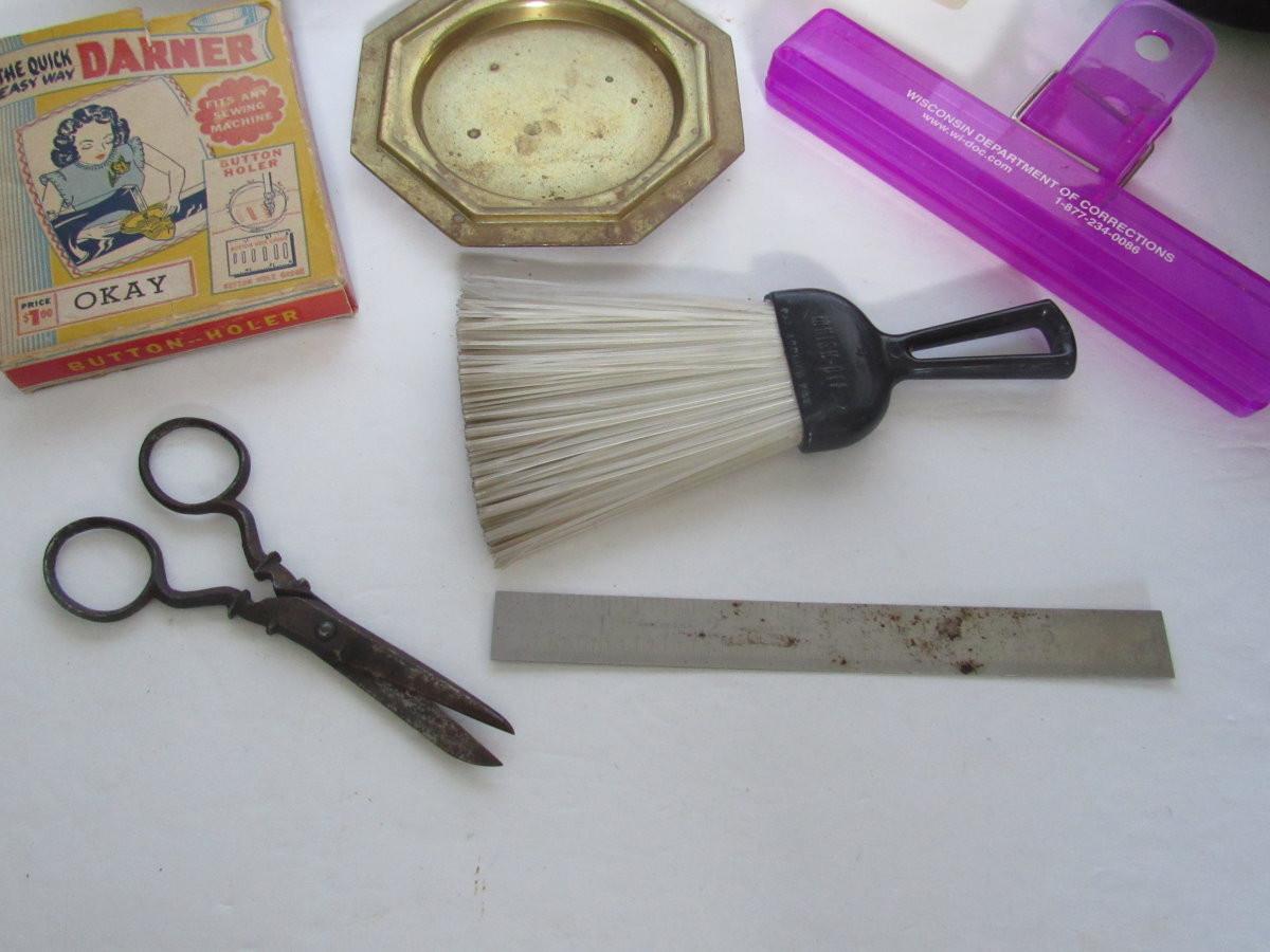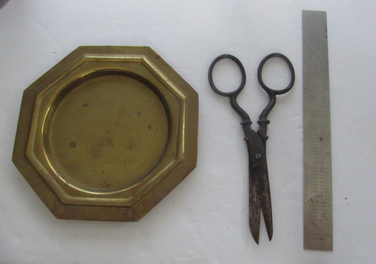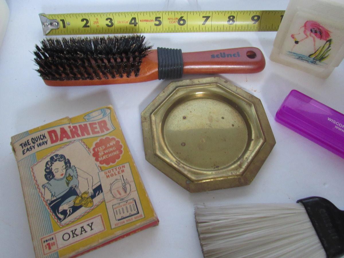 Brass small tray, vintage darner, older soap holder, metal ruler, more. Shipping is available on this lot with additional shipping and handling fees. See our terms for details.
