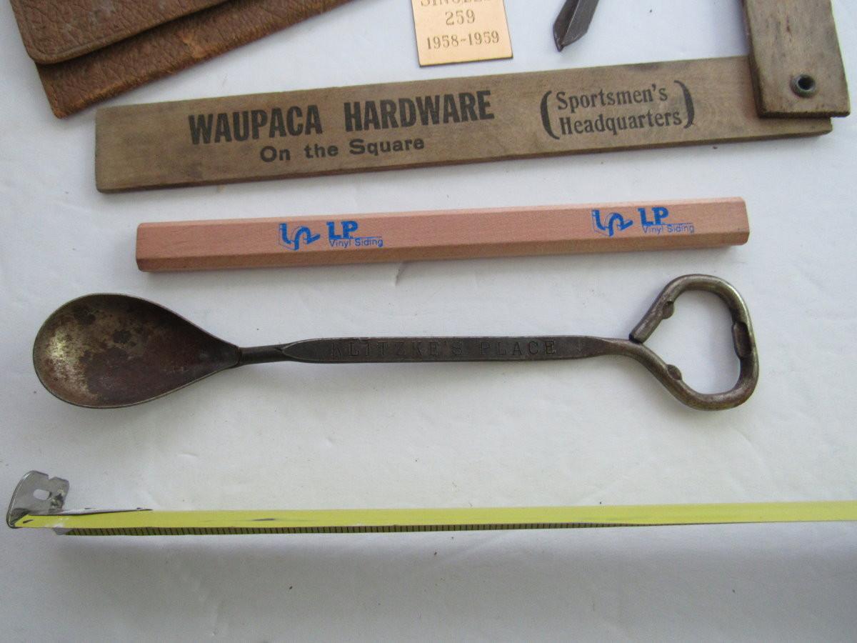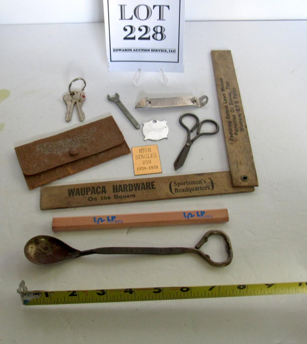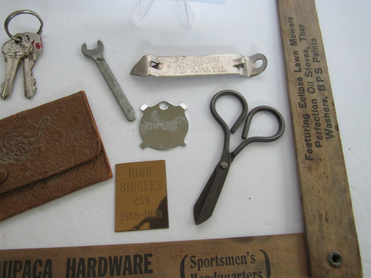 Junk Drawer Lot: Advertising Items Ruler, Pencil, Lydia Pinkhams Coin Purse, More