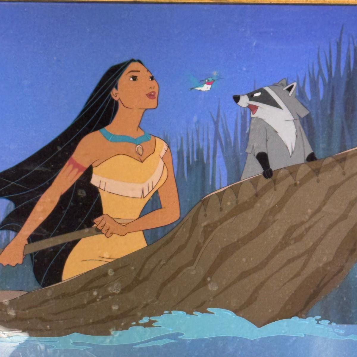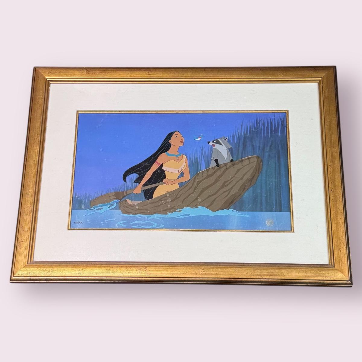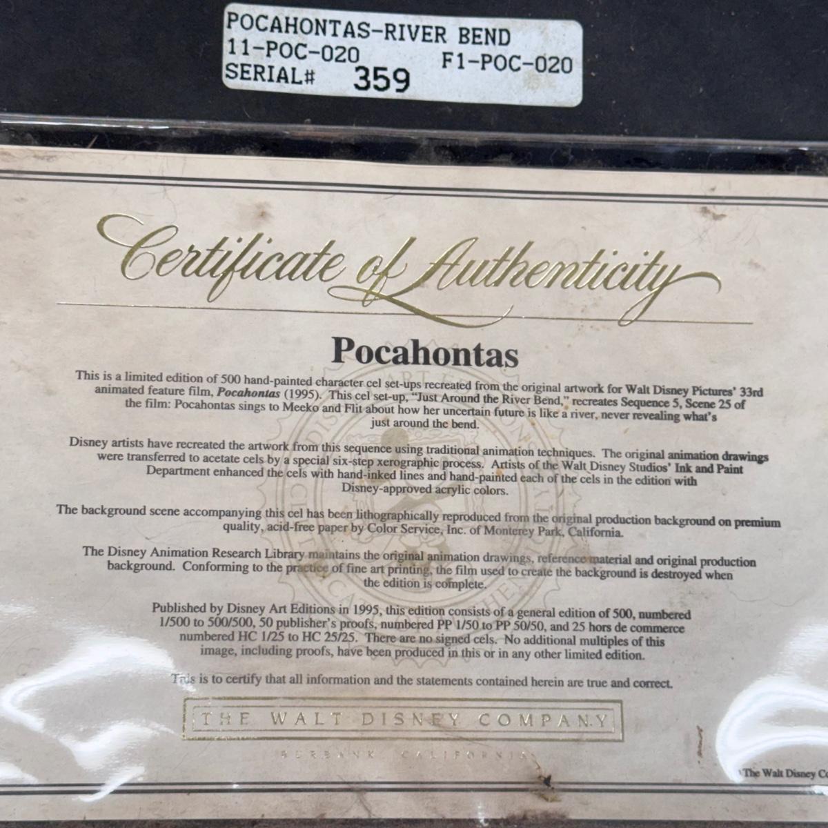 This lot includes one Walt Disney cel titled “Just Around the River Bend” from the movie “Pocahontas.” The cel is numbered 359/500 and stamped with “The Walt Disney Company.” The art is protected a plastic layer, matting, and a wooden frame that’s been painted a metallic bronze color. The original invoice and certificate of authenticity are included - see the last few pictures.