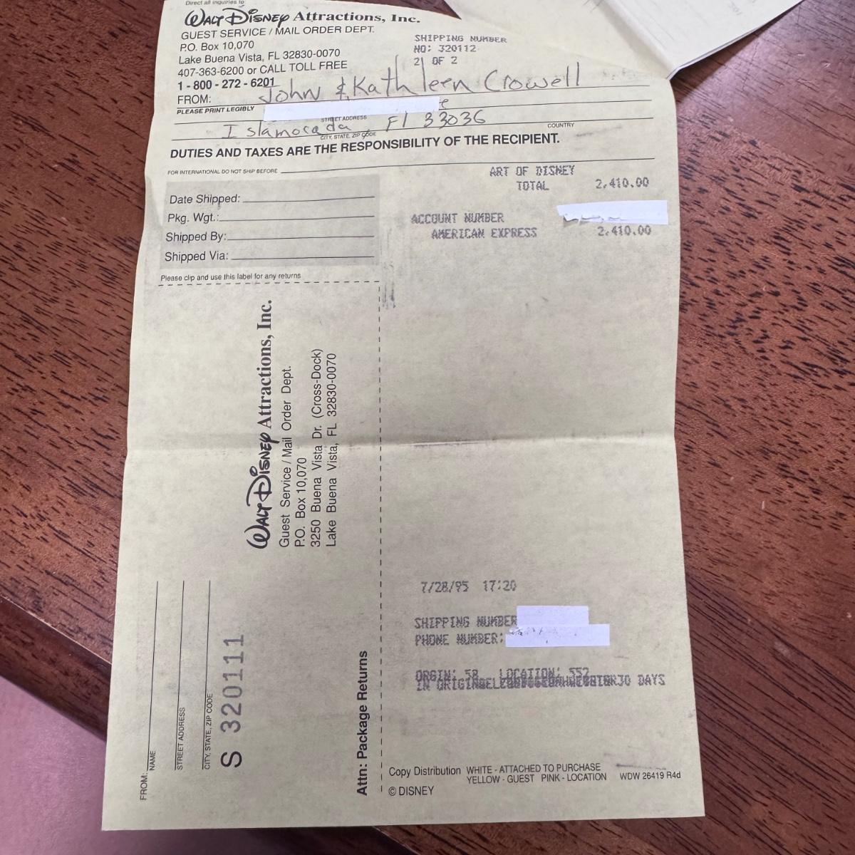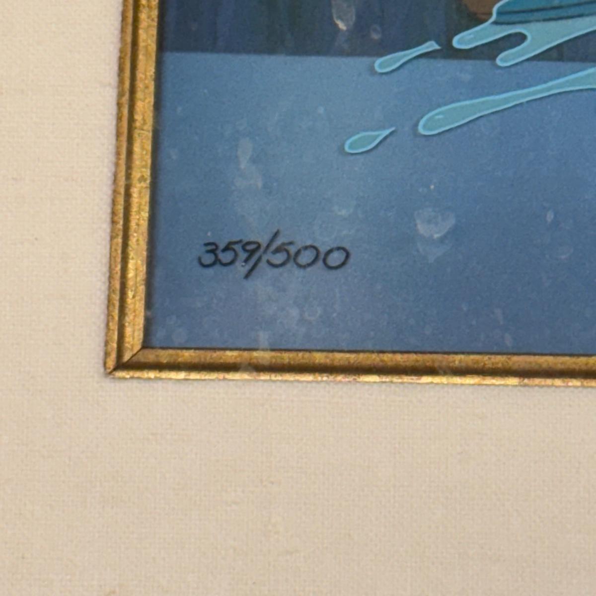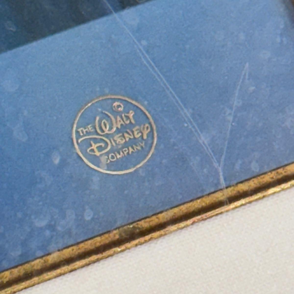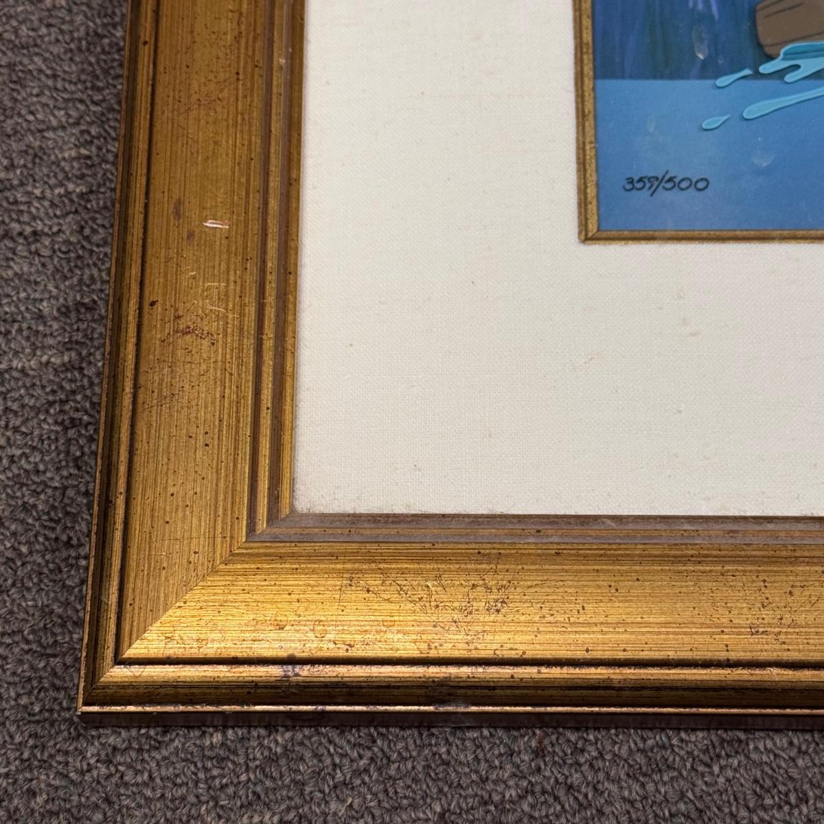 This lot includes one Walt Disney cel titled “Just Around the River Bend” from the movie “Pocahontas.” The cel is numbered 359/500 and stamped with “The Walt Disney Company.” The art is protected a plastic layer, matting, and a wooden frame that’s been painted a metallic bronze color. The original invoice and certificate of authenticity are included - see the last few pictures.