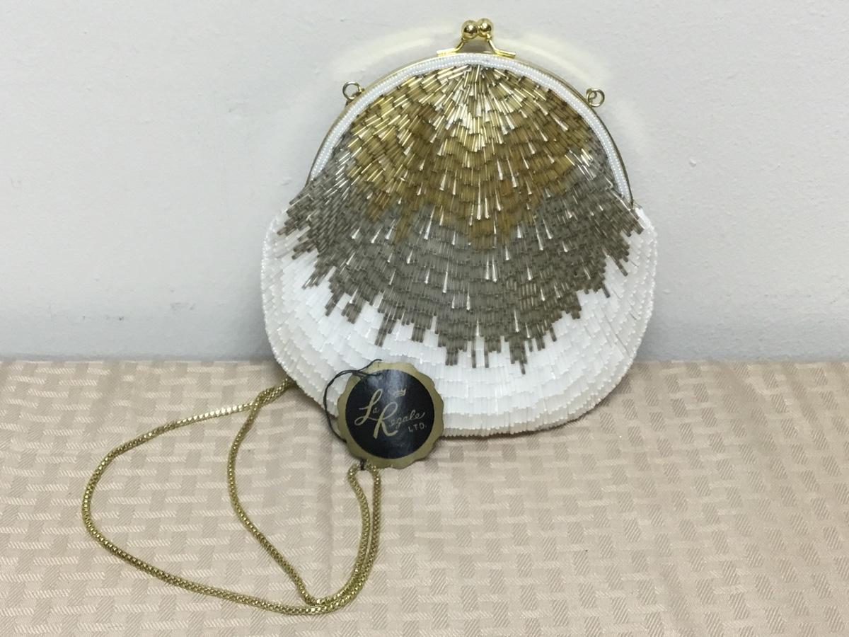 Vintage Gold Silver & White Beaded Purse Clutch Evening Bag. Has original maker hang tag attached. Long gold chain strap. Nicely done. About 7" size. Made by La Regale.