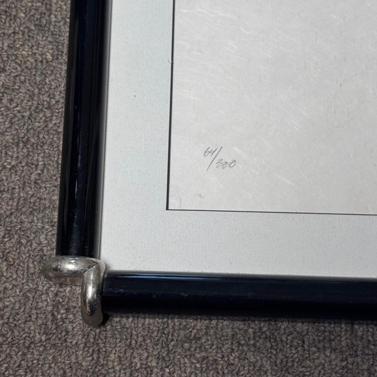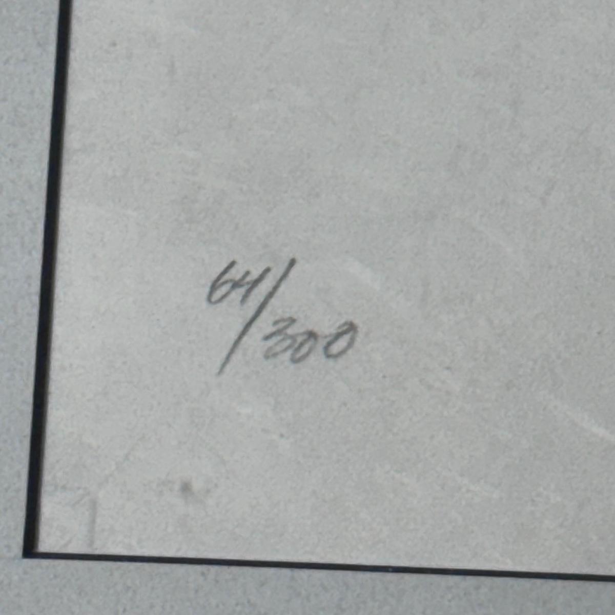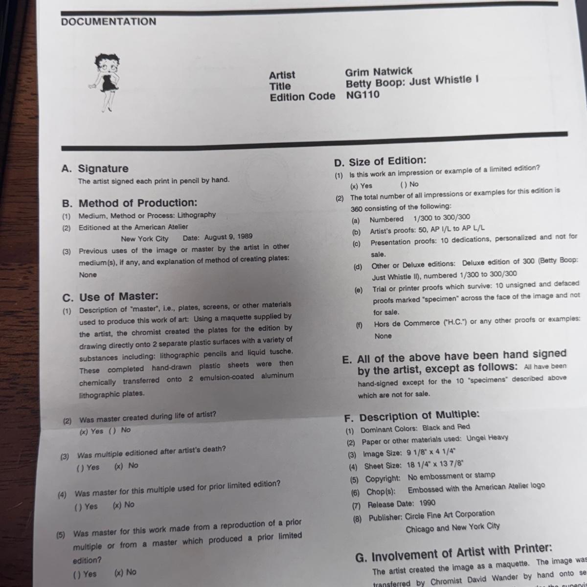 This lot includes one lithograph of Betty Boop by Grim Natwik titled “Just Whistle.” The lithograph is numbered 64/300. It is signed in the bottom right corner with “Grim.” The lithograph is protected with a plastic sheet, matting, and a wooden frame with a black plastic protective layer and silver-colored ends. The frame measures 16.5” x 21”H. The original invoice is included.