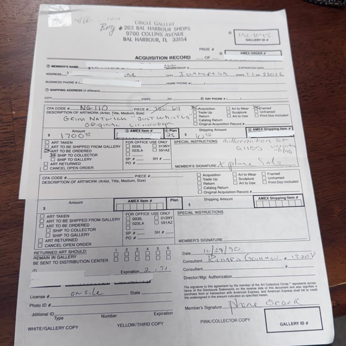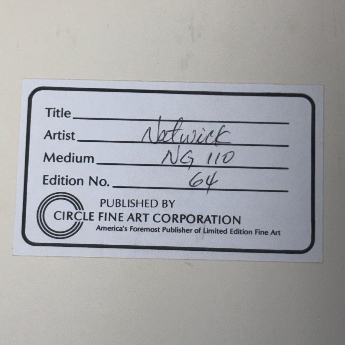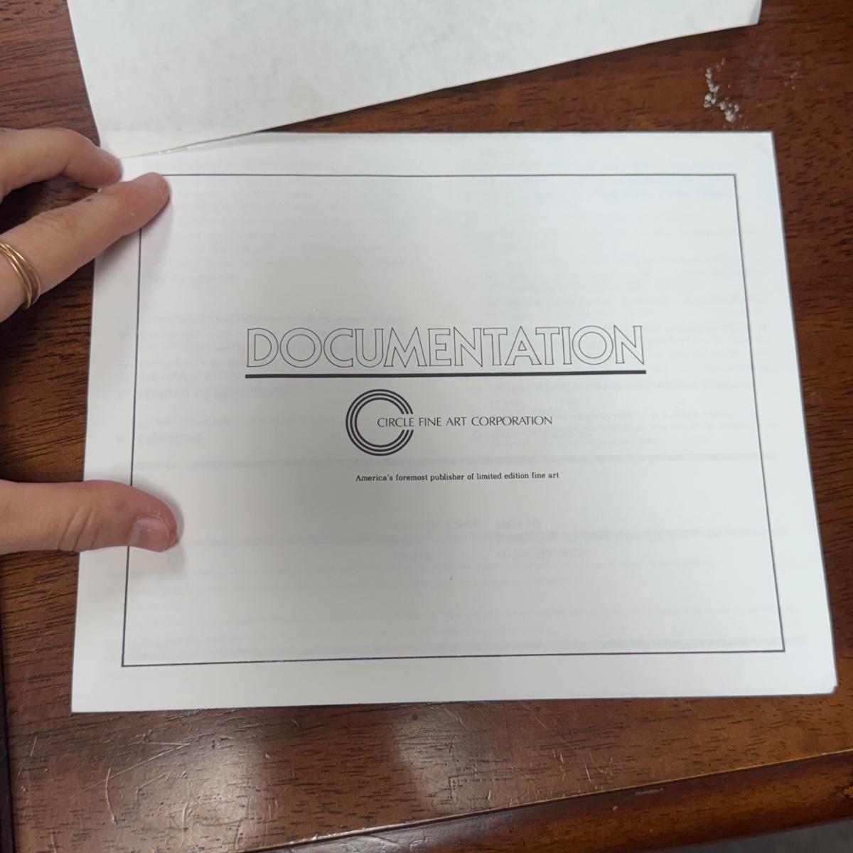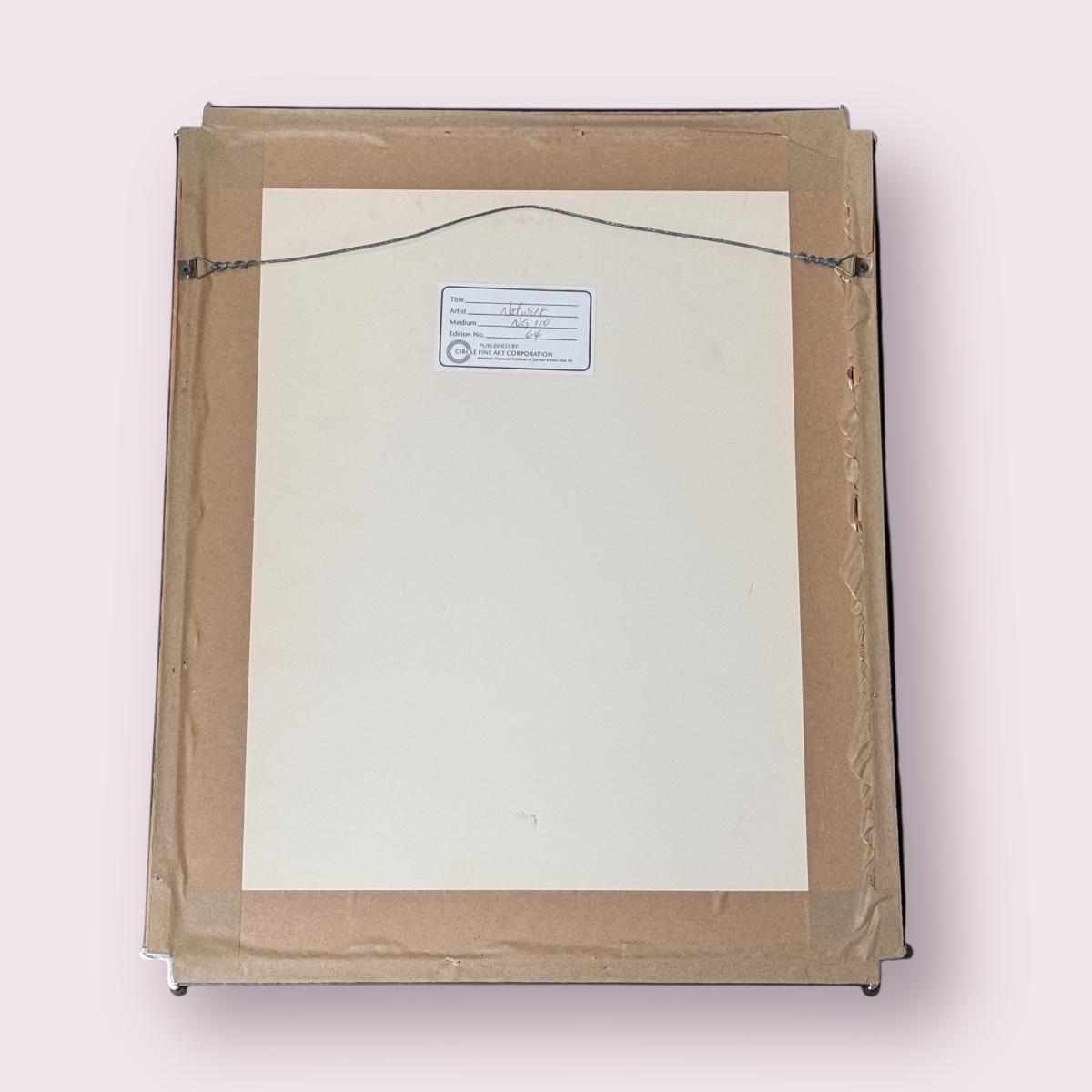 This lot includes one lithograph of Betty Boop by Grim Natwik titled “Just Whistle.” The lithograph is numbered 64/300. It is signed in the bottom right corner with “Grim.” The lithograph is protected with a plastic sheet, matting, and a wooden frame with a black plastic protective layer and silver-colored ends. The frame measures 16.5” x 21”H. The original invoice is included.