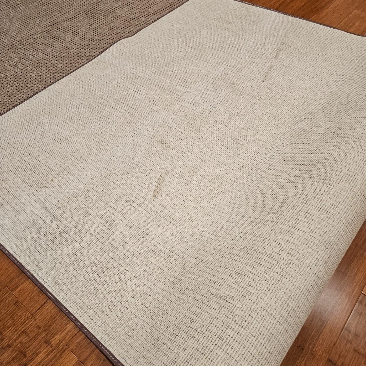 Soft tan and brown short pile rug with jute back and bound edges. Rug measures 5'10" x 17'4" long. One small spot along edge. See photos for details.