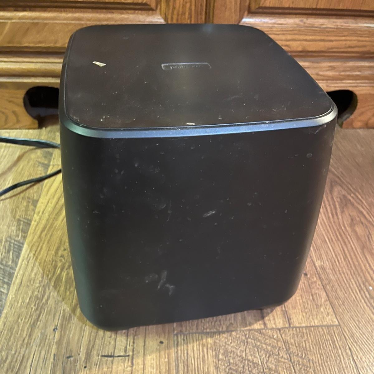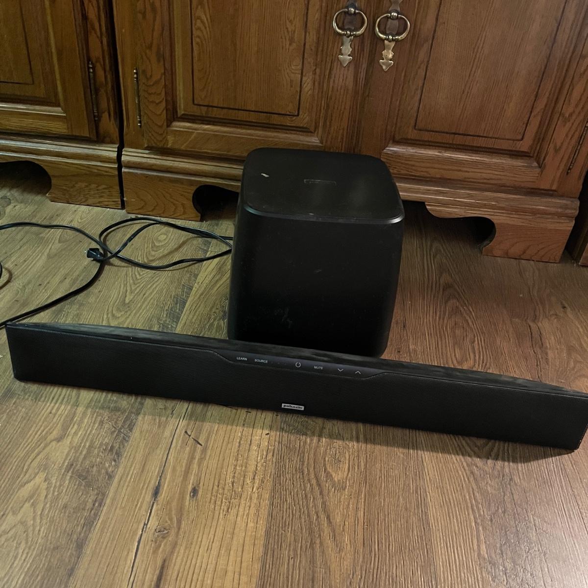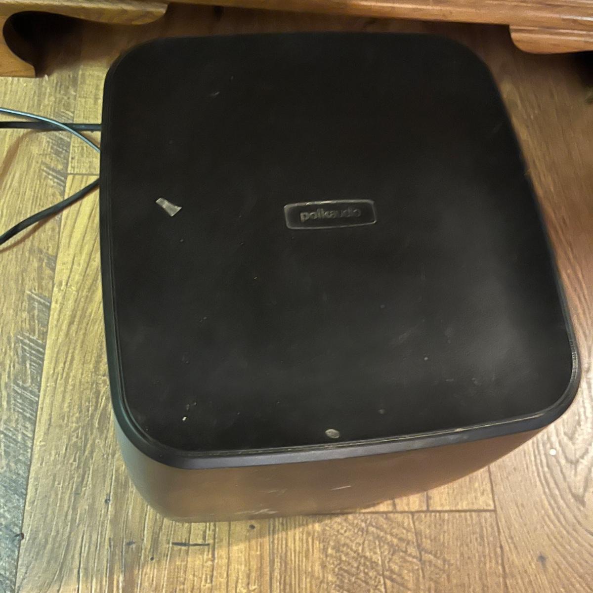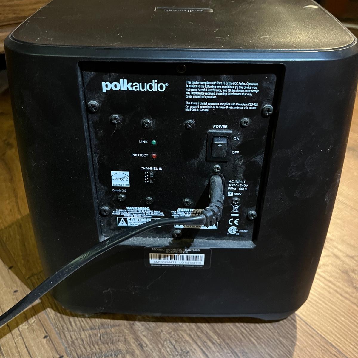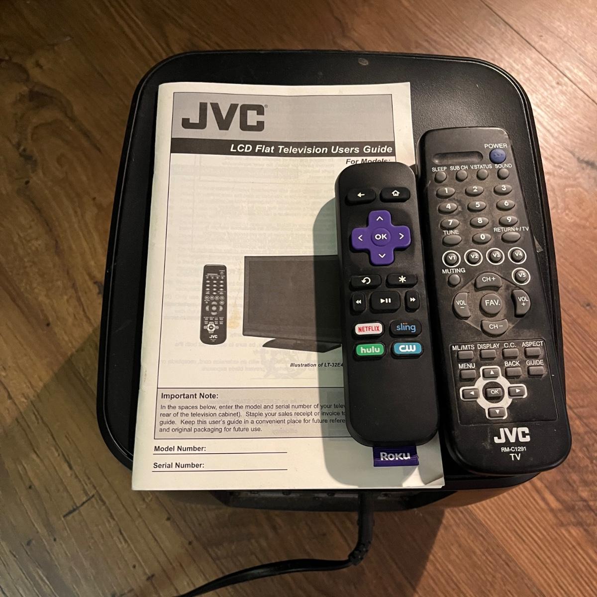 Lot includes a 32” JVC TV with remote, Polk Audio sub woofer and sound bar and a Roku with remote. All items powered by on when plugged in. Sound bar measures 31” x 3” x 3”H and sub woofer measures 12” x 12” x 10” H.
