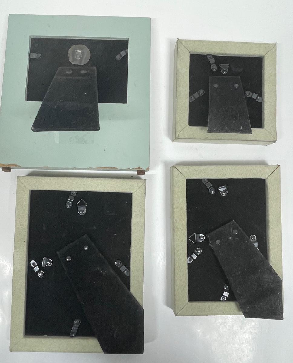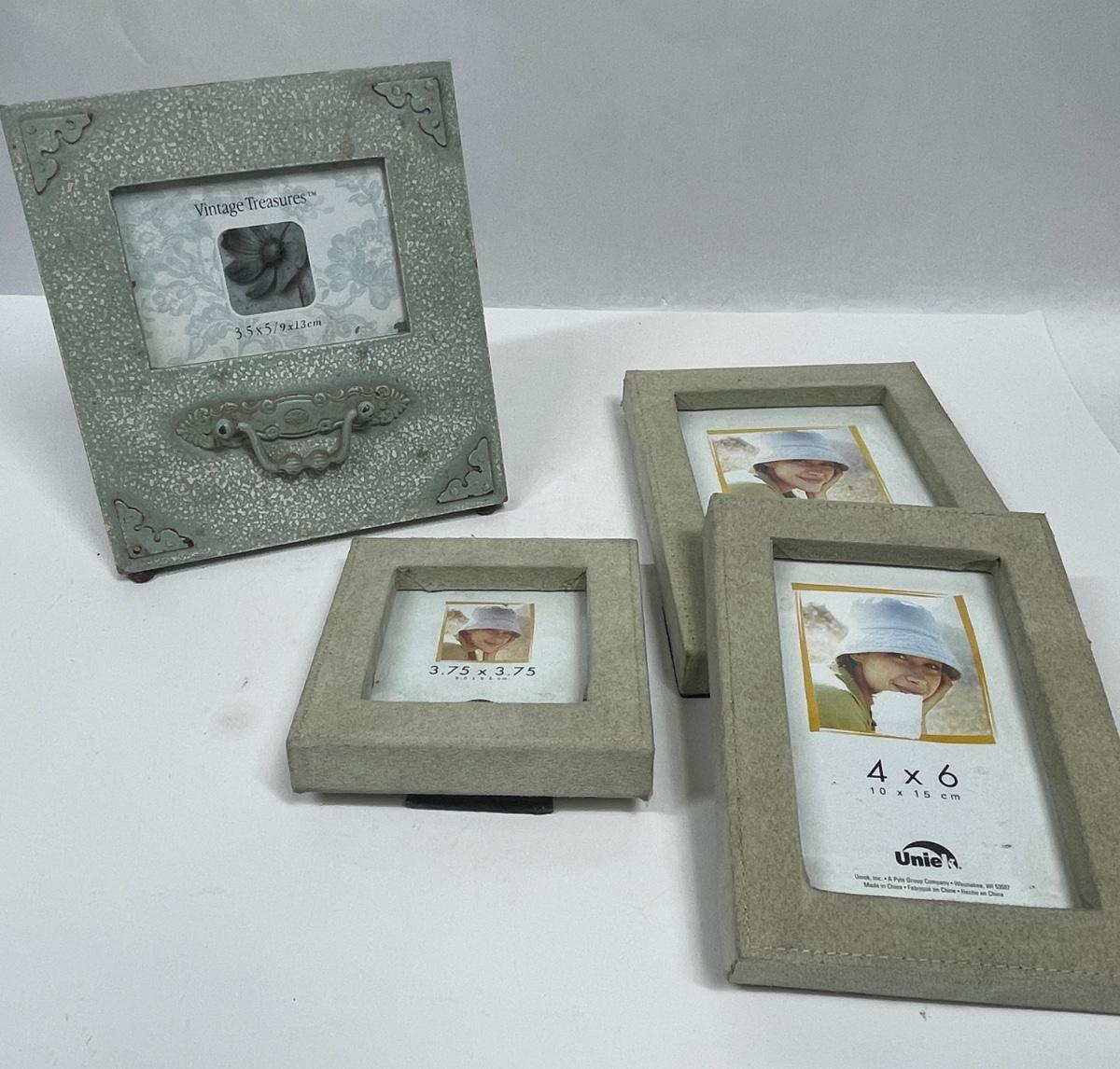 In good condition. 3 are covered in stitched suede, holds photos sized 3.75" x 3.75", 4" x 6" and 5" x 7". Other frame has cabinet hardware attached, holds a 3.5" x 5" photo.