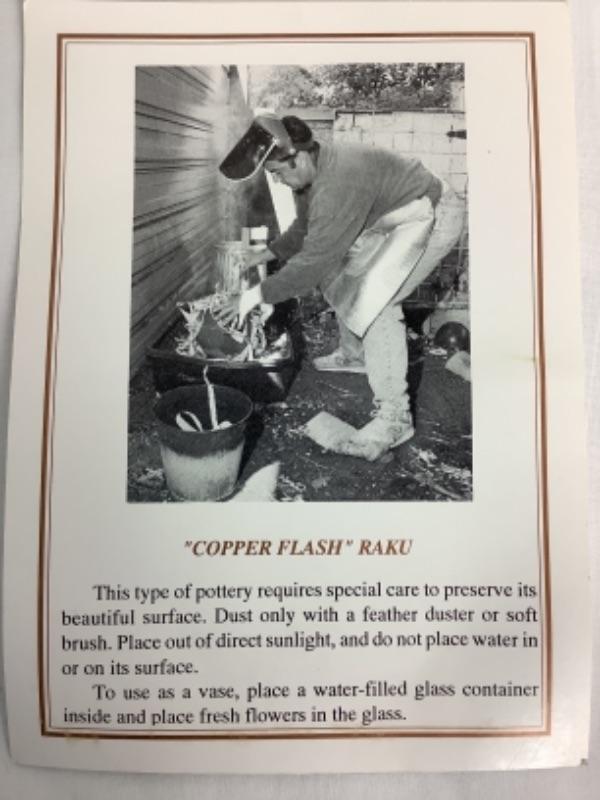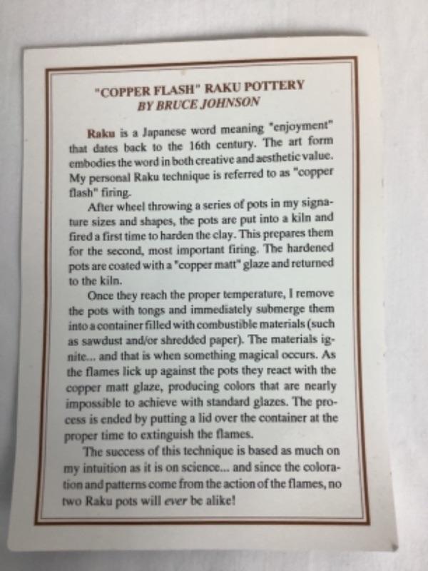 Signed “ Copper Flash “ Raku Pottery by Bruce Johnson