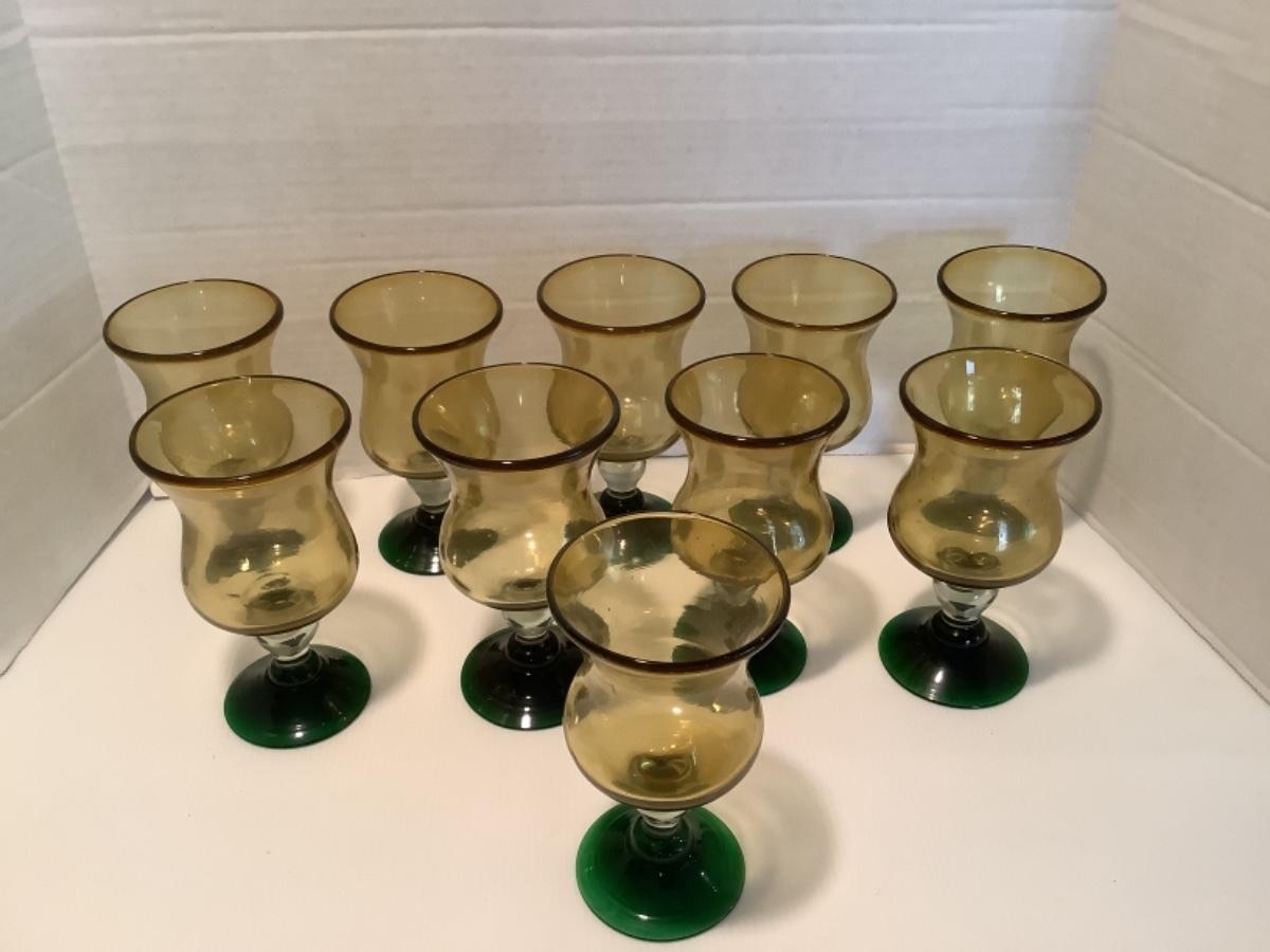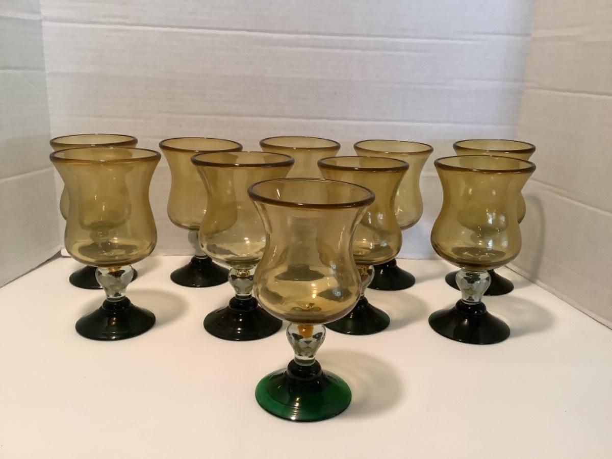 Set of Amber & Green Base Recycled Hand Blown Glass Goblets - ( 10 )