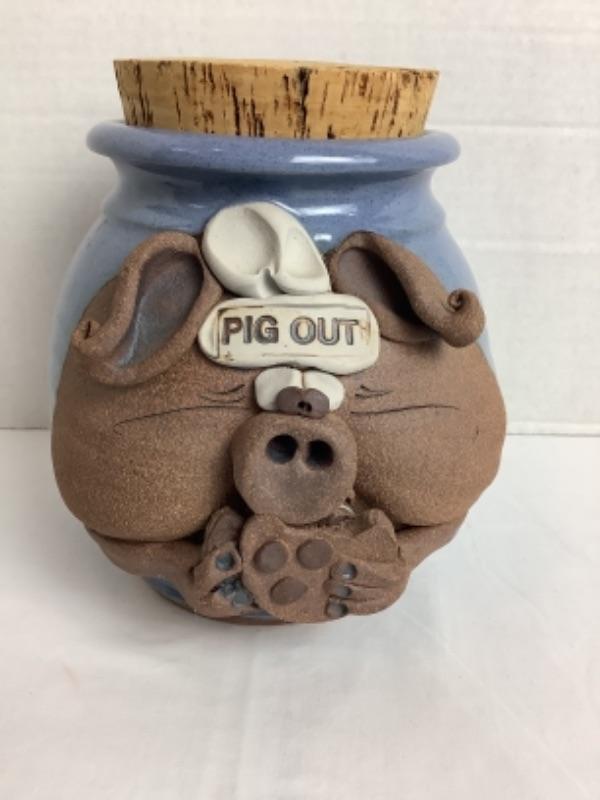 Pottery “ Pig Out “ Pig Cookie Jar with Cork Top,