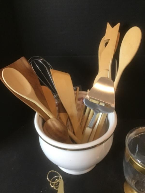White with Gold Trim Utensil Jar with Several Wooden Utensils - 6.25” Tall x 7.75” Round