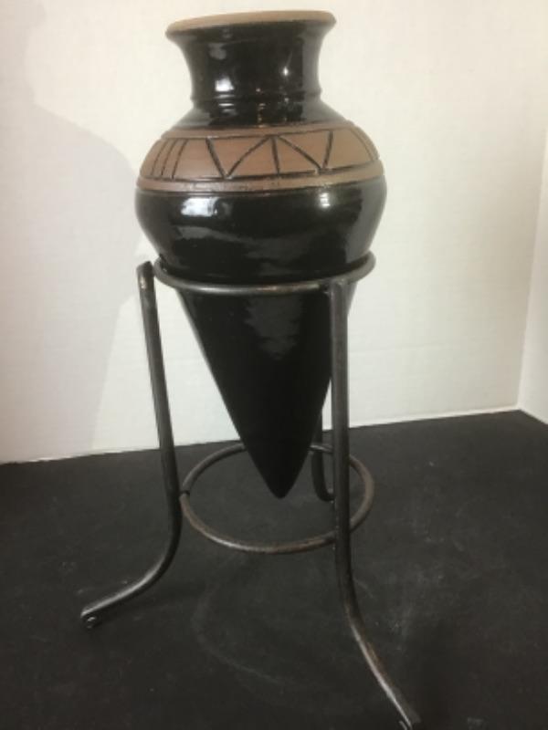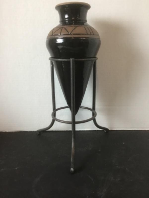 Decorative Pottery Vase on Metal Stand - measures 15.25” Tall on stand x 10” Span on Legs of Stand