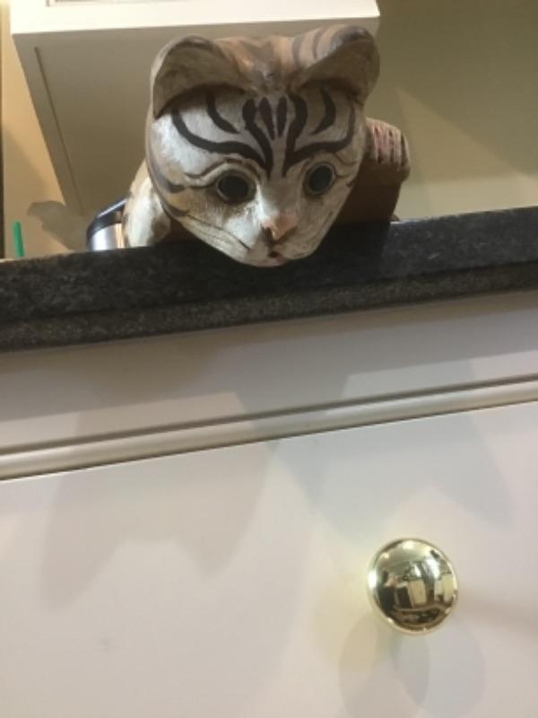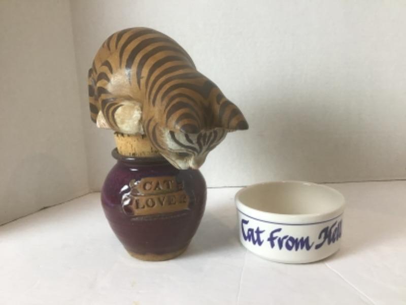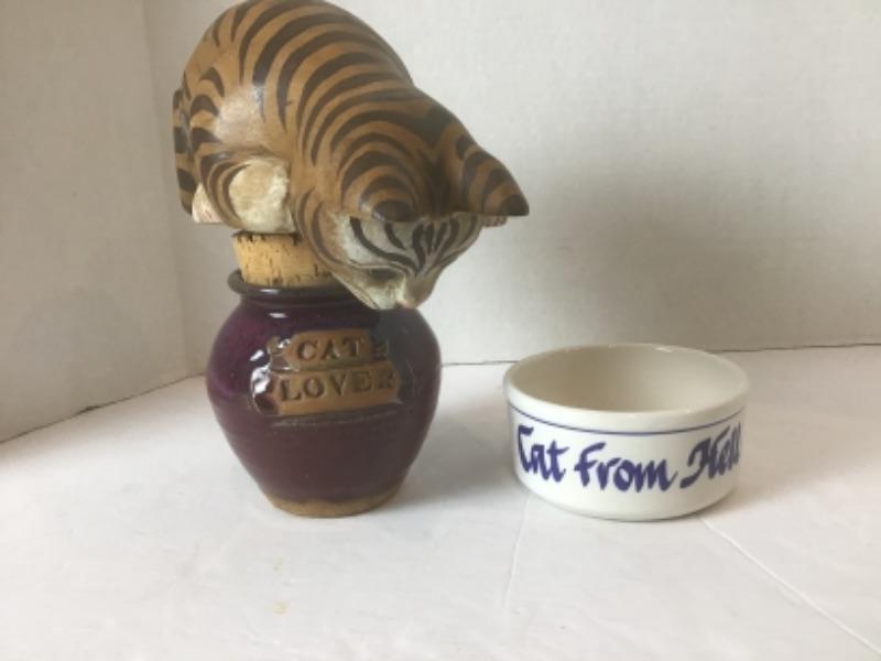 K - 1359. Painted Wooden Decorative Cat / Glazed Pottery Jar / Water Bowl
