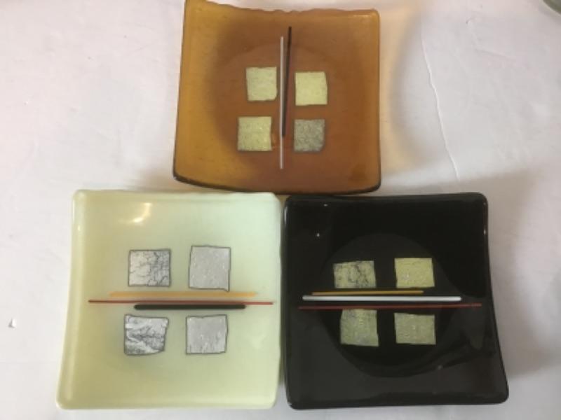 3 Signed Hand Blown Collage Glass Appetizer Plates , Signed by JT - 5.5” Square
