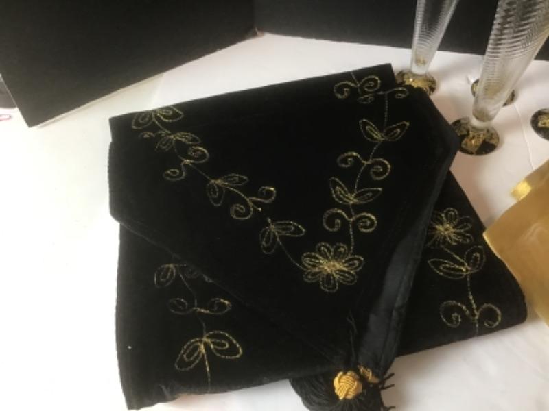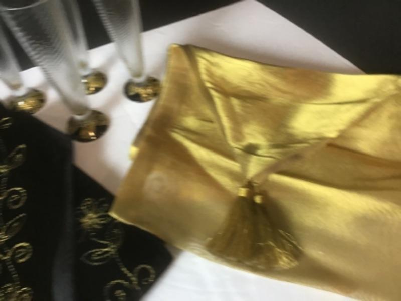 1 Black with Gold Stitching Velvet Table Runner with Tassels - 70” Long