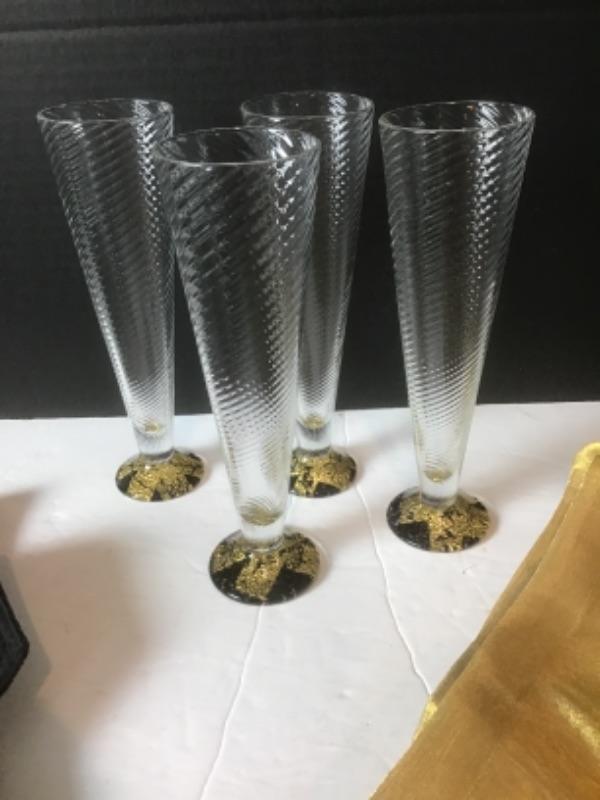 4 Spiraled Champagne Glasses with Gold Flake base - 8” Tall