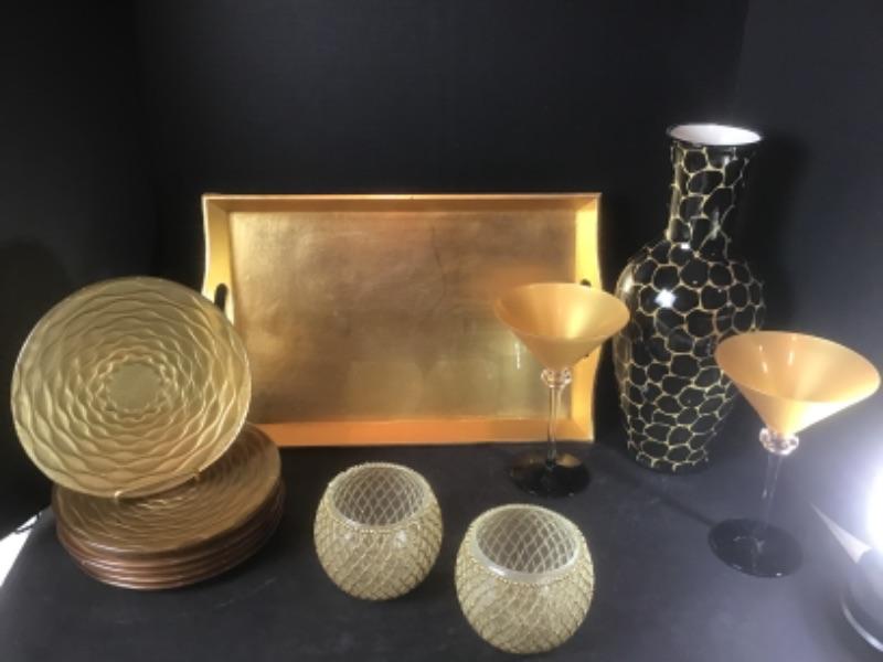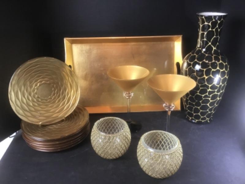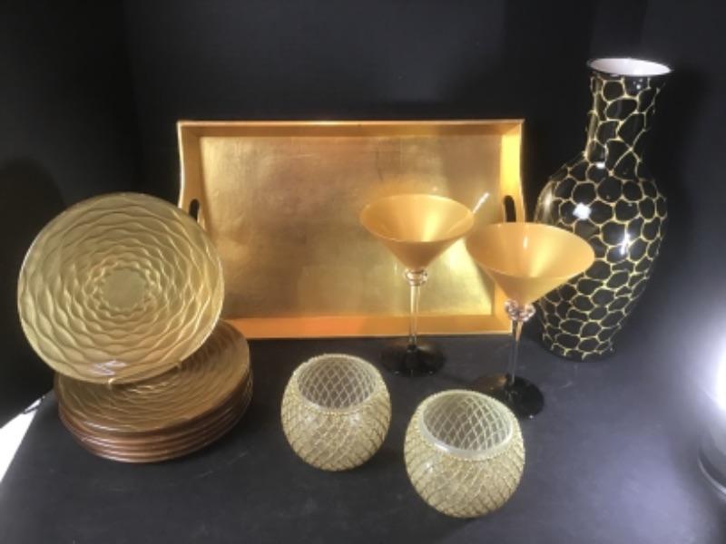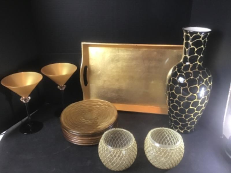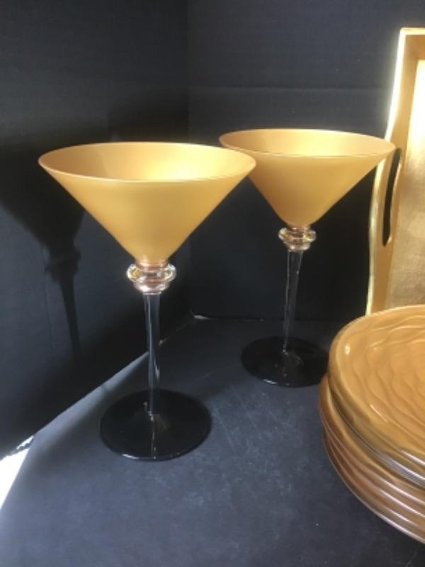 2 Gold & Black Martini Glasses - 7.75” Tall