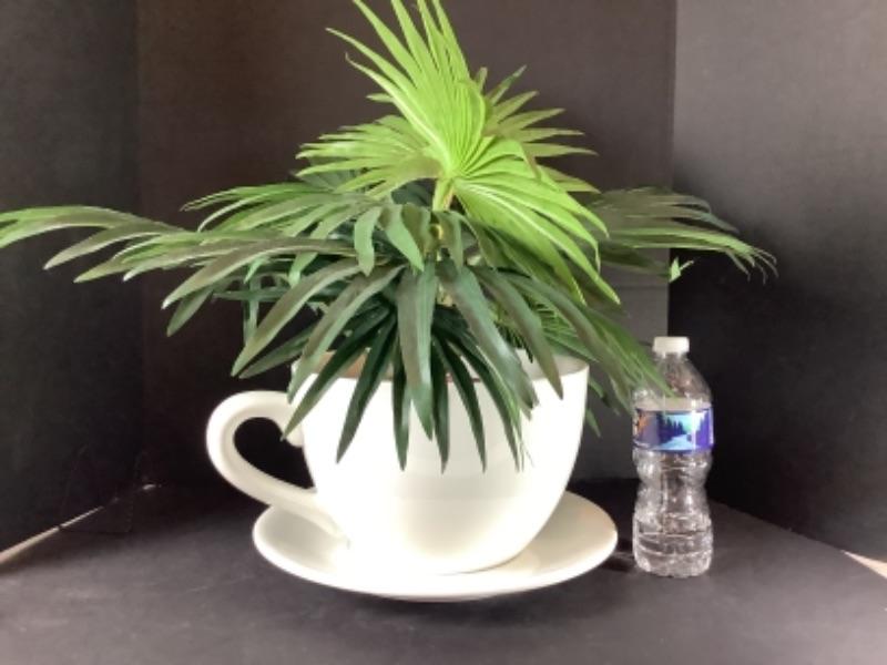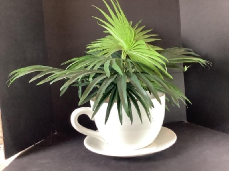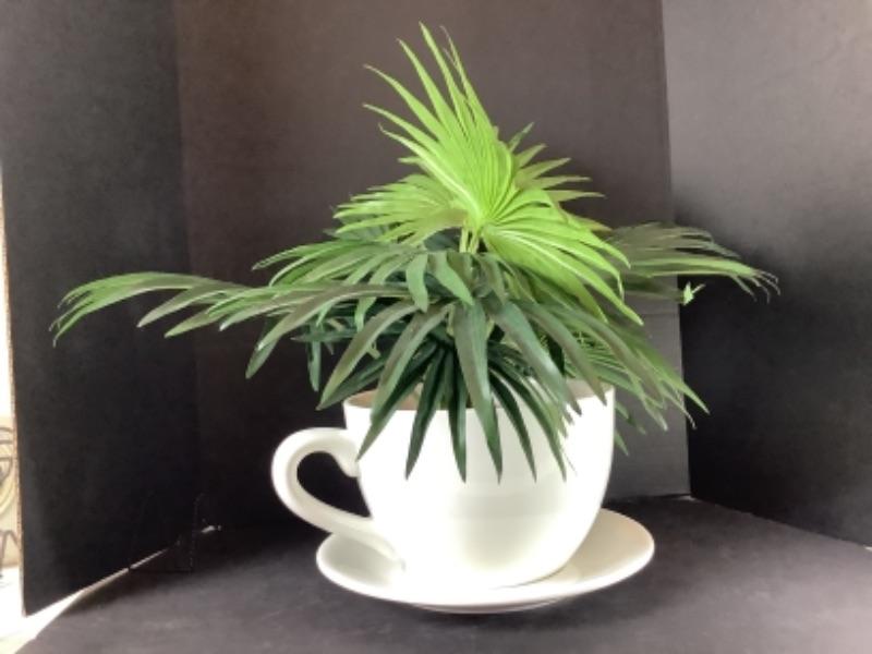 O - 1422  Oversized White Ceramic Coffee Cup & Saucer w/ Faux Plant