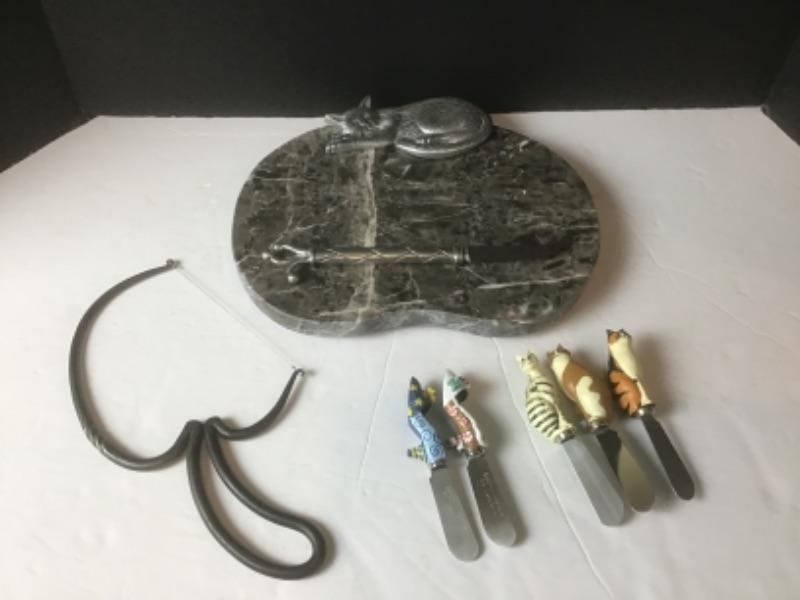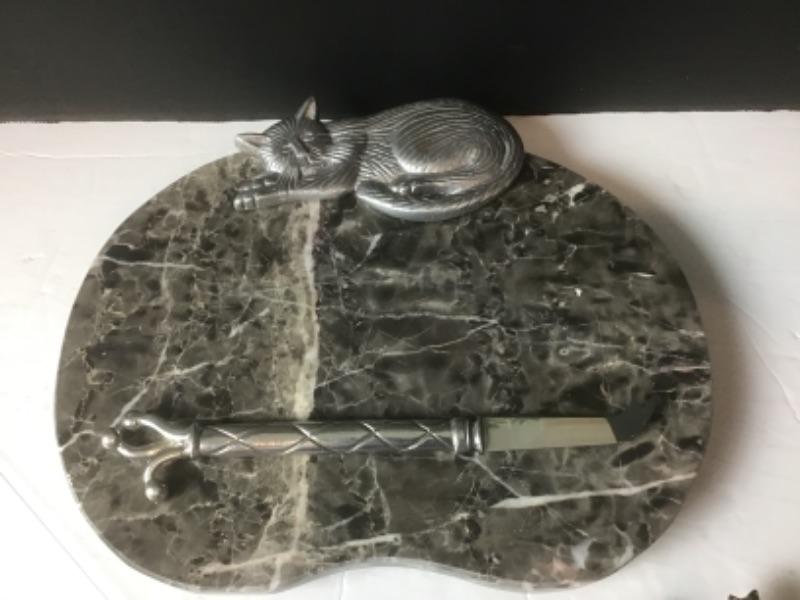 K - 1436 Marble “ Cat “ Cheese Board/Bodemod& Sheffield Pewter Knife/ Spreaders