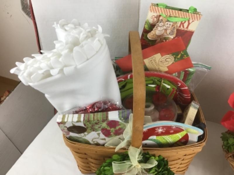 1 ) This basket is in a Longaberger Basket with 1 handle, includes - paper products, Christmas Oven Mitts, Candles, Tea Towels, Gift bags, Glass Plate, & Large White Fleece