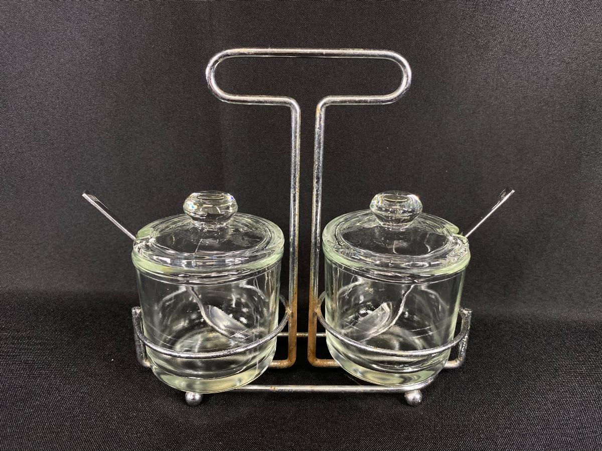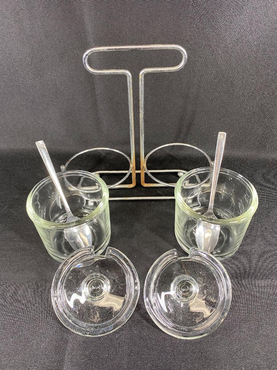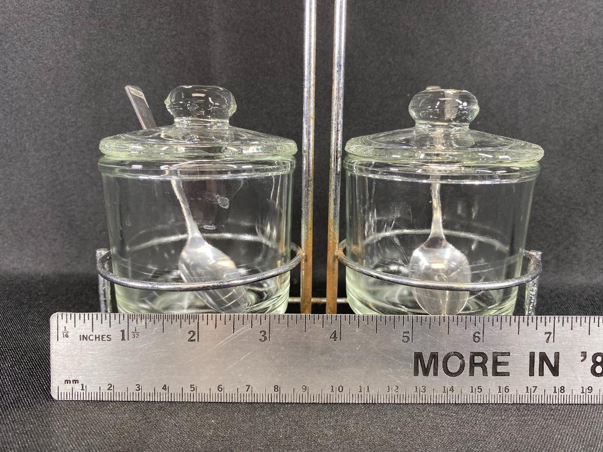 Retro vintage jelly/jam caddy with two jars. Lidded jars with spoons. Caddy has some rust at the bottom, may come clean with a Scotch Brite. Jars are in good condition.