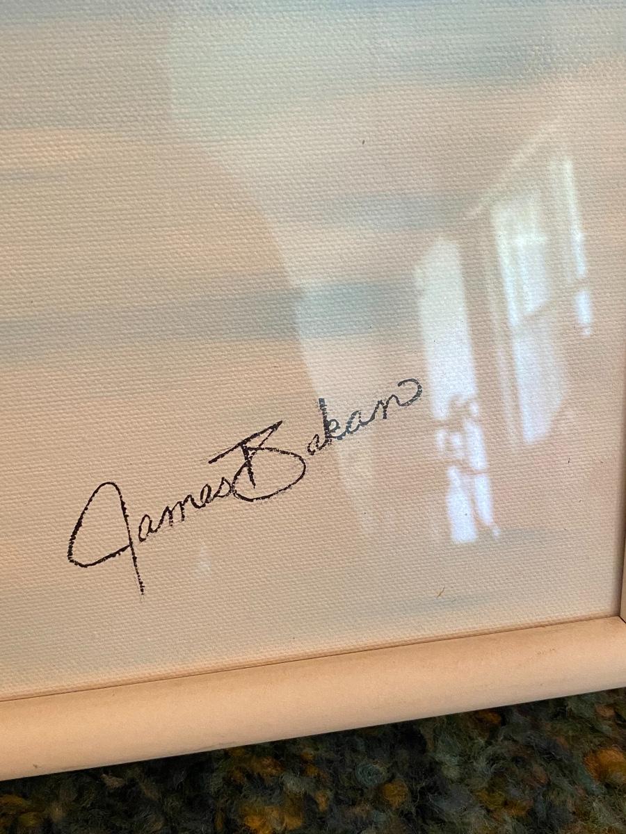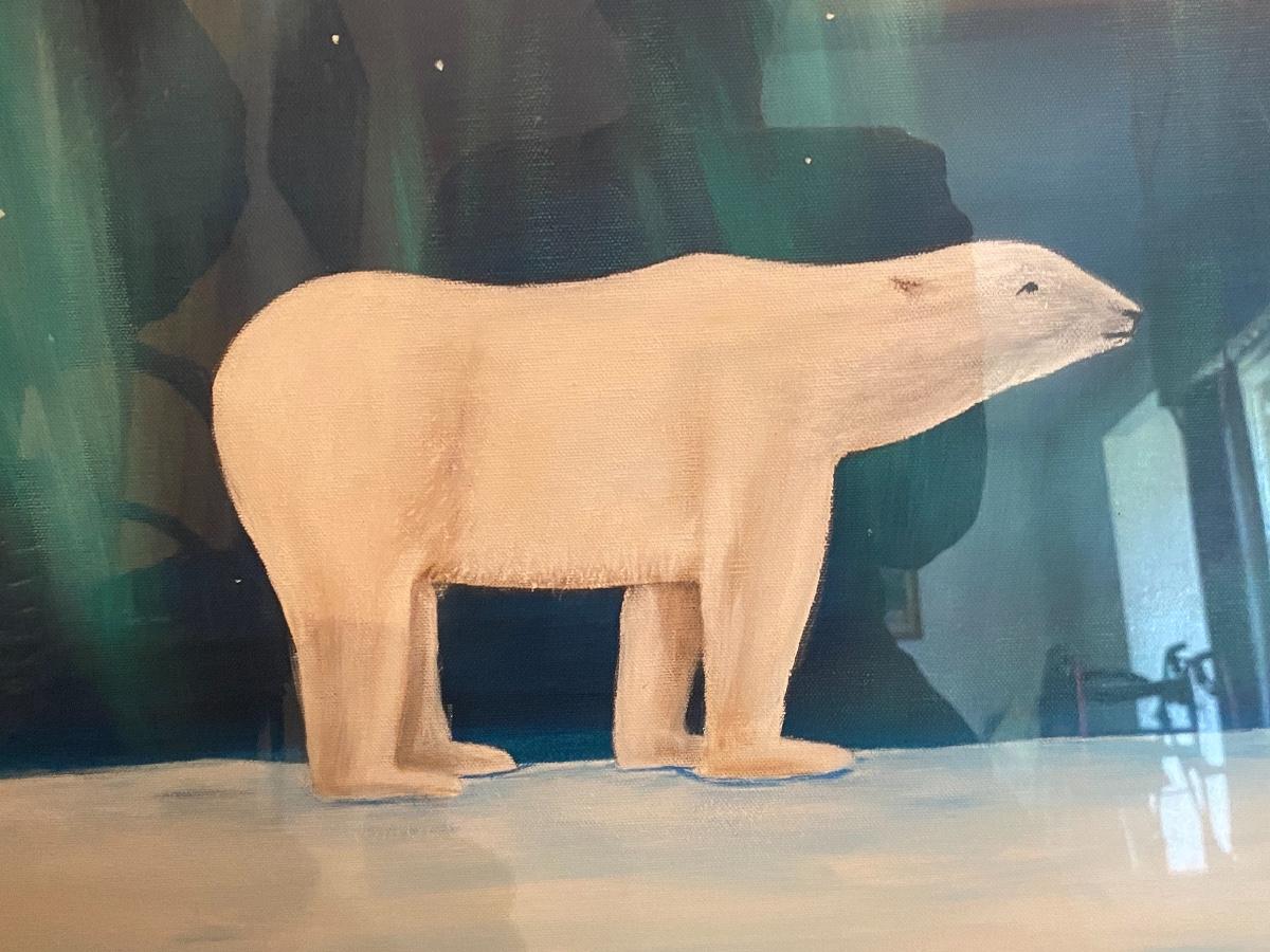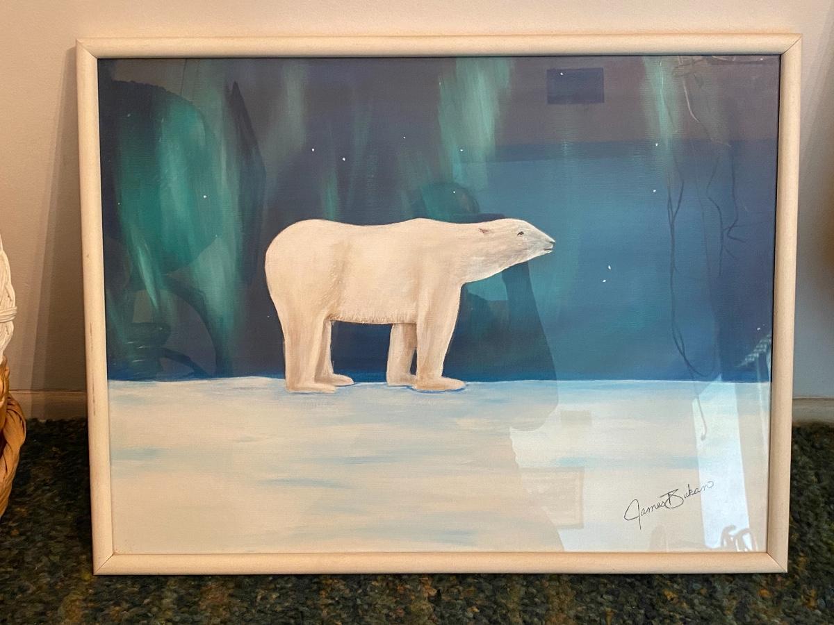 Framed polar bear painting. Signed in lower right corner by James Bakan. Measures about 25"x19.5".
