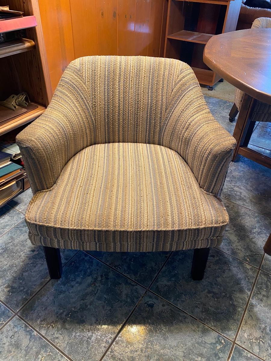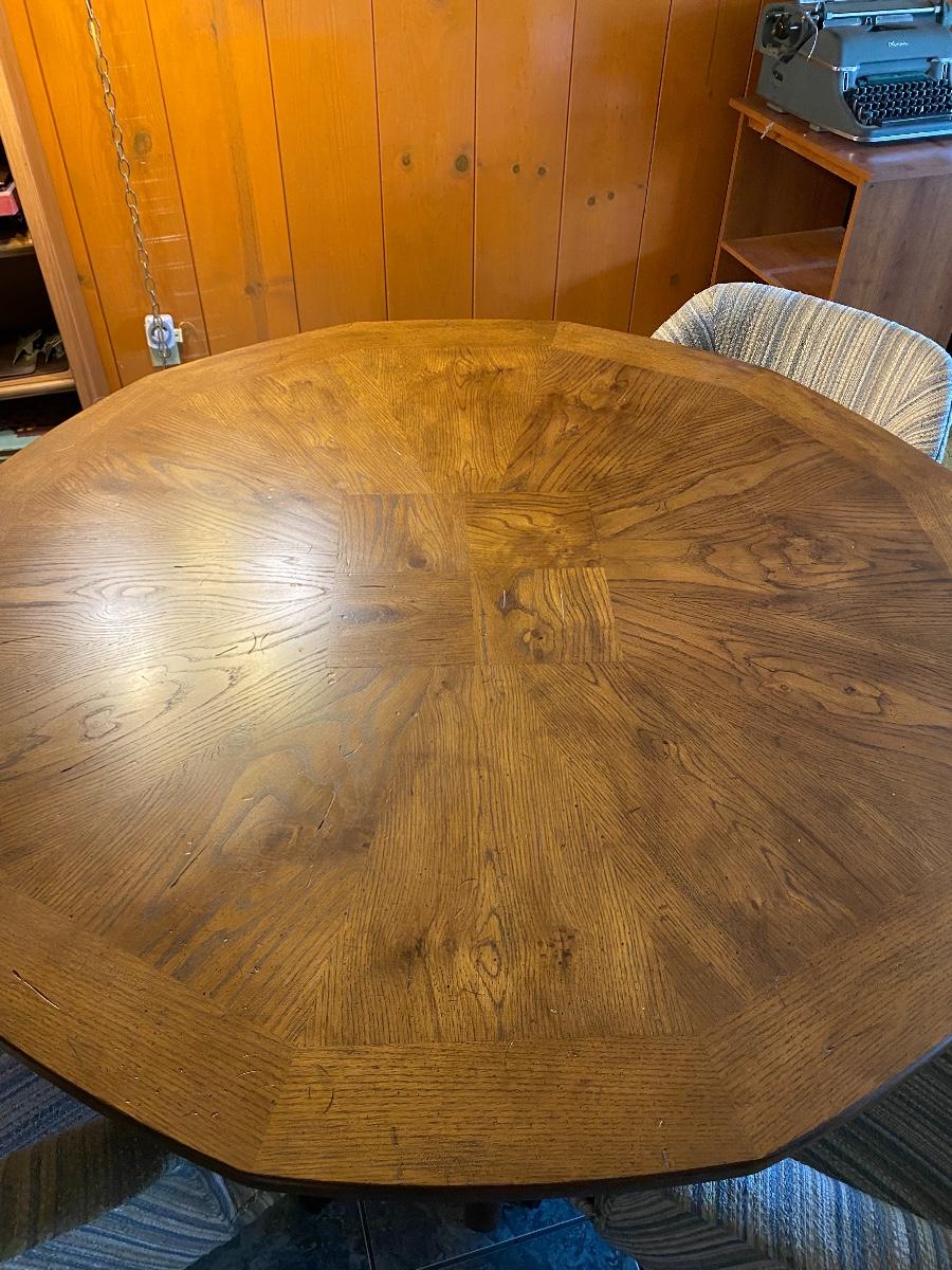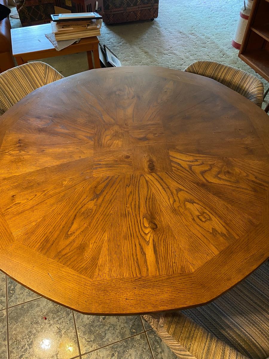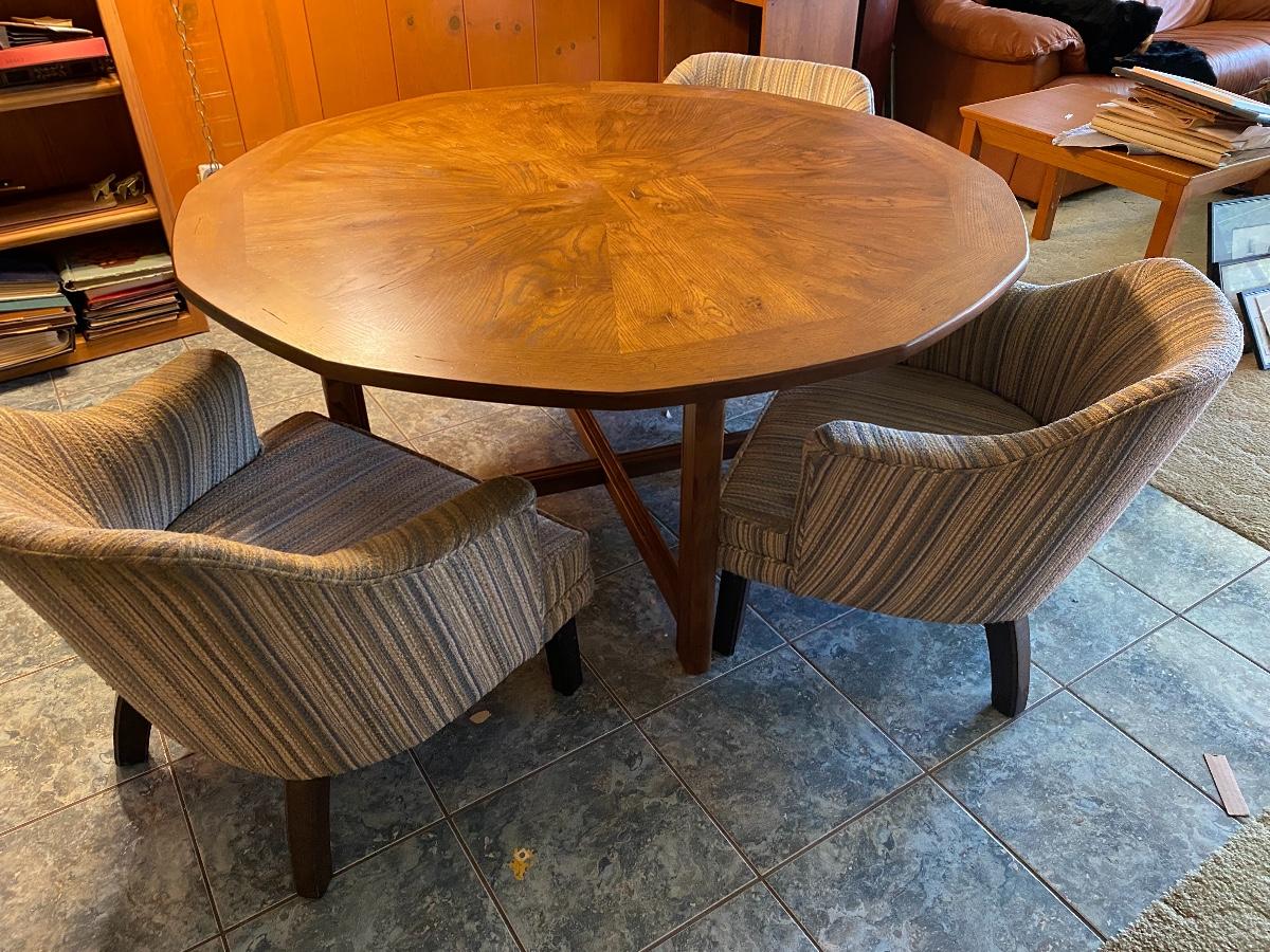 Low sitting vintage dining table and chairs. Only has the three barrel style chairs. Solid table top. Table is actually 12 sided. Good condition. Table is 27" high and 53" wide. One chair is on wheels. No major spots, stains, or wear noticed on chairs.