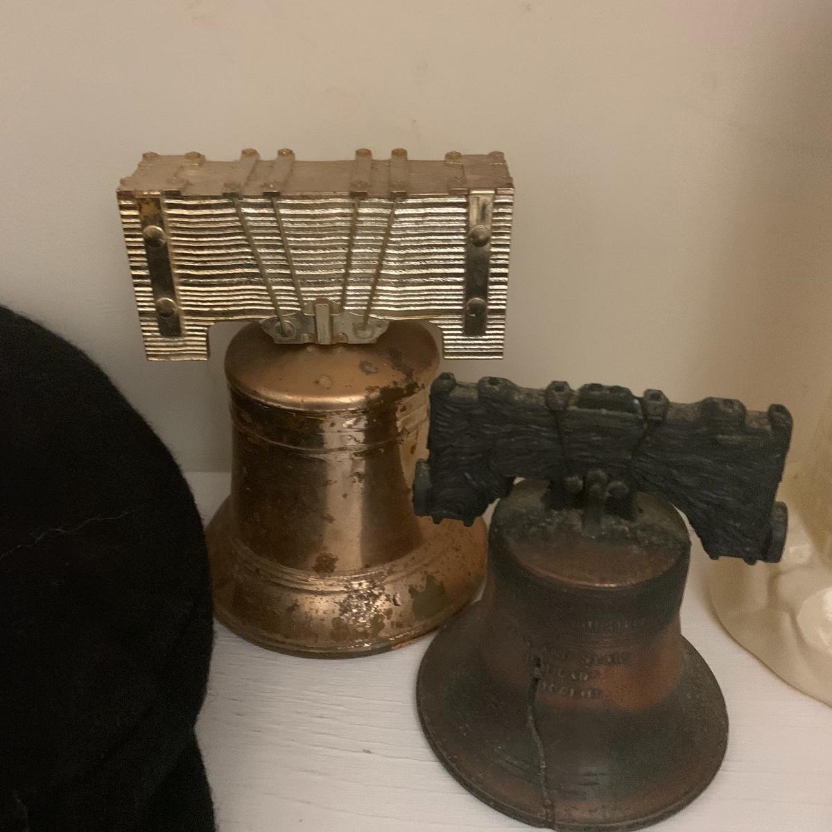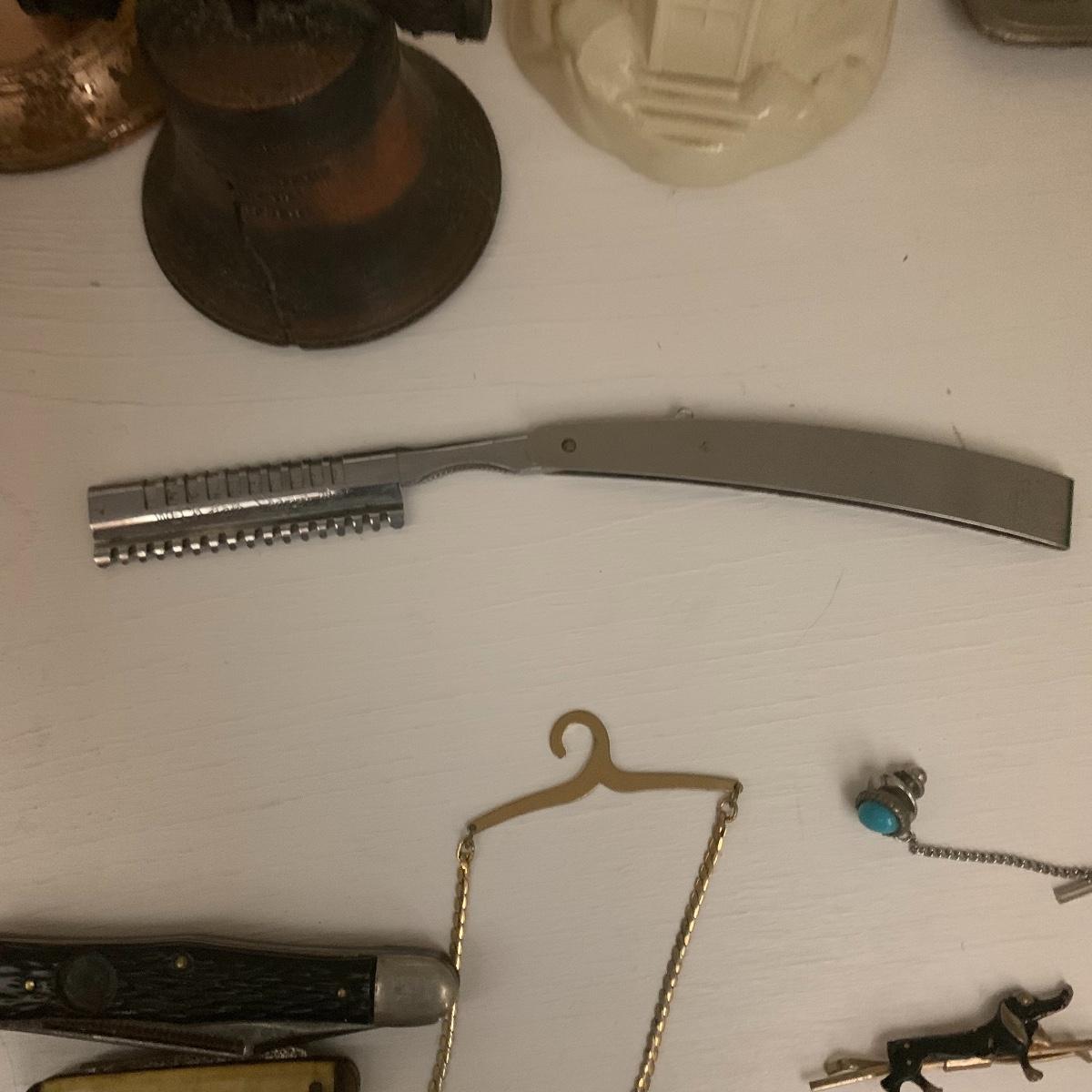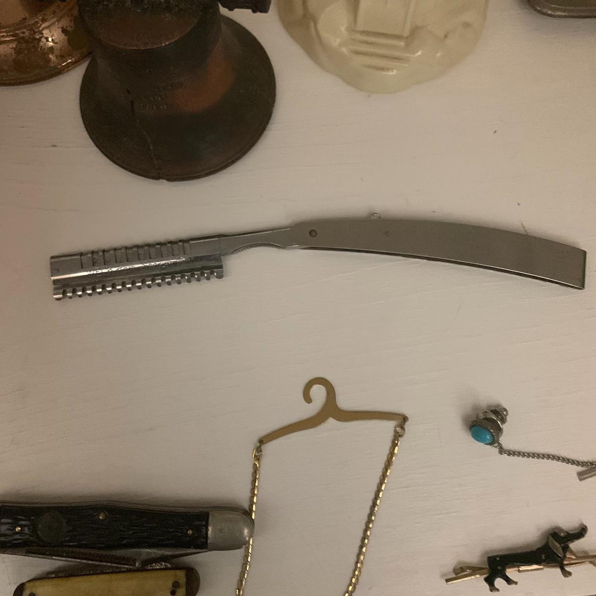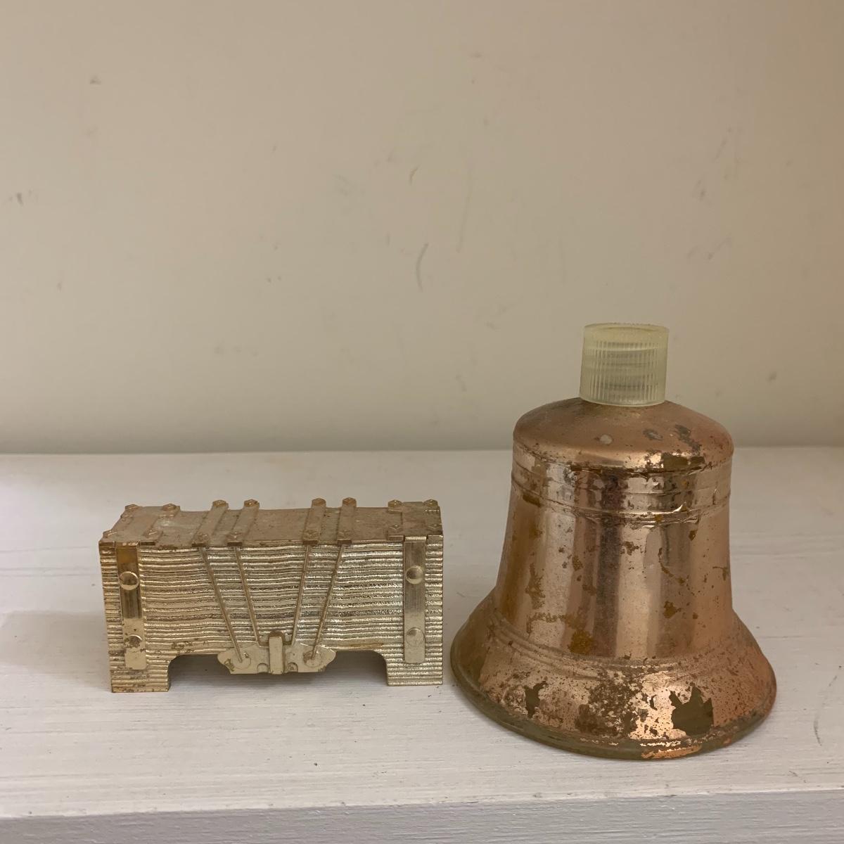 This is such a cool vintage lot! This includes a glass fish shaped bottle that measures 10”, two bottles of vintage cologne, three small vintage bottles, two pocket knifes, two belt buckles, three cuff links, a vintage folding comb, and a wood and ivory shoe horn that measures 21”. One of the bells is a heavy metal bell with a “crack” that is part of the design. The other bell is painted glass with a plastic handle, and os actually a cologne bottle with cologne in it. Shipping Available.